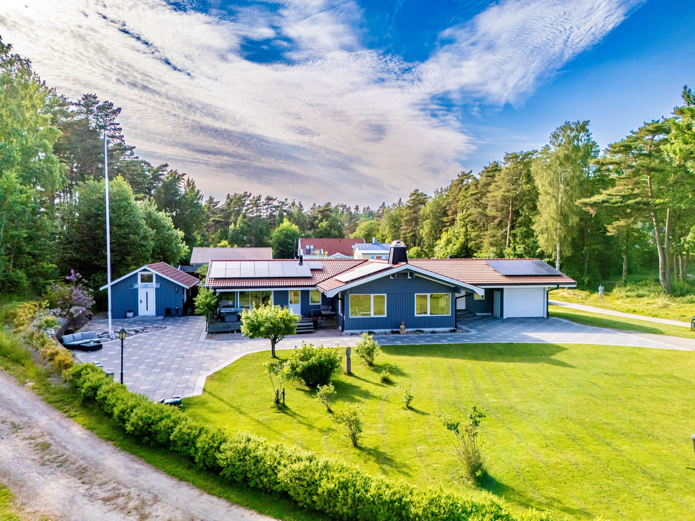 Fastigheten är omsorgsfullt planerad med generösa sällskapsytor, flera uteplatser och uterum – perfekt för sociala tillställningar eller avkoppling i solen. Bostaden omges av vacker natur och en plan tomt som gränsar till strandlinjen. Lägg till solceller på taket, garage, carport och genomgående smakfulla materialval – ett hem redo att bara flytta in i!