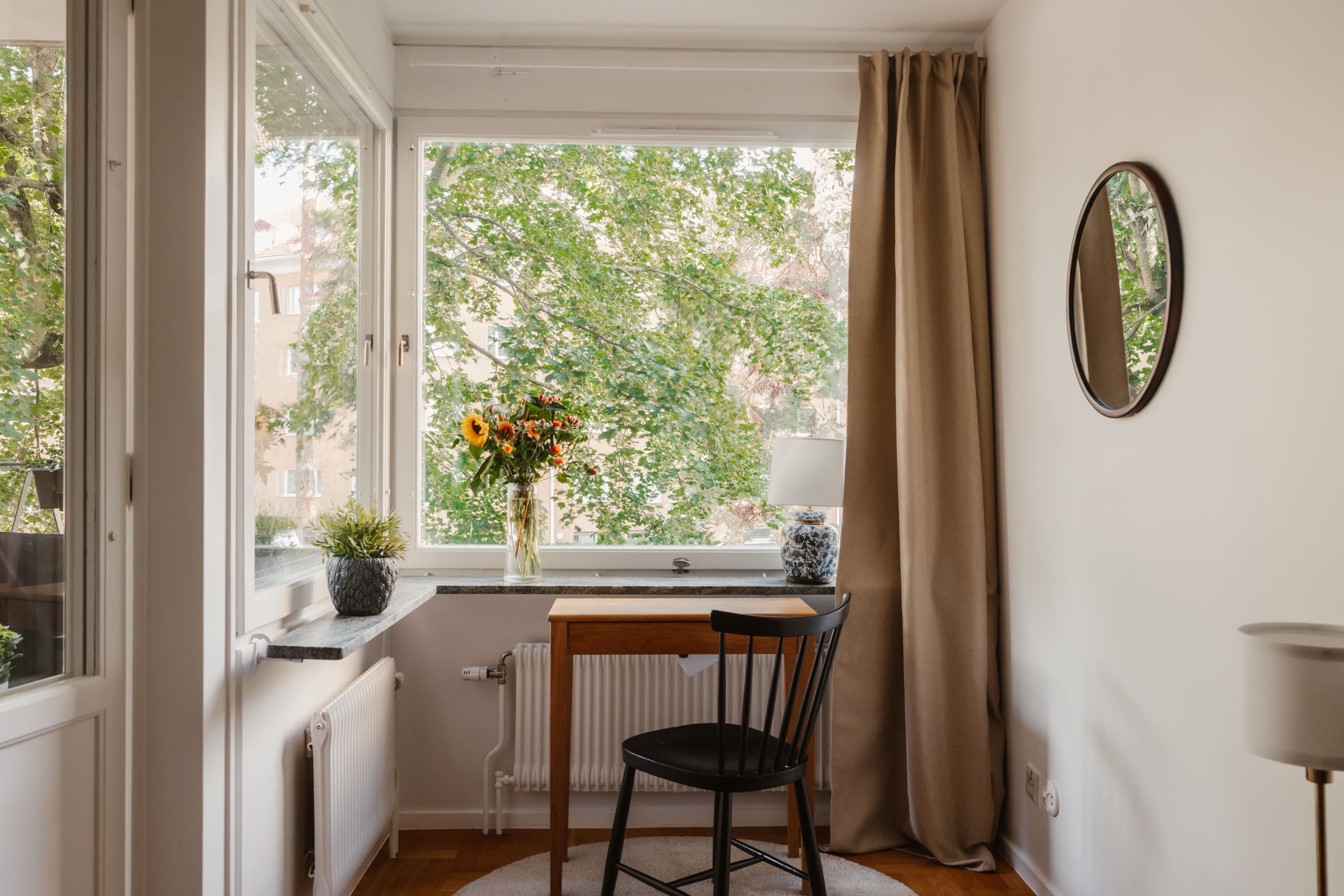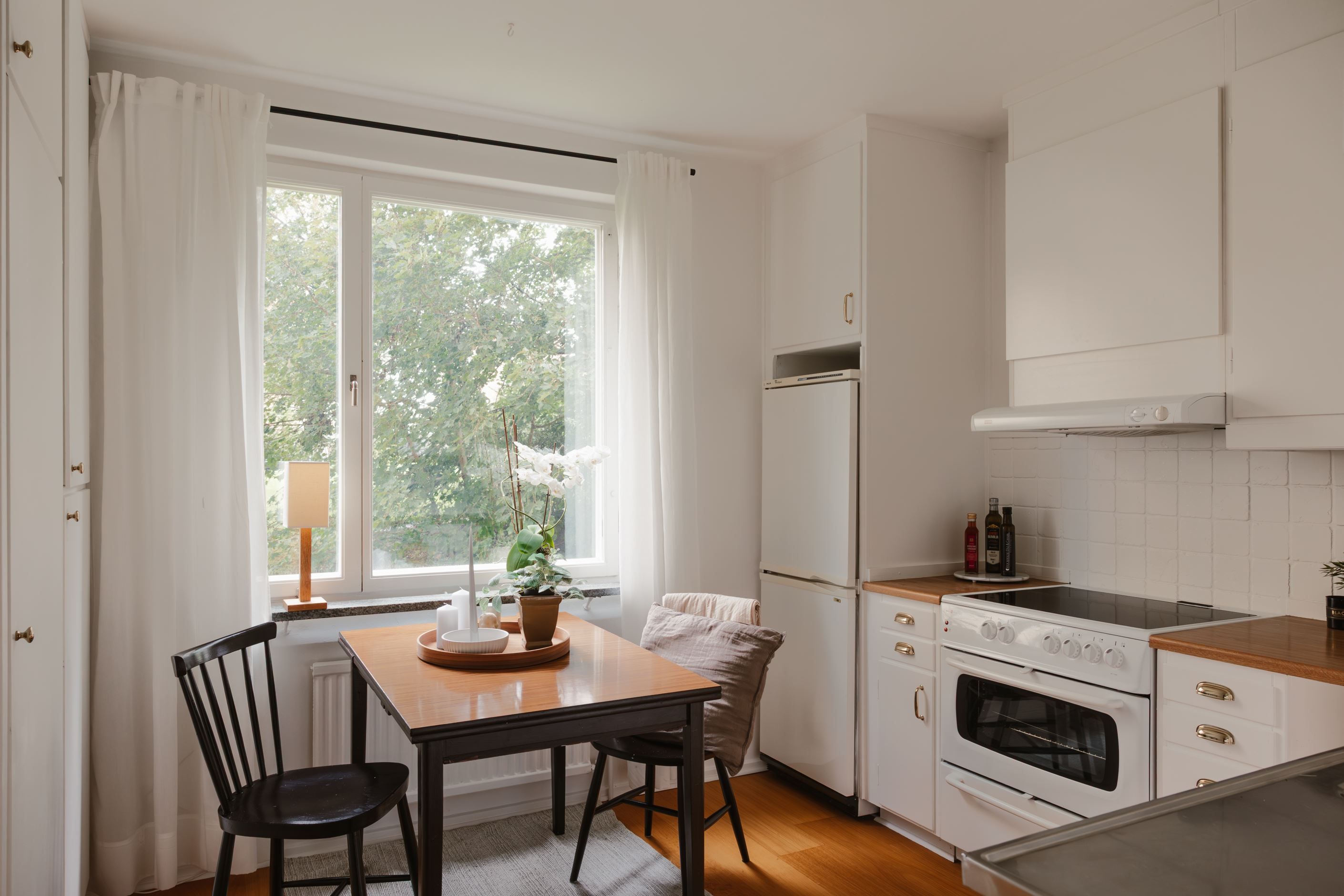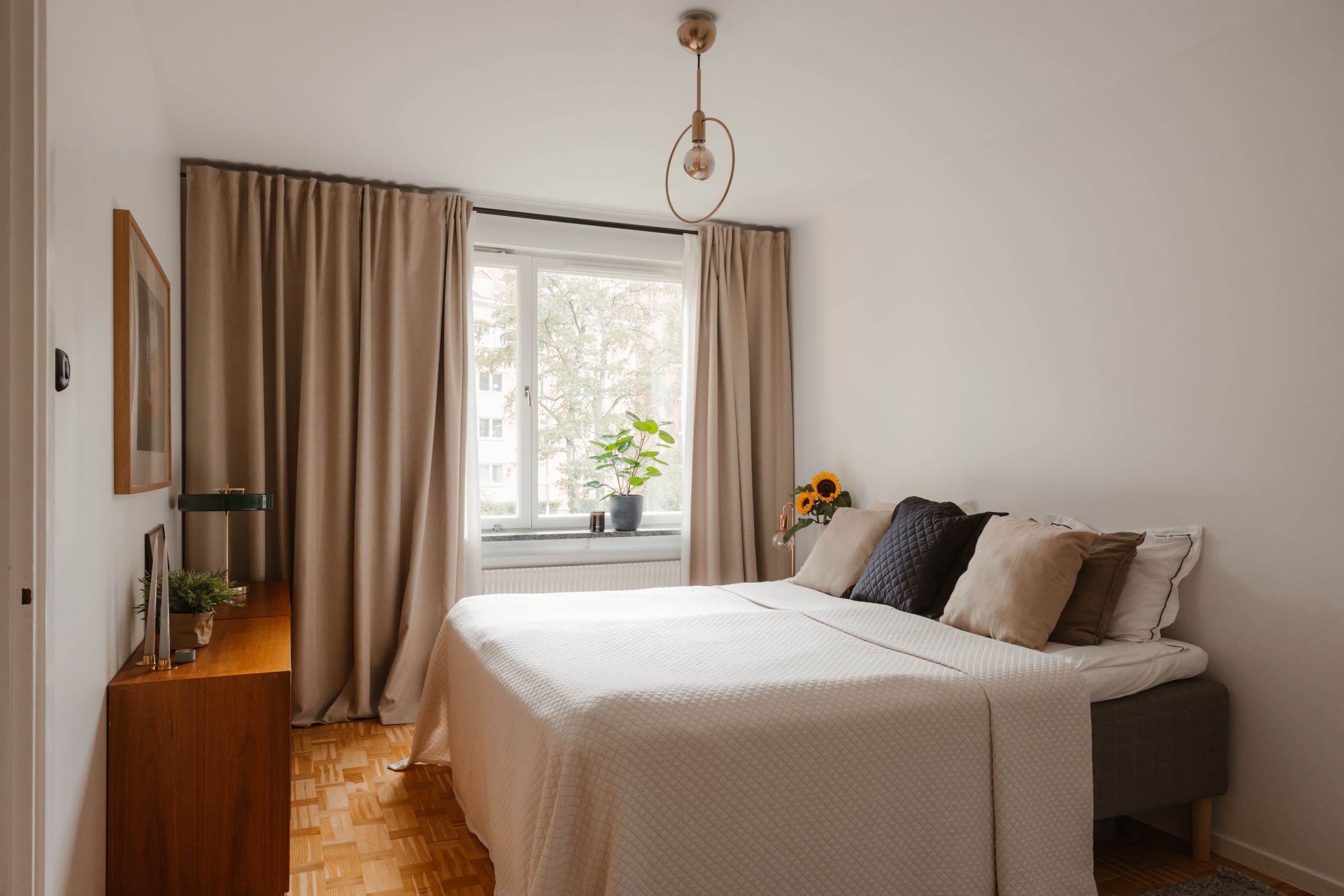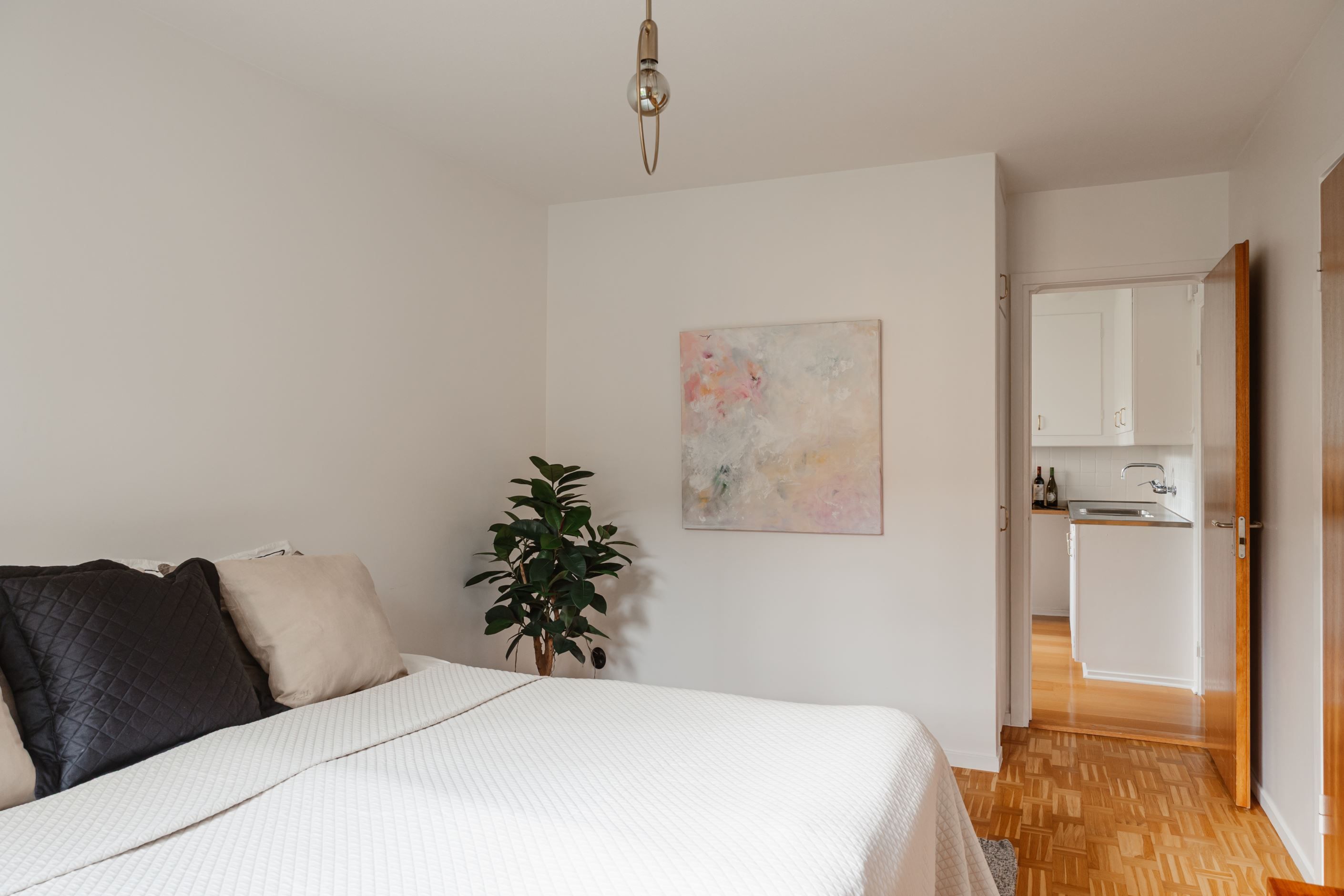 Det trivsamma köket har plats för matbord och skapar en inbjudande miljö för både vardag och middagar med vänner. Det rymliga sovrummet är lugnt beläget och rymmer både dubbelsäng och förvaring i garderob. Utöver detta finns en stor klädkammare, vilket ger mycket goda förvaringsmöjligheter.