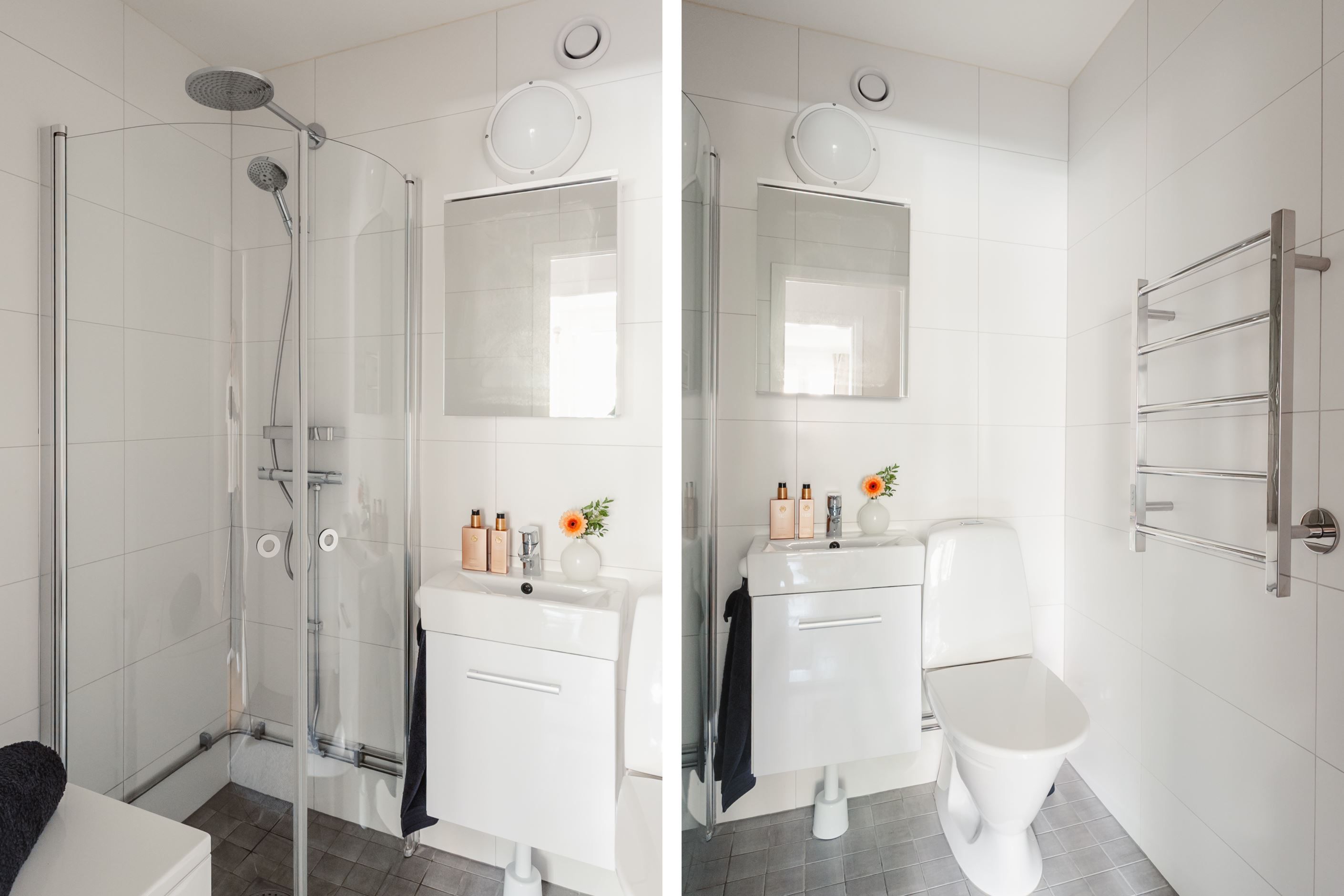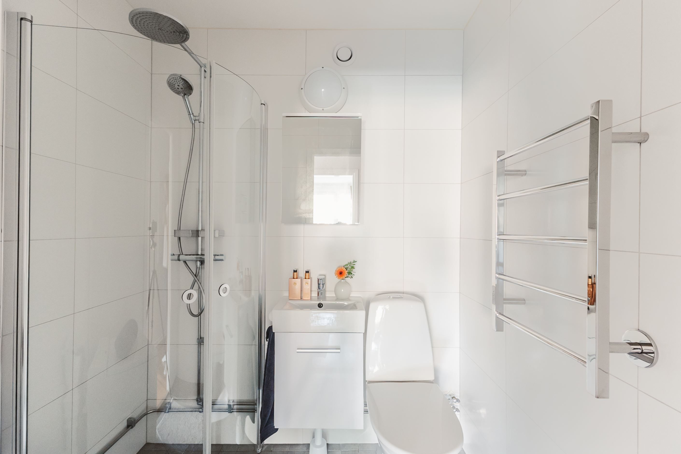 Det helkaklade badrummet är fräscht och funktionellt, utrustat med wc, dusch, handfat samt tvättmaskin för extra bekvämlighet.
