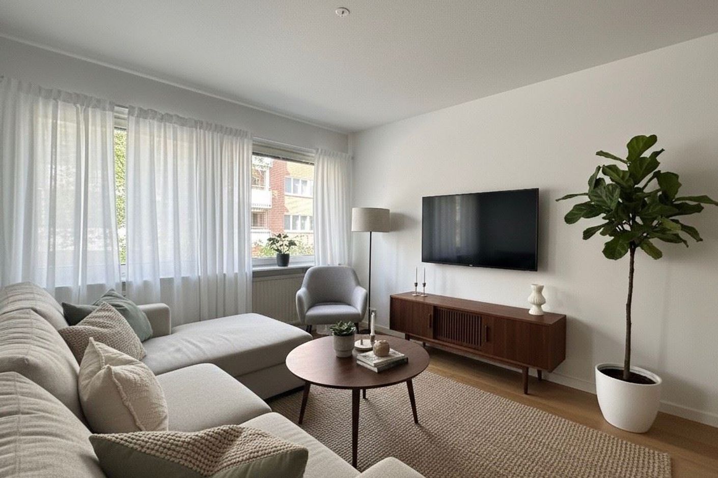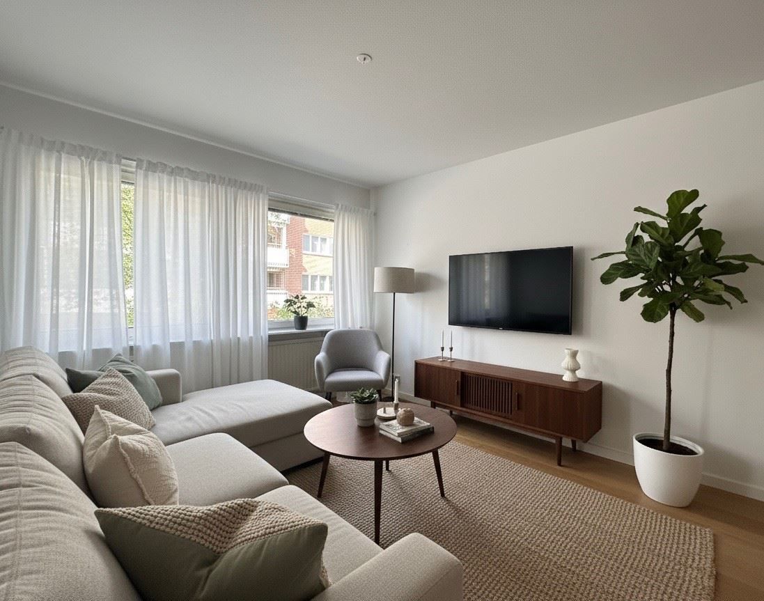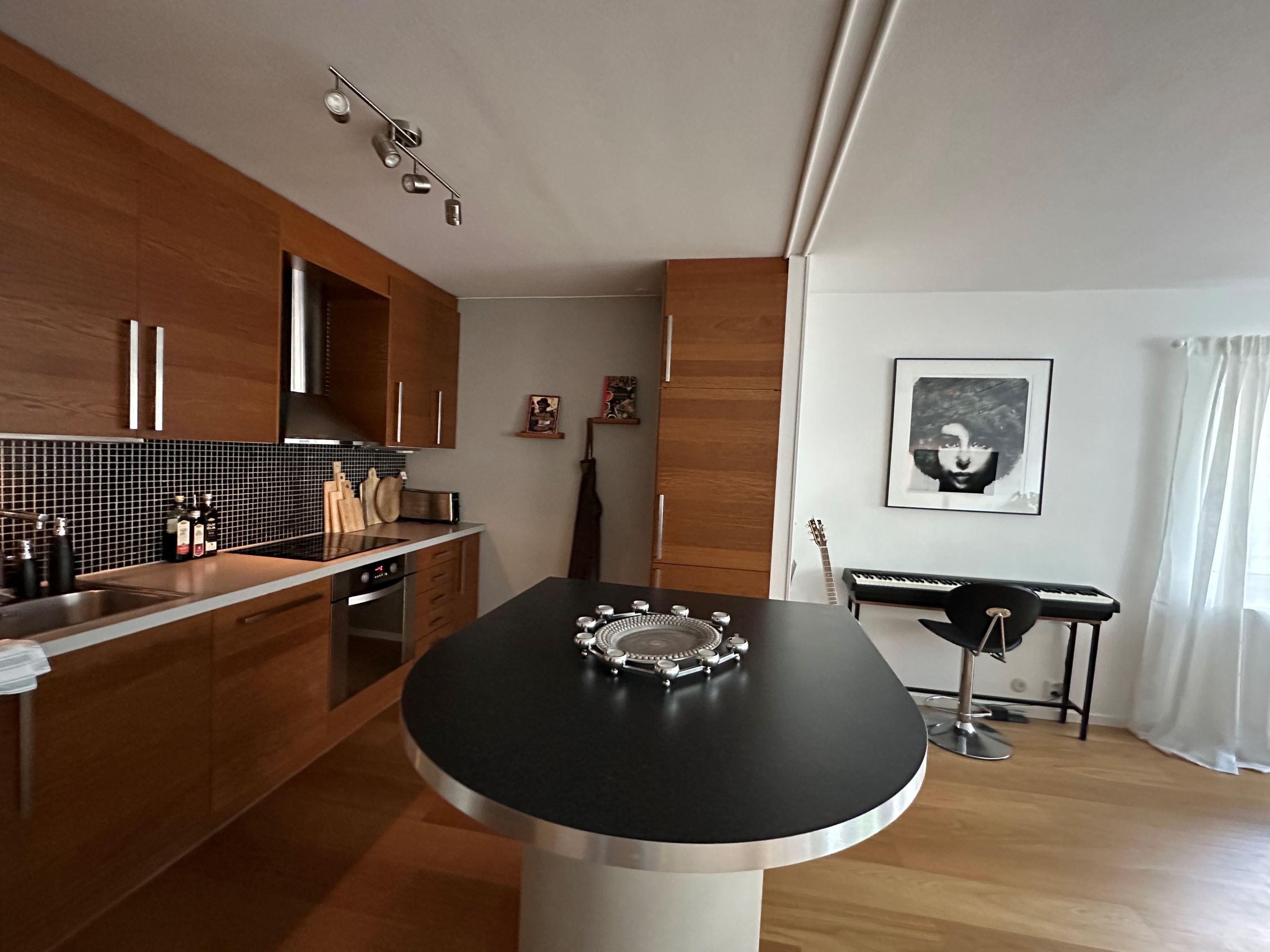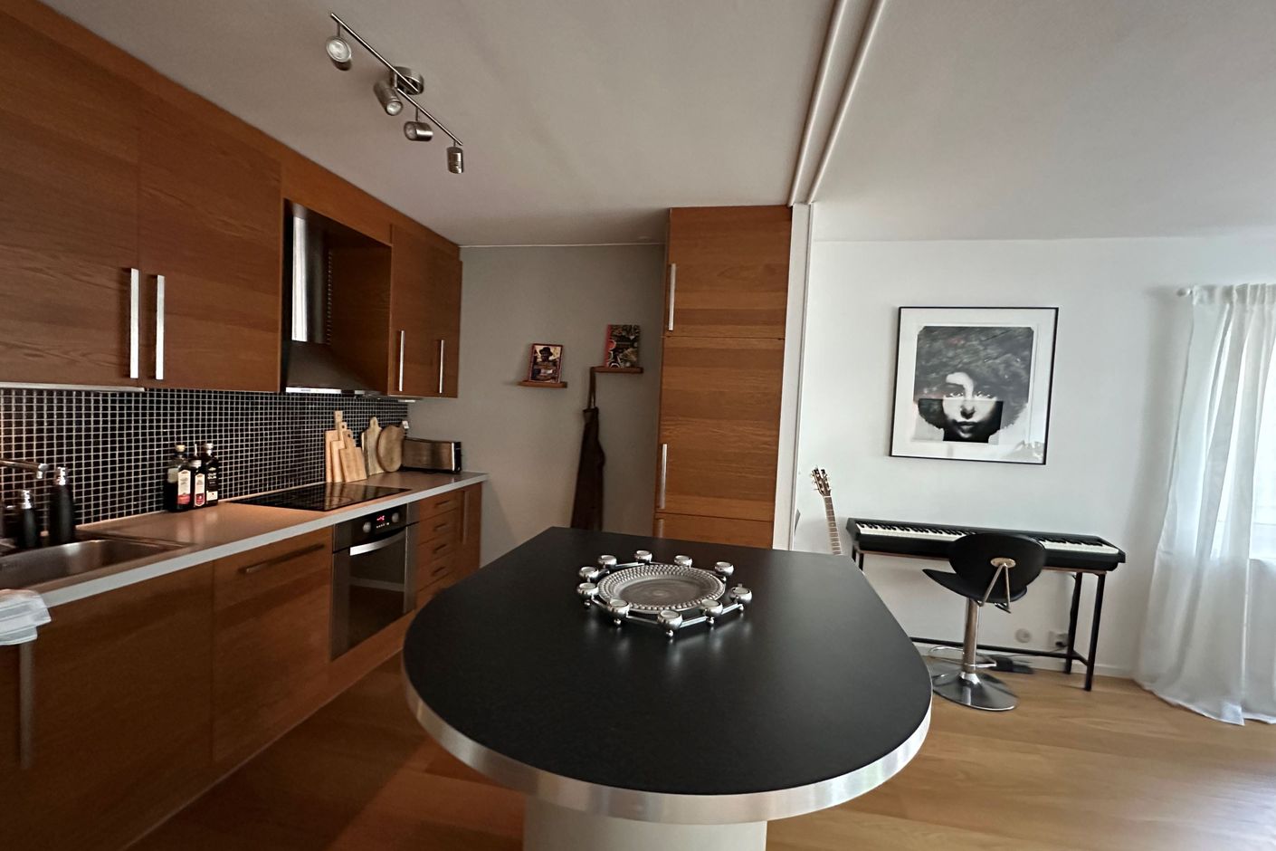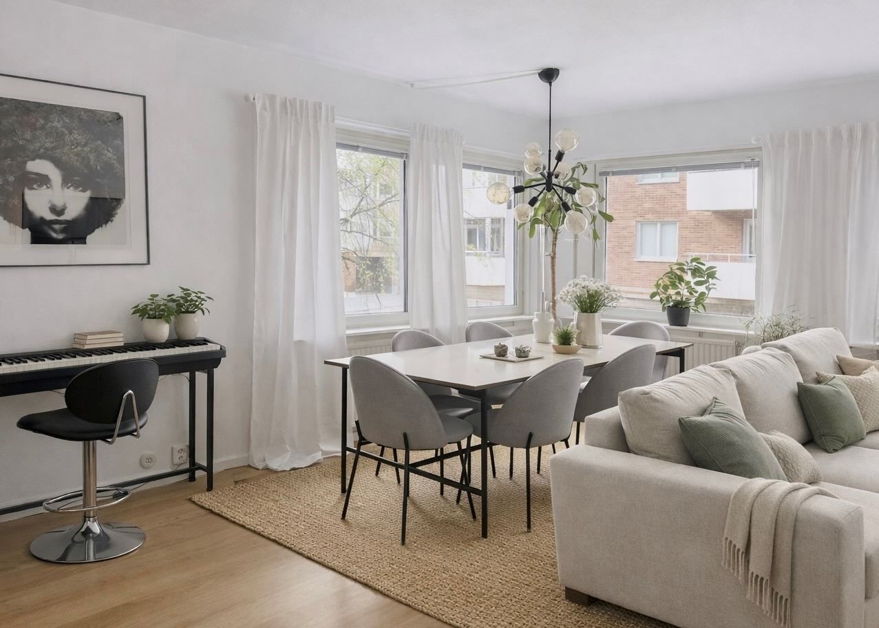 Välkommen till denna fantastiskt belägna tvåa, där modern design möter funktionella lösningar. Den öppna planlösningen mellan kök och vardagsrum skapar en inbjudande atmosfär med känsla av rymd och ljus, tack vare fönster i tre väderstreck. Köket, med en stilfull köksö, erbjuder gott om arbetsyta och plats för matlagning och umgänge. I vardagsrummet finns det utrymme för ett stort matbord, vilket gör det perfekt för sociala tillställningar.