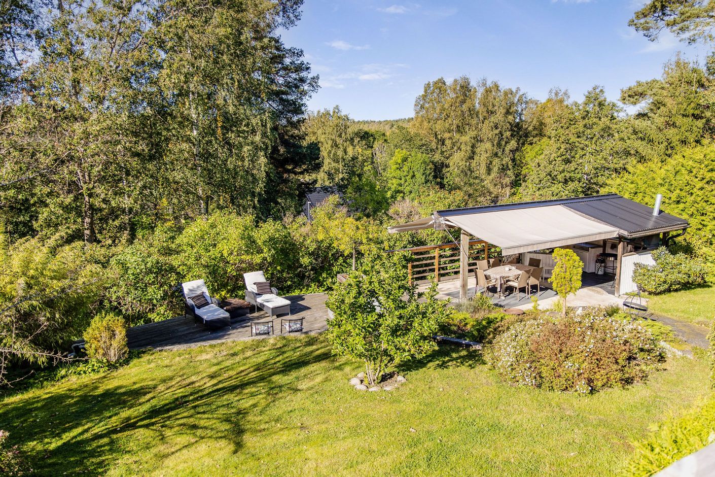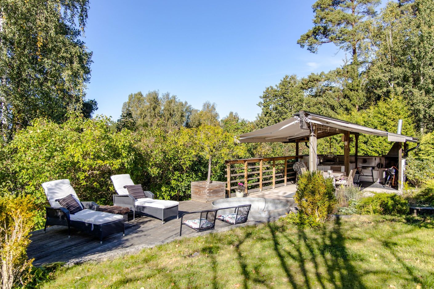 Tomten är en grönskande oas med fina planteringar, plana gräsytor och flera uteplatser. Det friliggande uteköket med angränsande terrass bjuder in till långa sommarkvällar, medan den stora altanen i anslutning till det inglasade uterummet förlänger säsongen rejält. Tomtens baksida gränsar dessutom till allmänning, vilket skapar en privat och rofylld miljö.