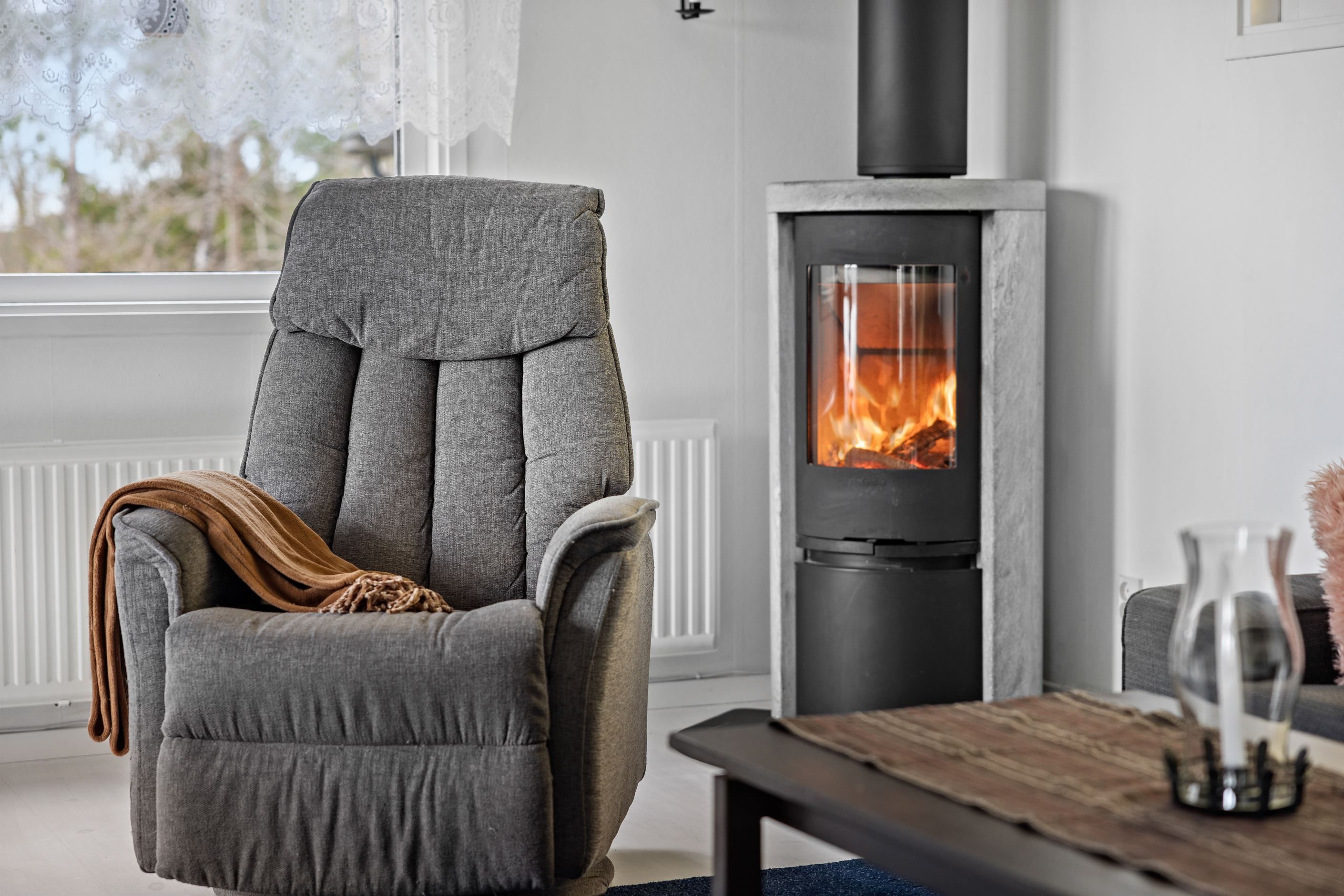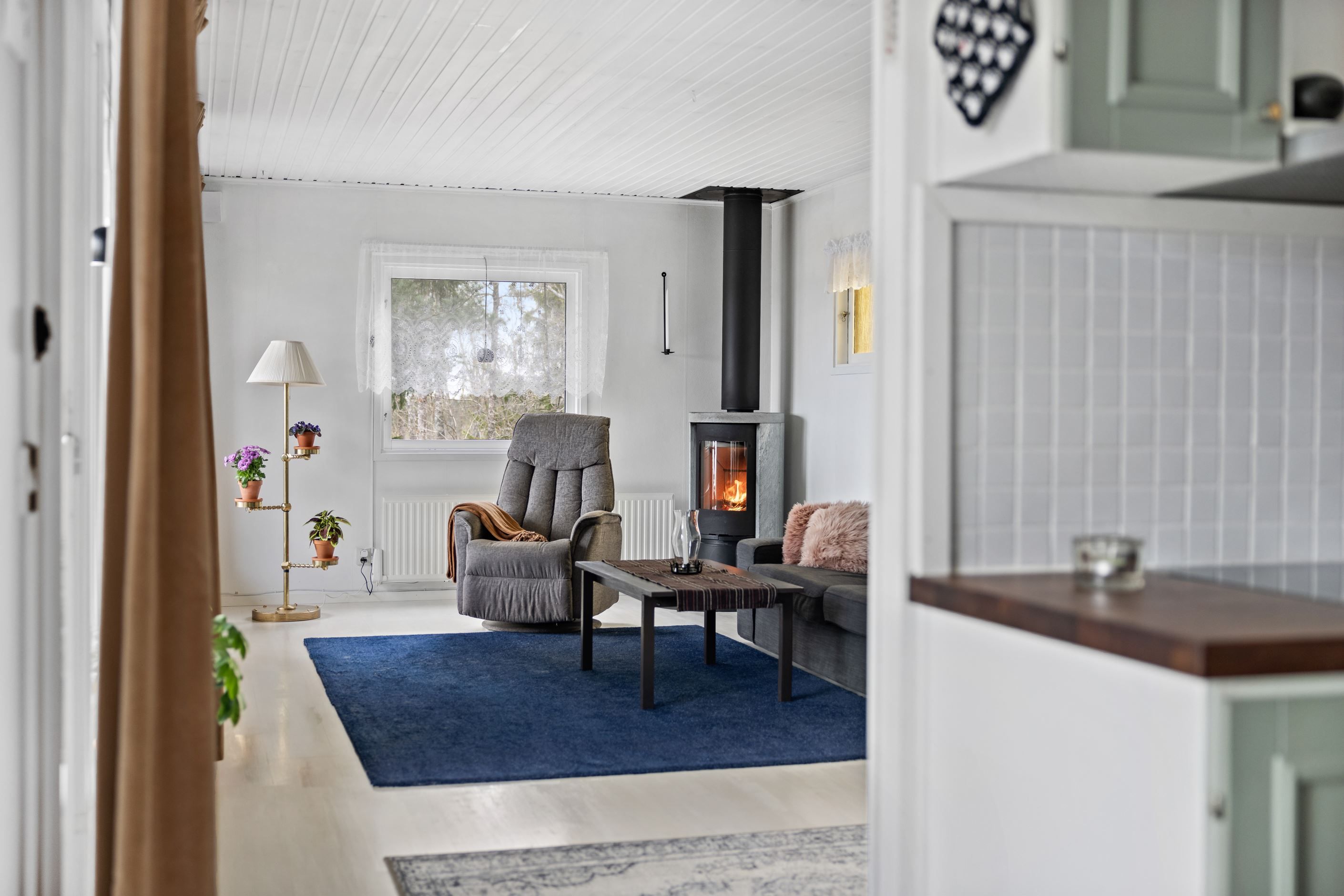 Inomhus väntar en trevlig bostad med 3 rum där eldstaden blir en självklar samlingspunkt under kyligare dagar och skapar stämning året runt. Här kombineras modern utrustning och löpande renoveringar med hemtrevlig känsla.