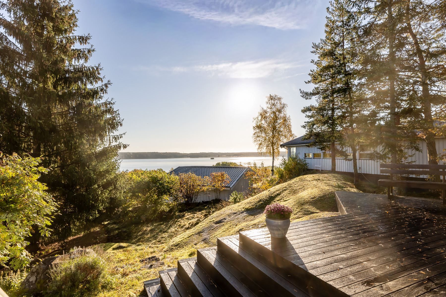 Den generösa tomten om 1 097 kvm bjuder på en inbjudande trädgård och en härlig uteplats med många soltimmar – perfekt för långa sommarkvällar, middagar utomhus och avkoppling i lugn miljö. Från både hus och tomt njuter du av sjöutsikt samt det rogivande läget nära vattnet.