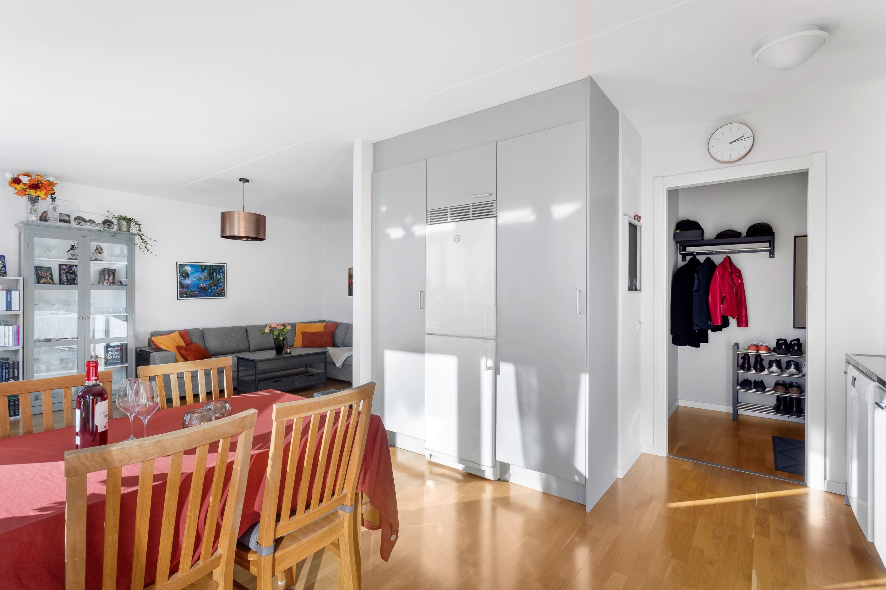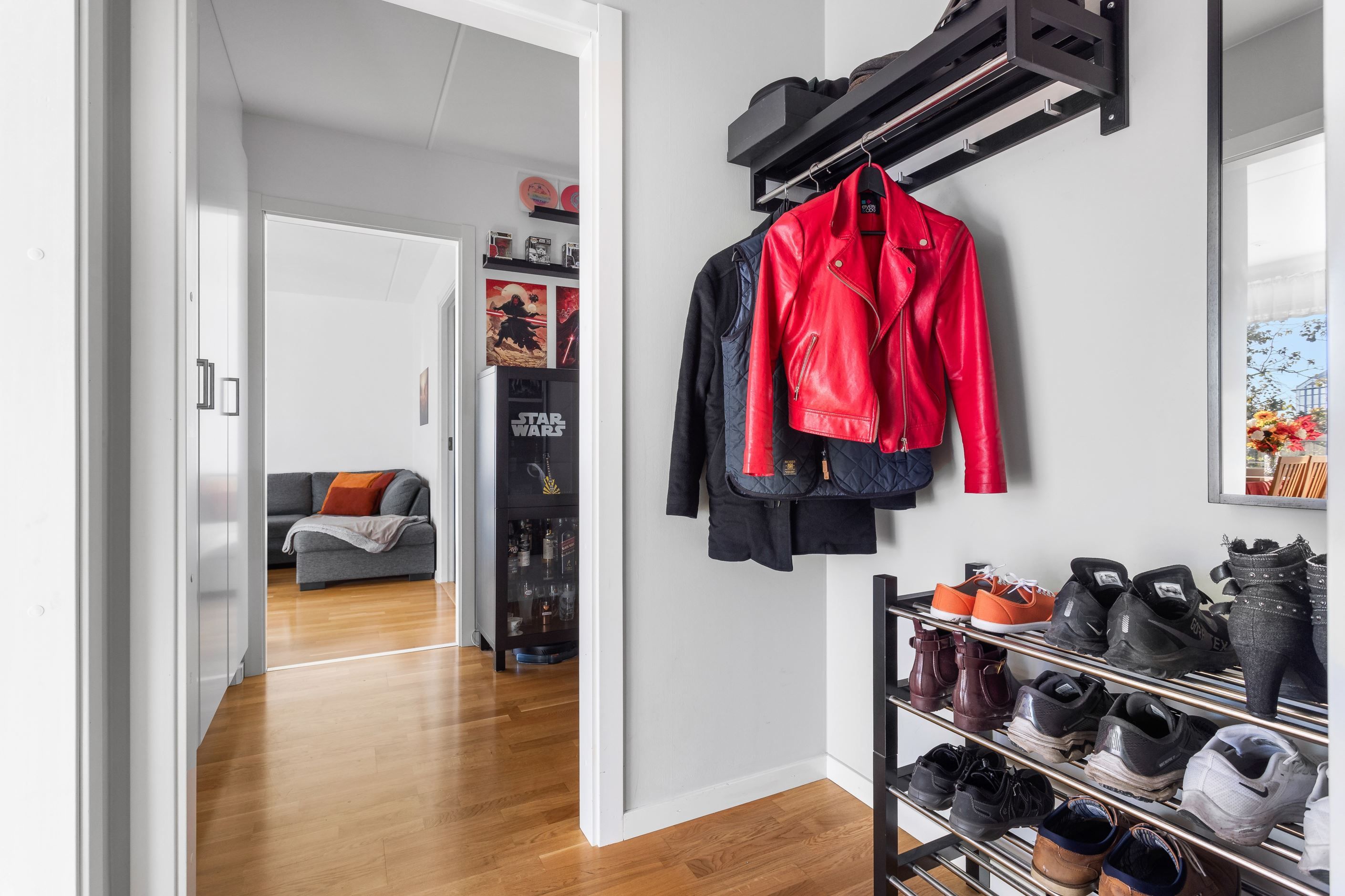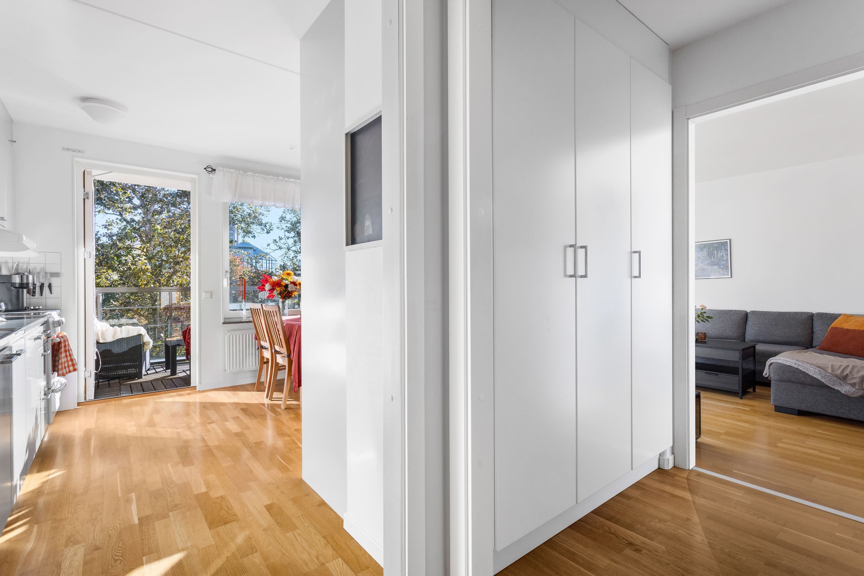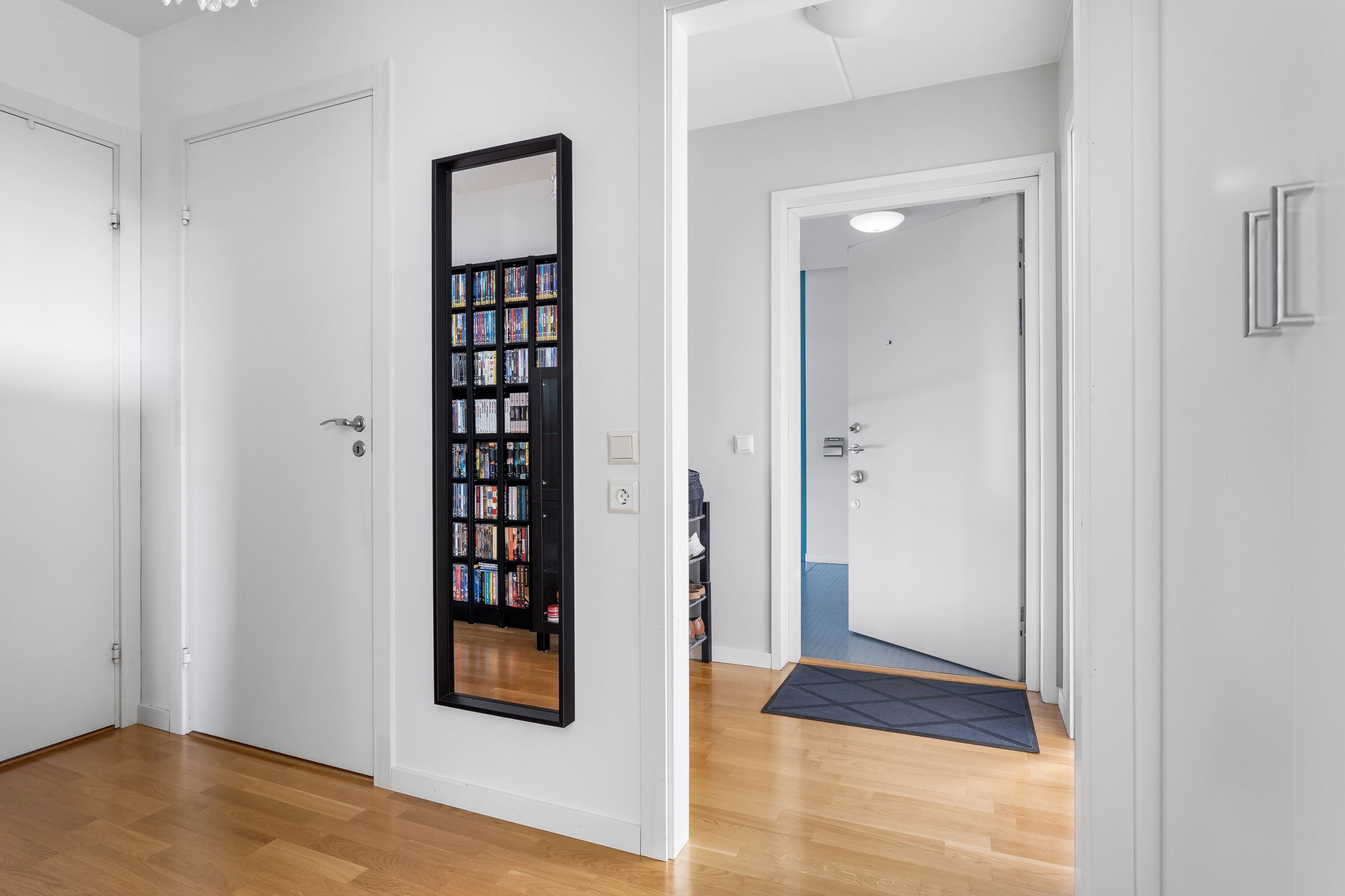 När ni tar första klivet in genom entrédörren blir ni genast omfamnad av den välkomnande hallen som vägleder er till samtliga rum i bostaden. Vid hallens inre passage finner ni en hatthylla för avhängning och inbyggd garderober för extra förvaring. Längre in från hallen nås den den ljusa och luftiga vardagsrummet i öppen planlösning med köket.