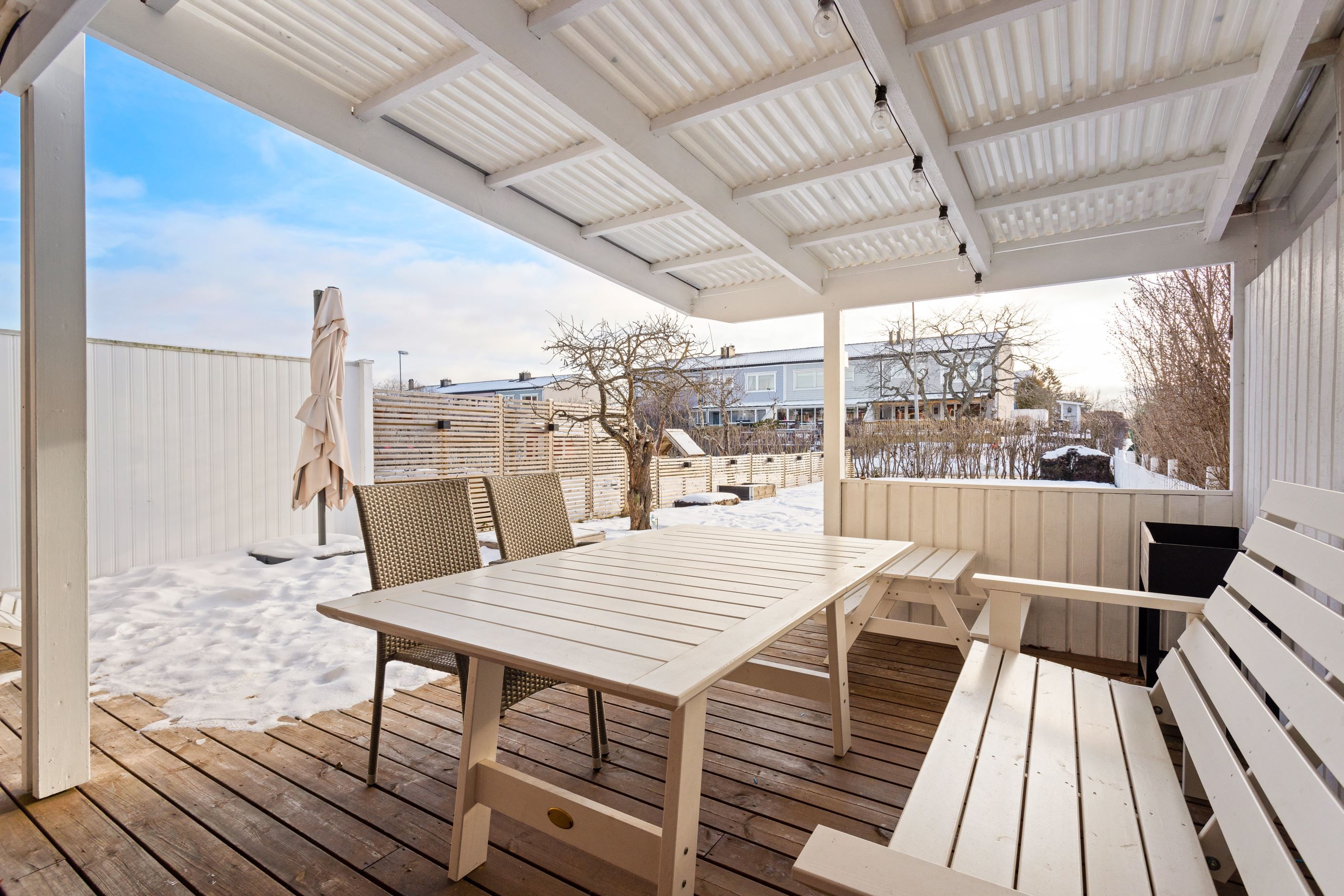Hjärtligt välkomna till detta radhus med stor baksida i soldränkt söderläge. Det perfekta första huset för dig/er som söker äganderätt men vill ha lagom nivå i skötsel. Huset erbjuder ett modernt och ljust kök i öppen planlösning med stor matplats. Från köket kan man enkelt ta sig ut till husets baksida och altan under tak. Vidare erbjuder huset ett påkostat badrum med både dusch och badkar, separat gäst-wc och tvättstuga, tre sovrum på ett plan samt möjlighet att skapa ett ytterligare sovrum på entréplan. Förråd finns vid entrésidan där även plats för cykel och utemöbler finns.