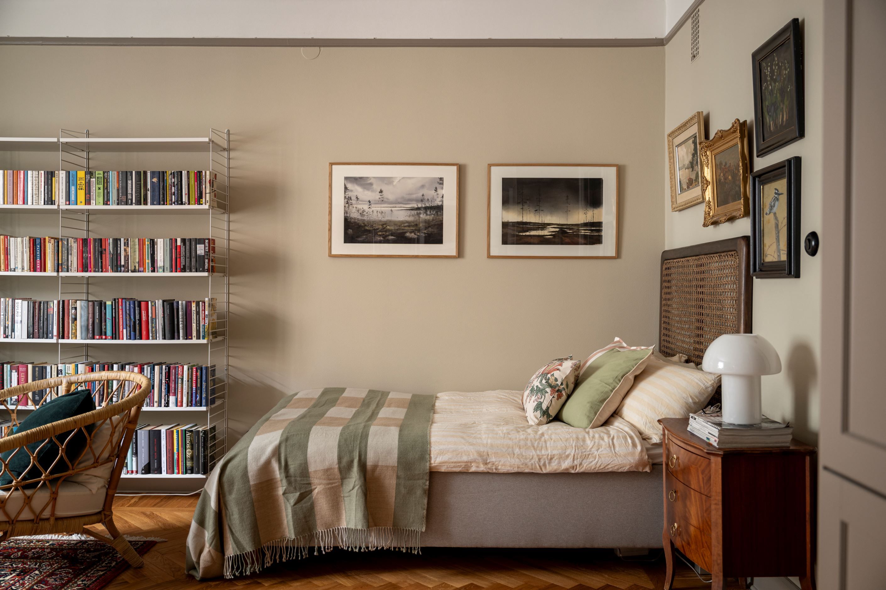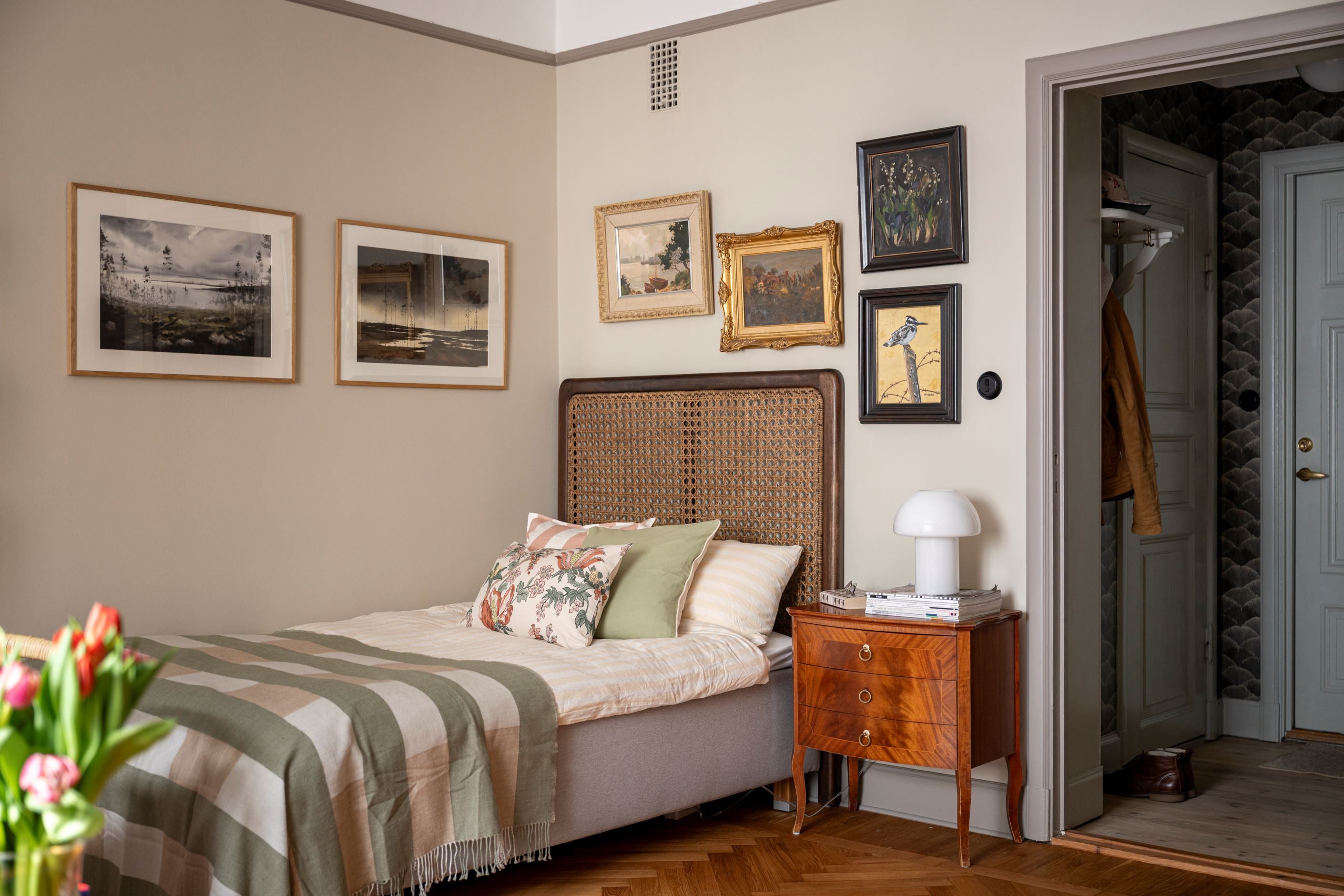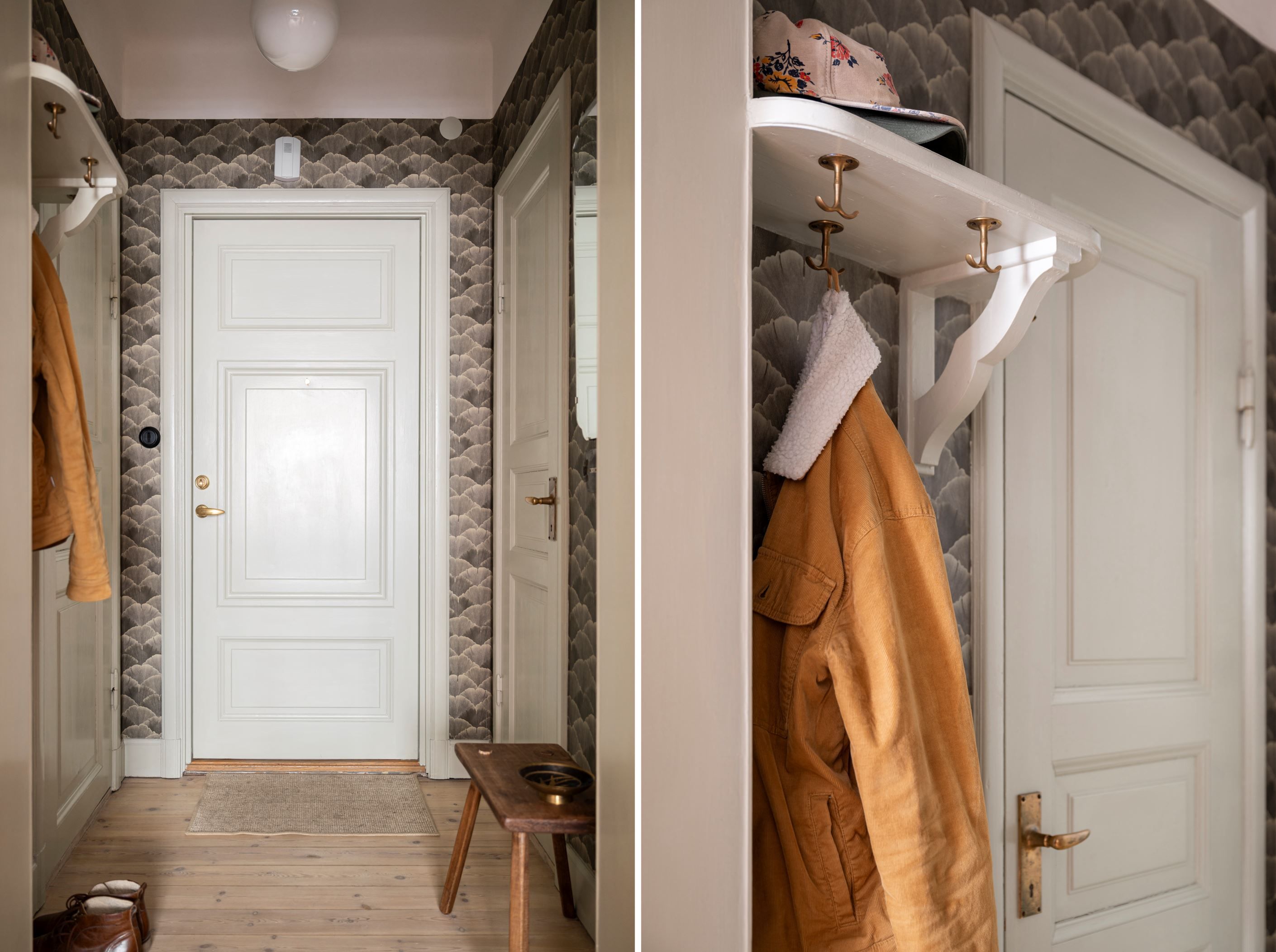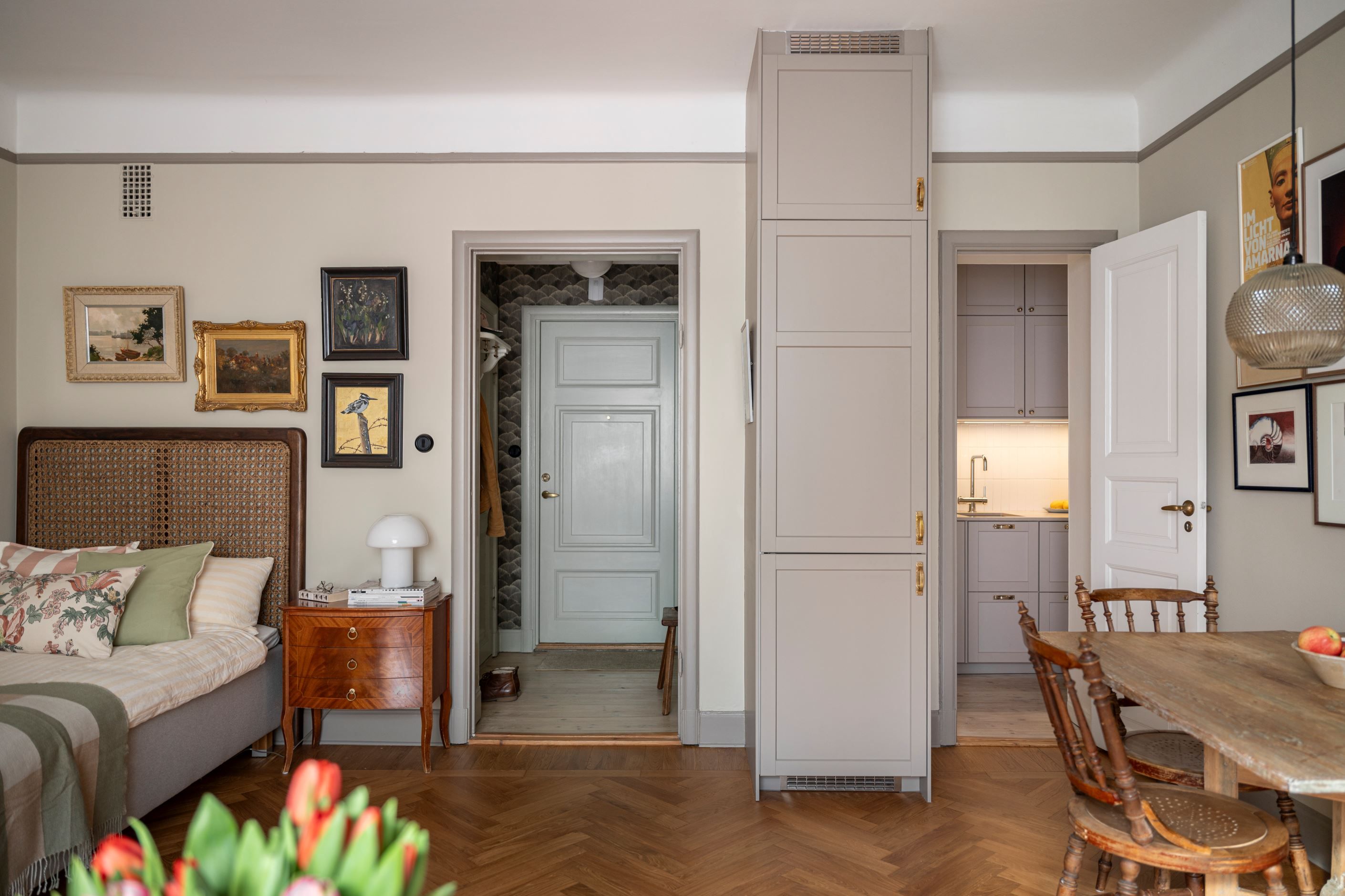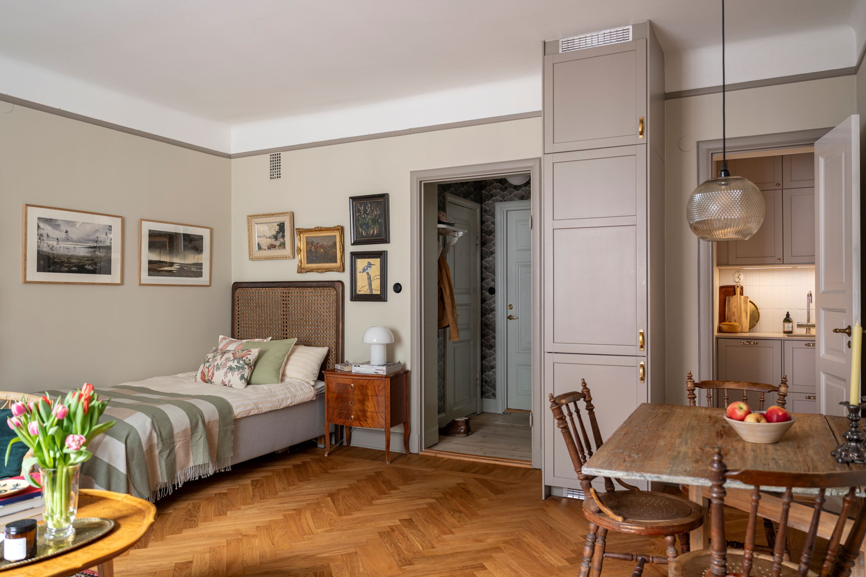 Redan i hallen möts du av en inbjudande känsla med vacker tapet och praktisk hatthylla, här finns även en stor klädkammare som ger goda förvaringsmöjligheter. När du kliver vidare in i vardagsrummet tar den eleganta fiskbensparketten vid och ett stort spröjsat fönster skapar ett härligt ljusflöde till hela bostaden. Rummet är lättmöblerat med gott om plats för både säng, soffa och matplats – ett hem som verkligen utnyttjar varje kvadratmeter på bästa sätt.