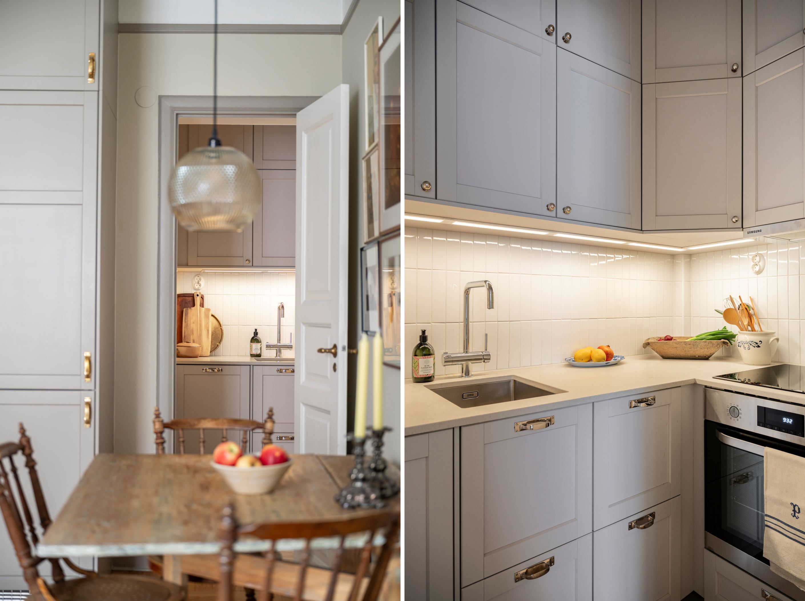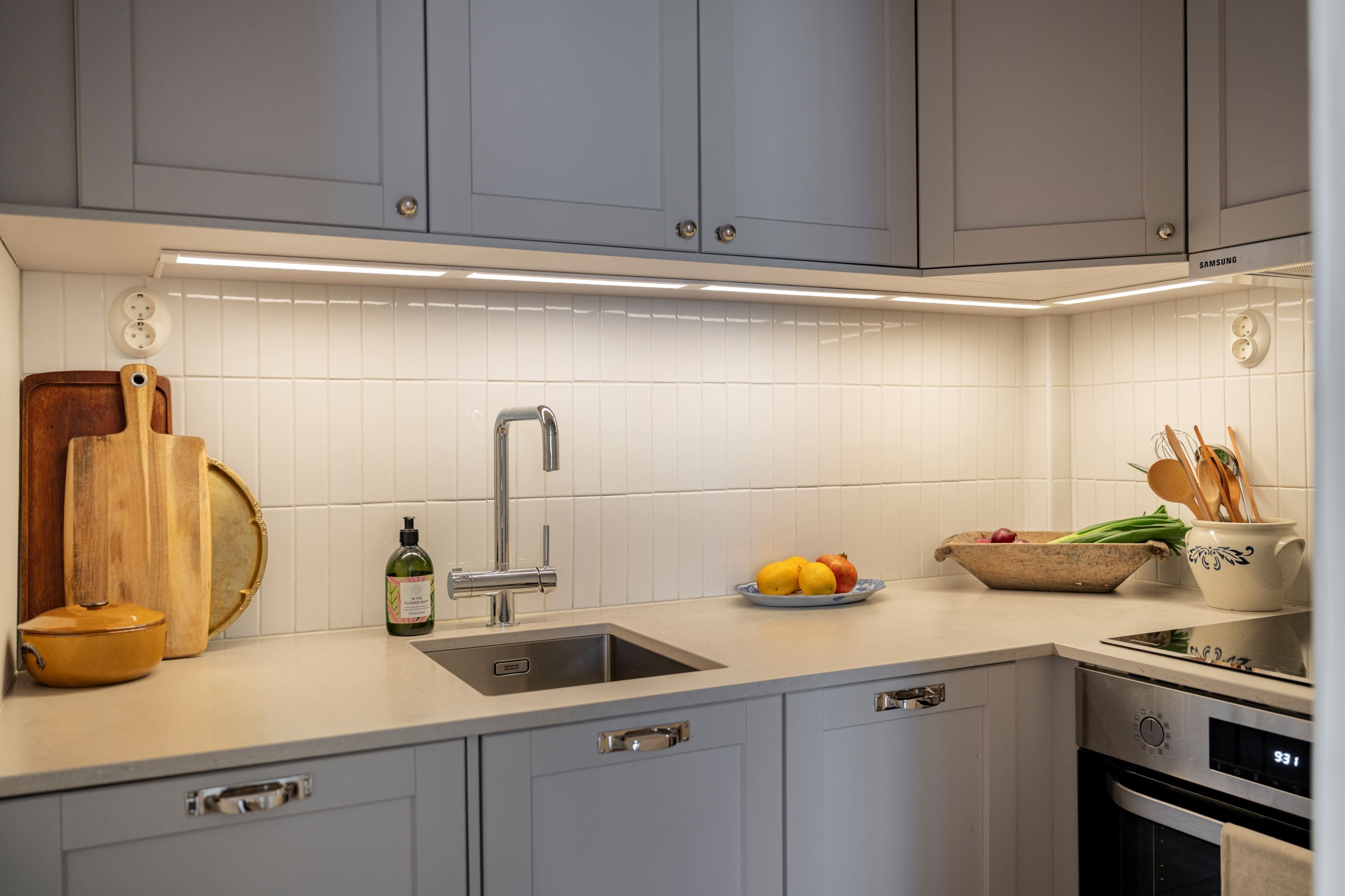 Det smakfullt renoverade köket går i stilren design med snygga materialval och är utrustat med spis, ugn, fläkt och diskmaskin. Precis utanför köket finns kyl och frys.