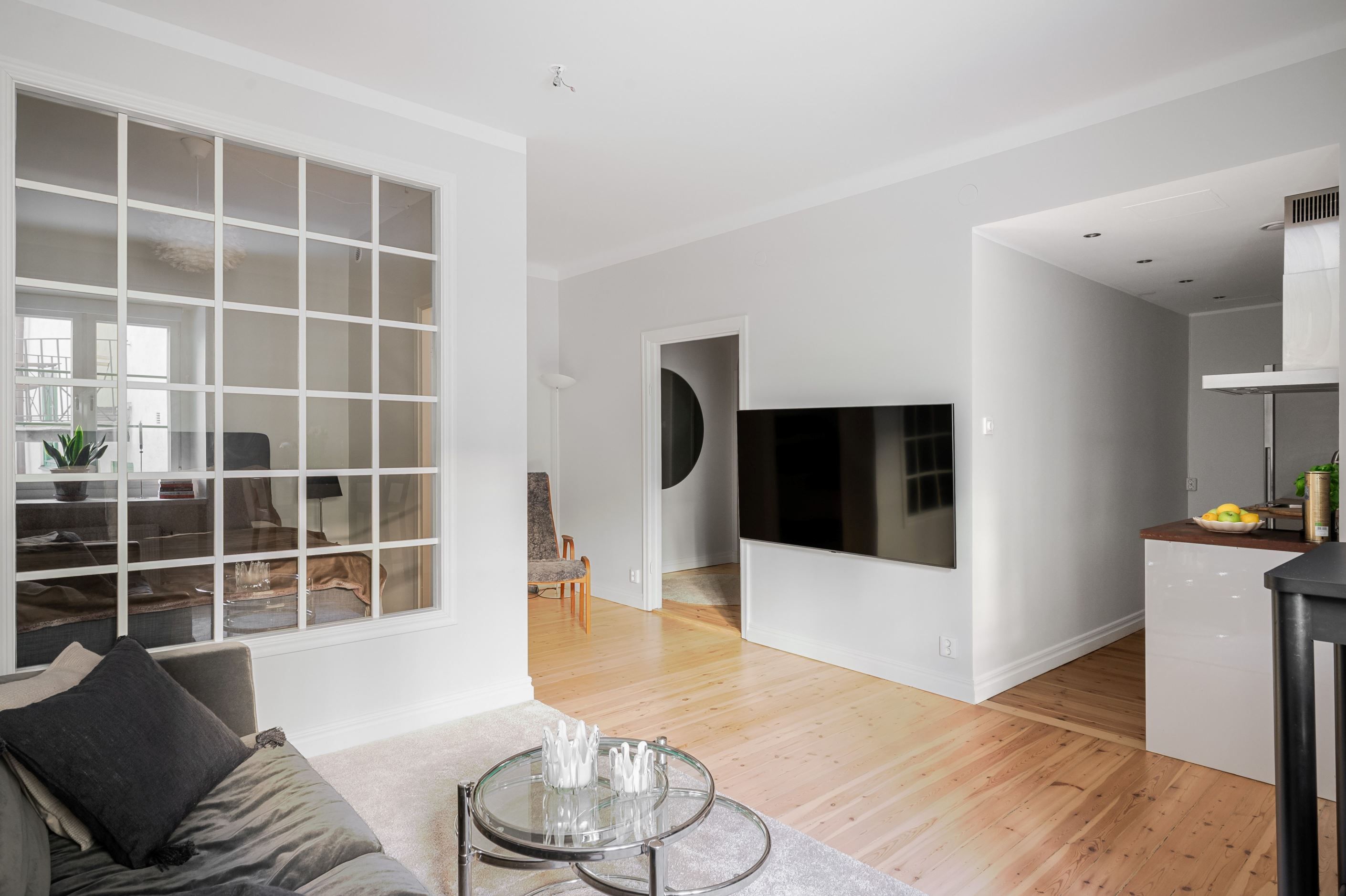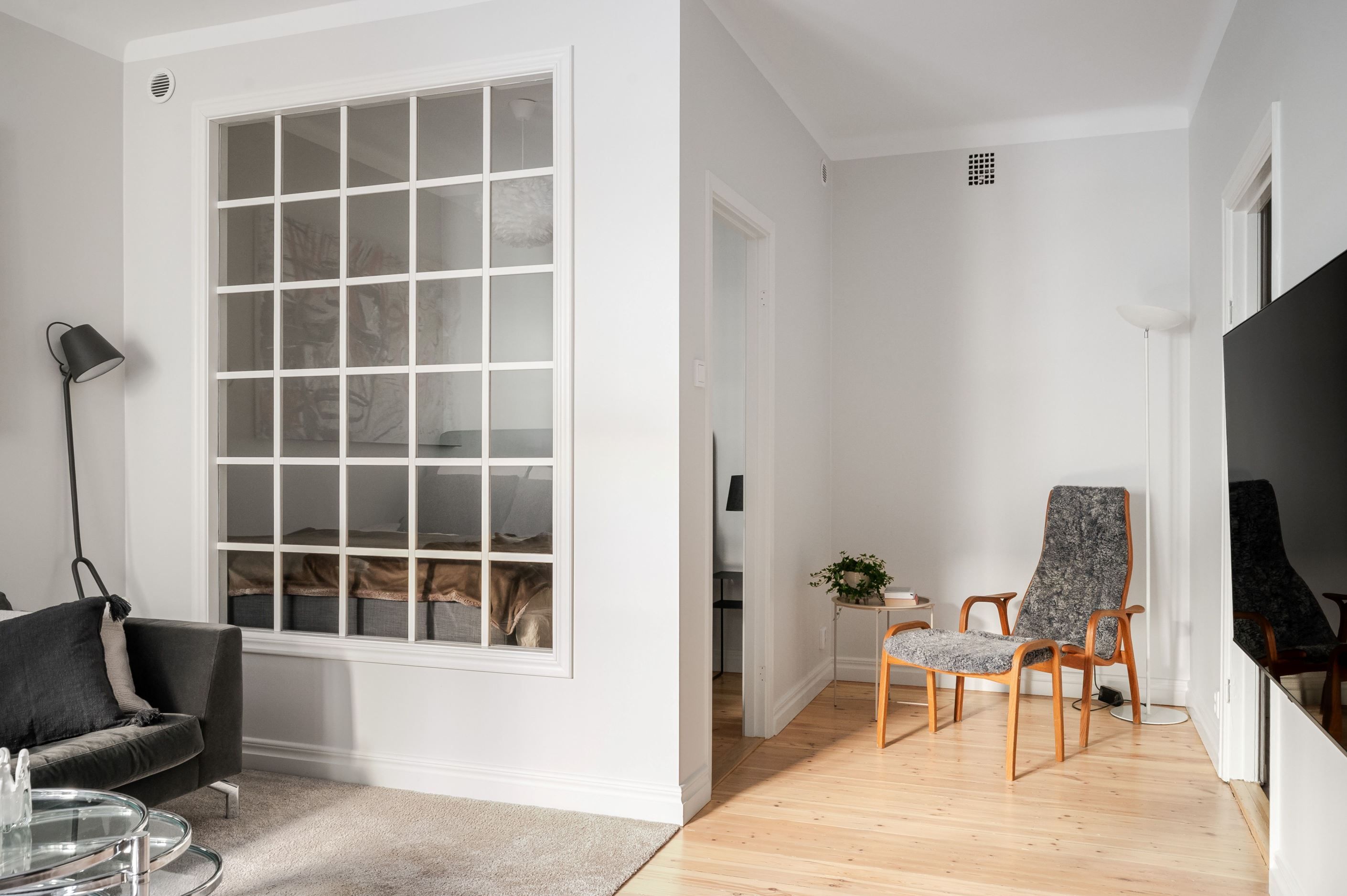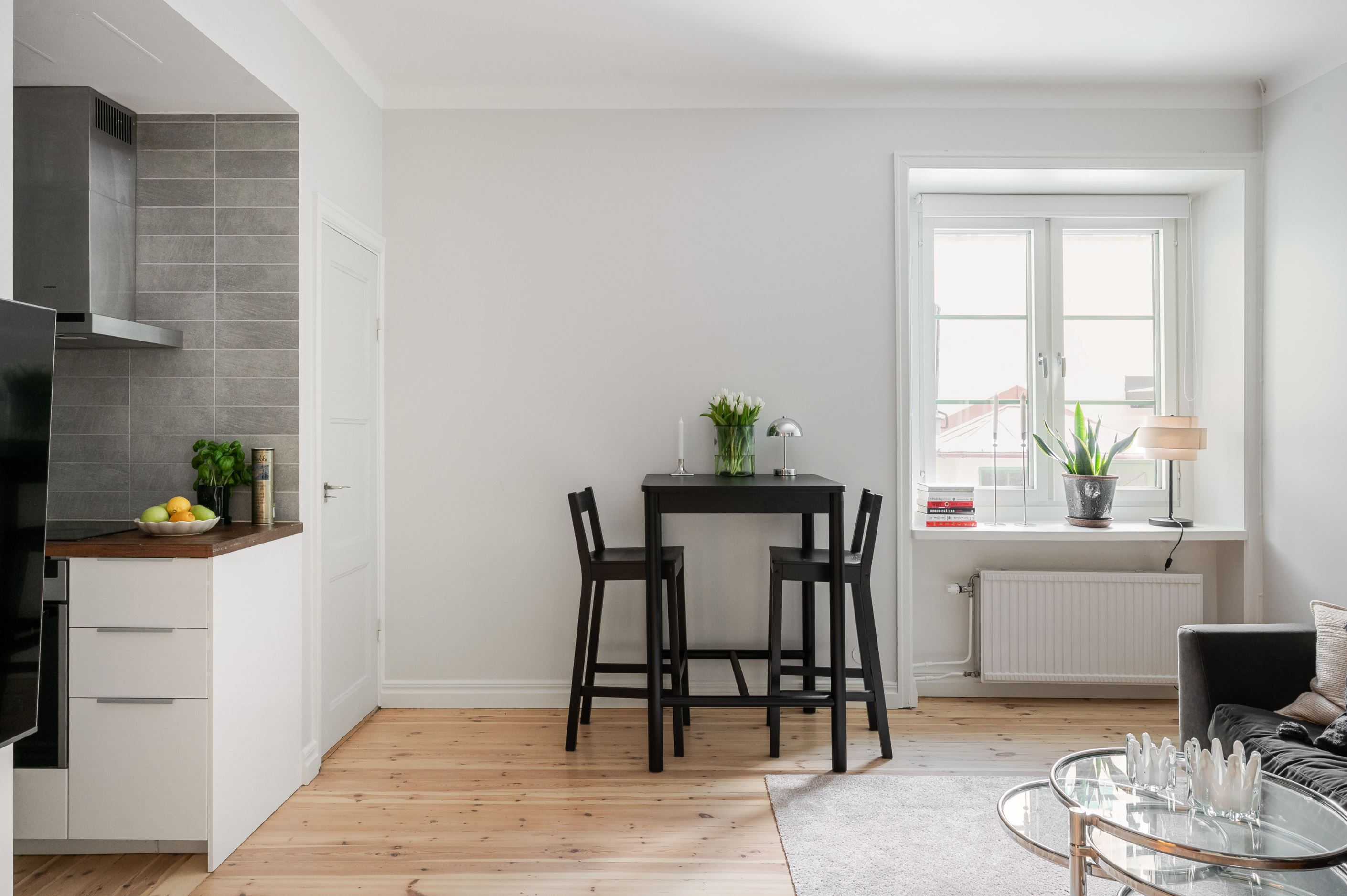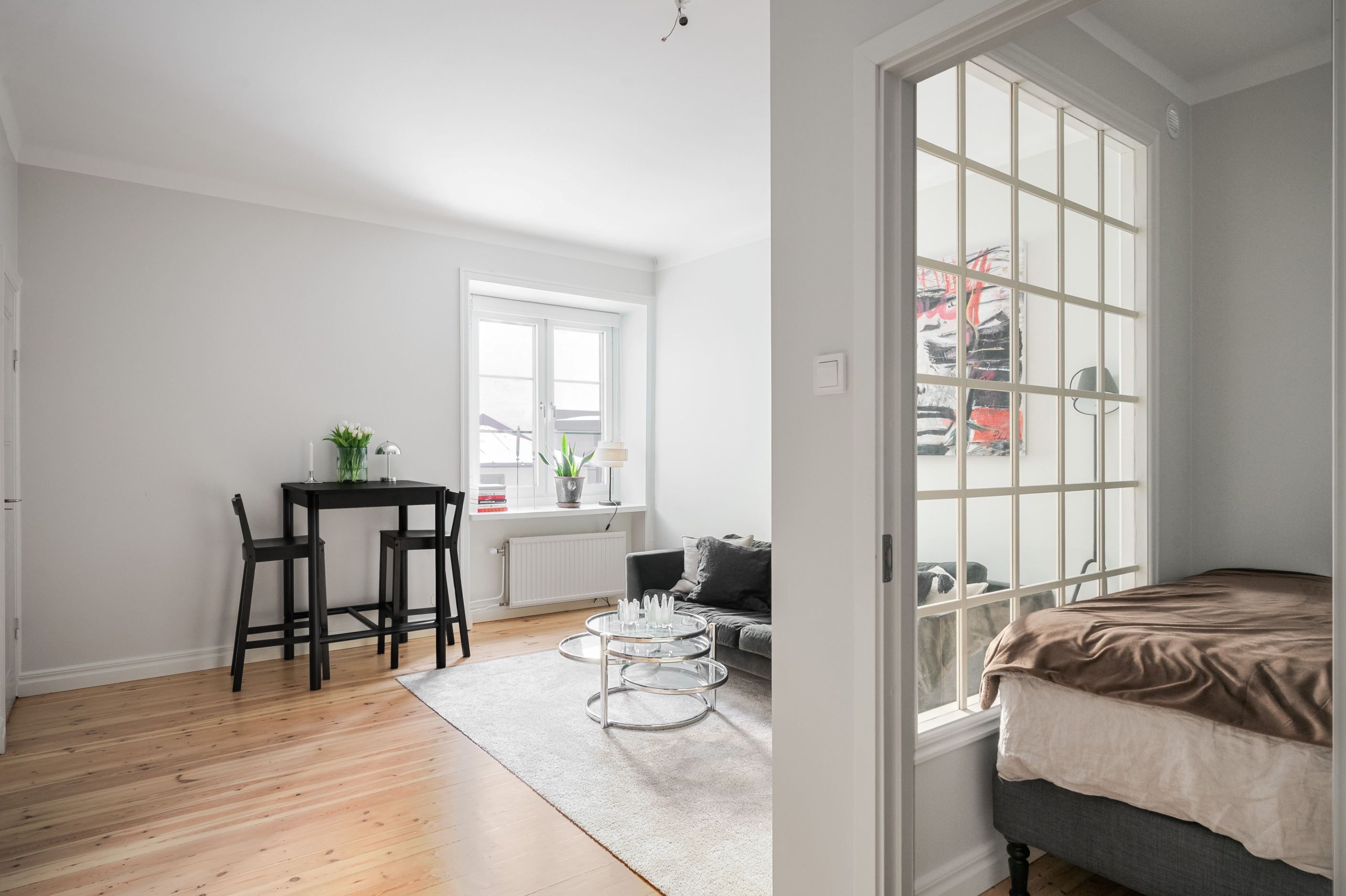 Den öppna planlösningen mellan kök och vardagsrum gör bostaden både social och lättmöblerad – perfekt för middagar med vänner såväl som lugna hemmakvällar. Köket är placerat i direkt anslutning till vardagsrummet och bidrar till ett luftigt och sammanhängande helhetsintryck. Sovrummet är smart avdelat och ramas in av ett spröjsat fönsterparti som släpper in ljus och samtidigt skapar en tydlig och ombonad sovdel.