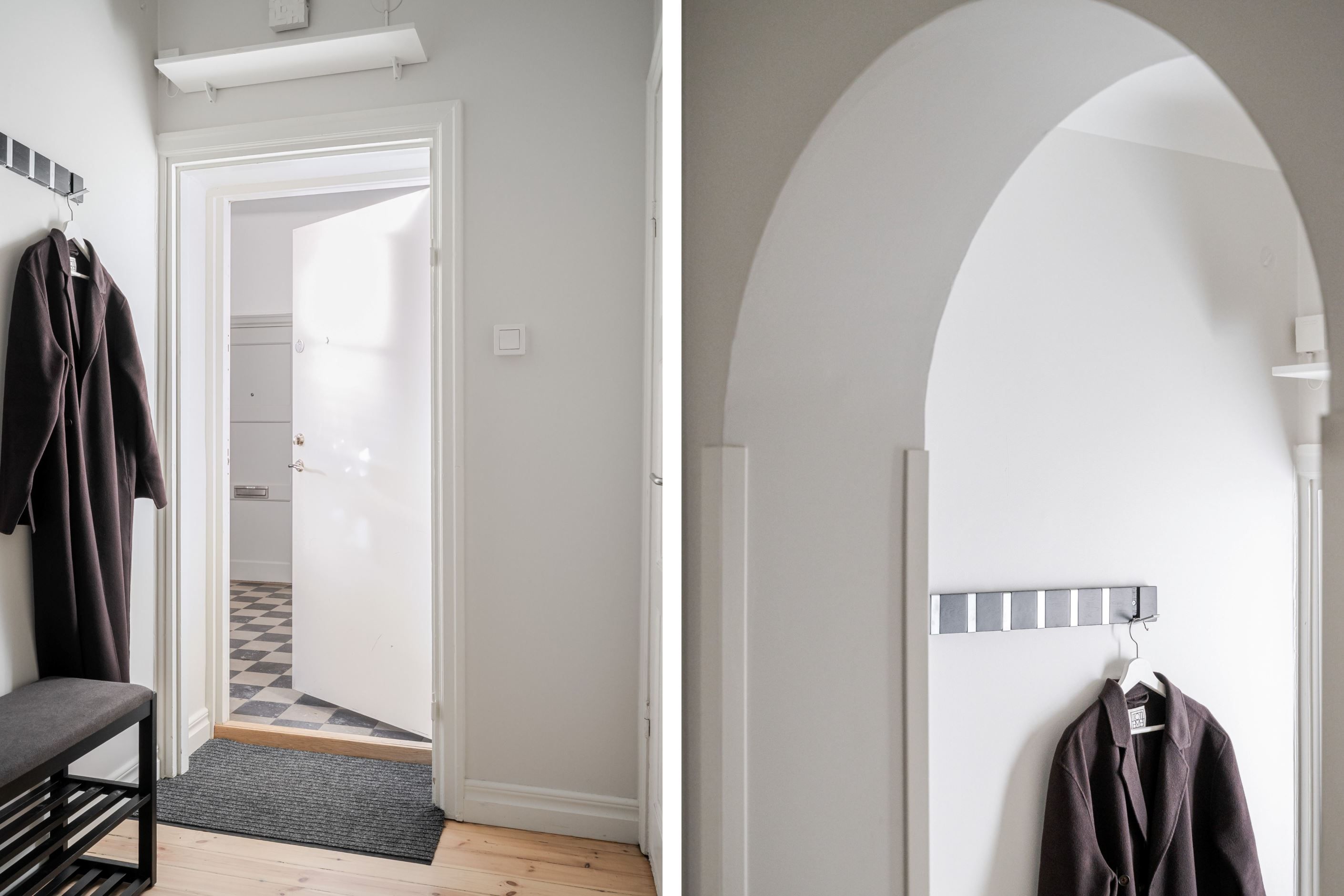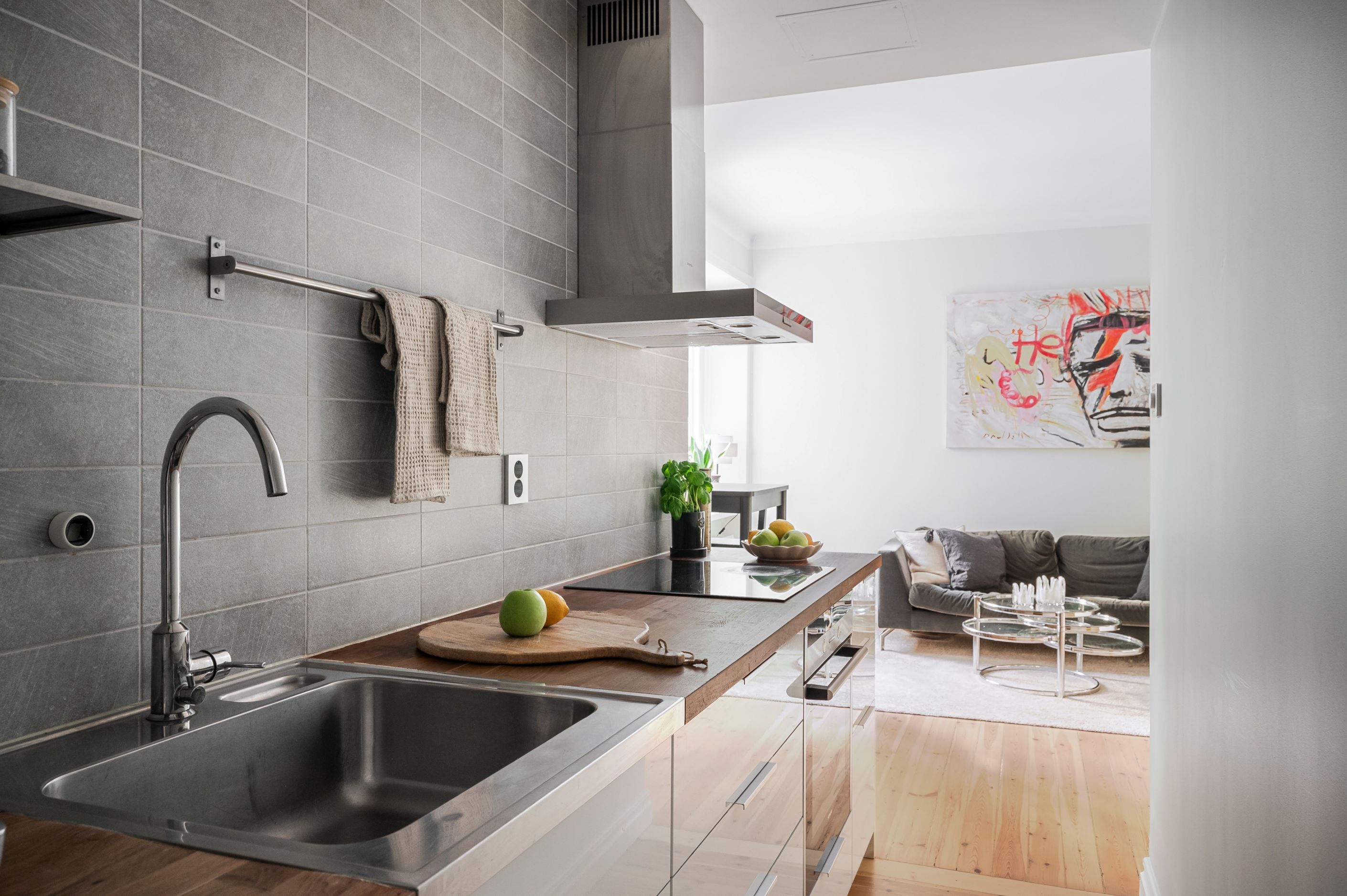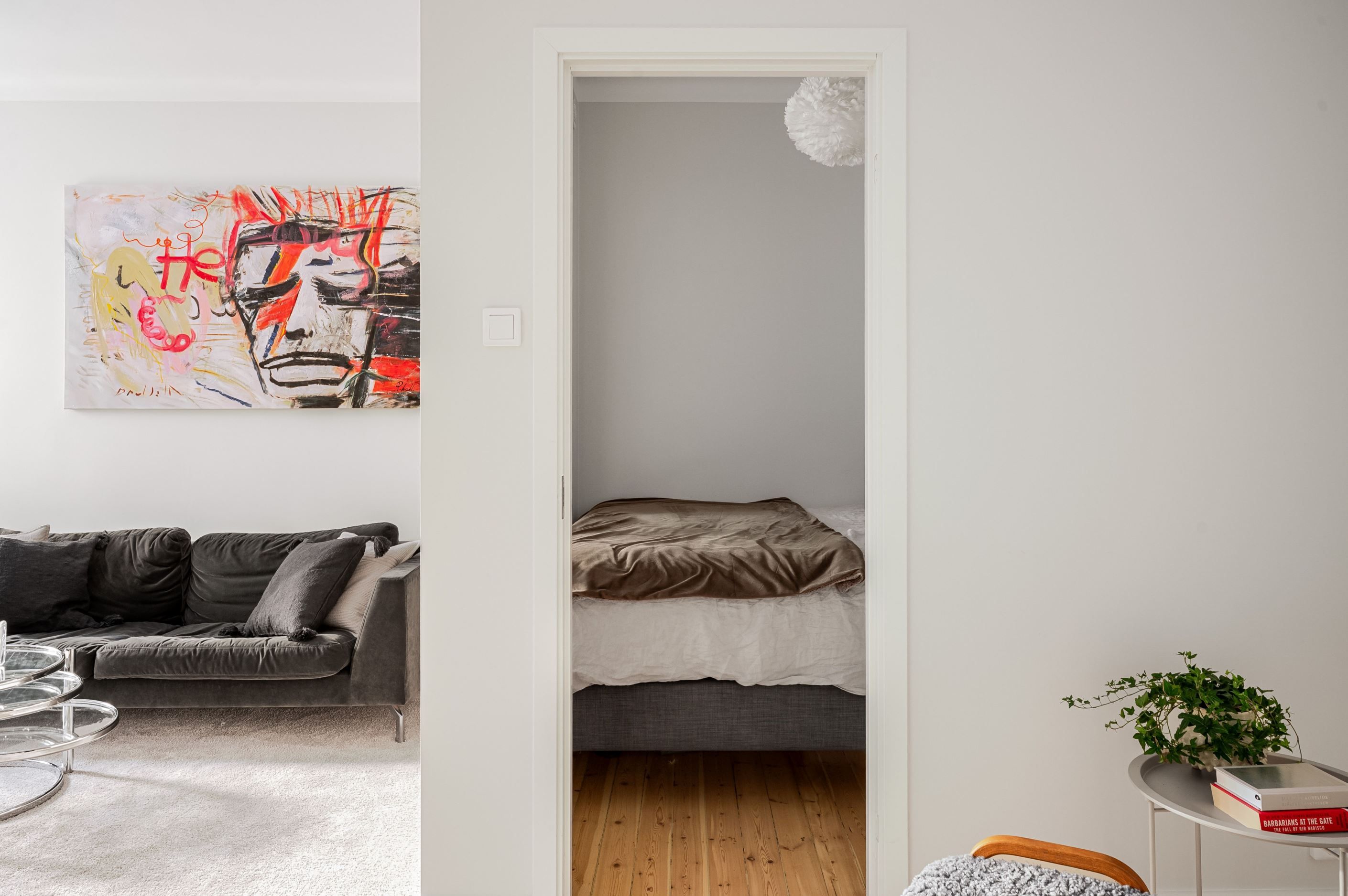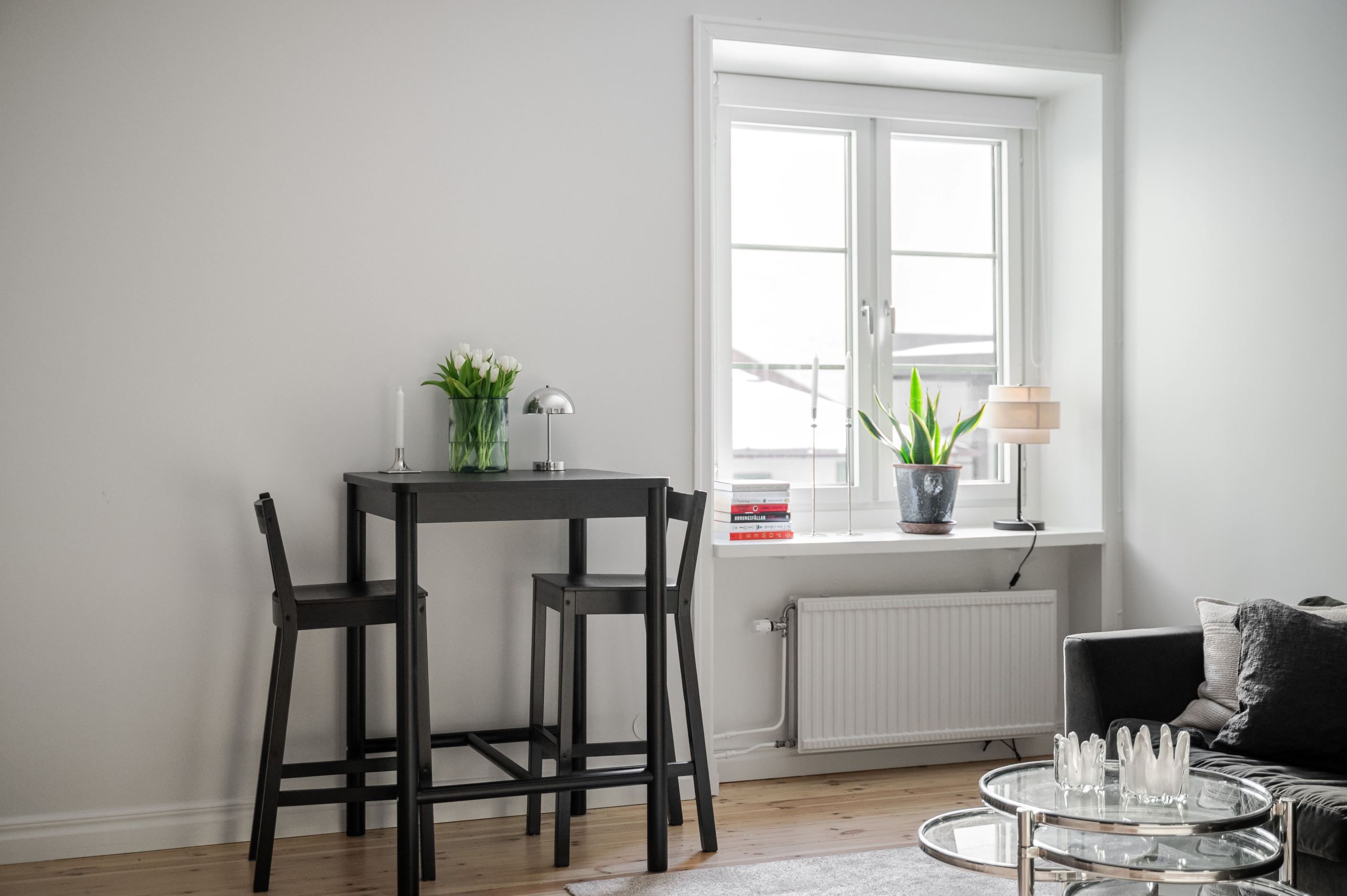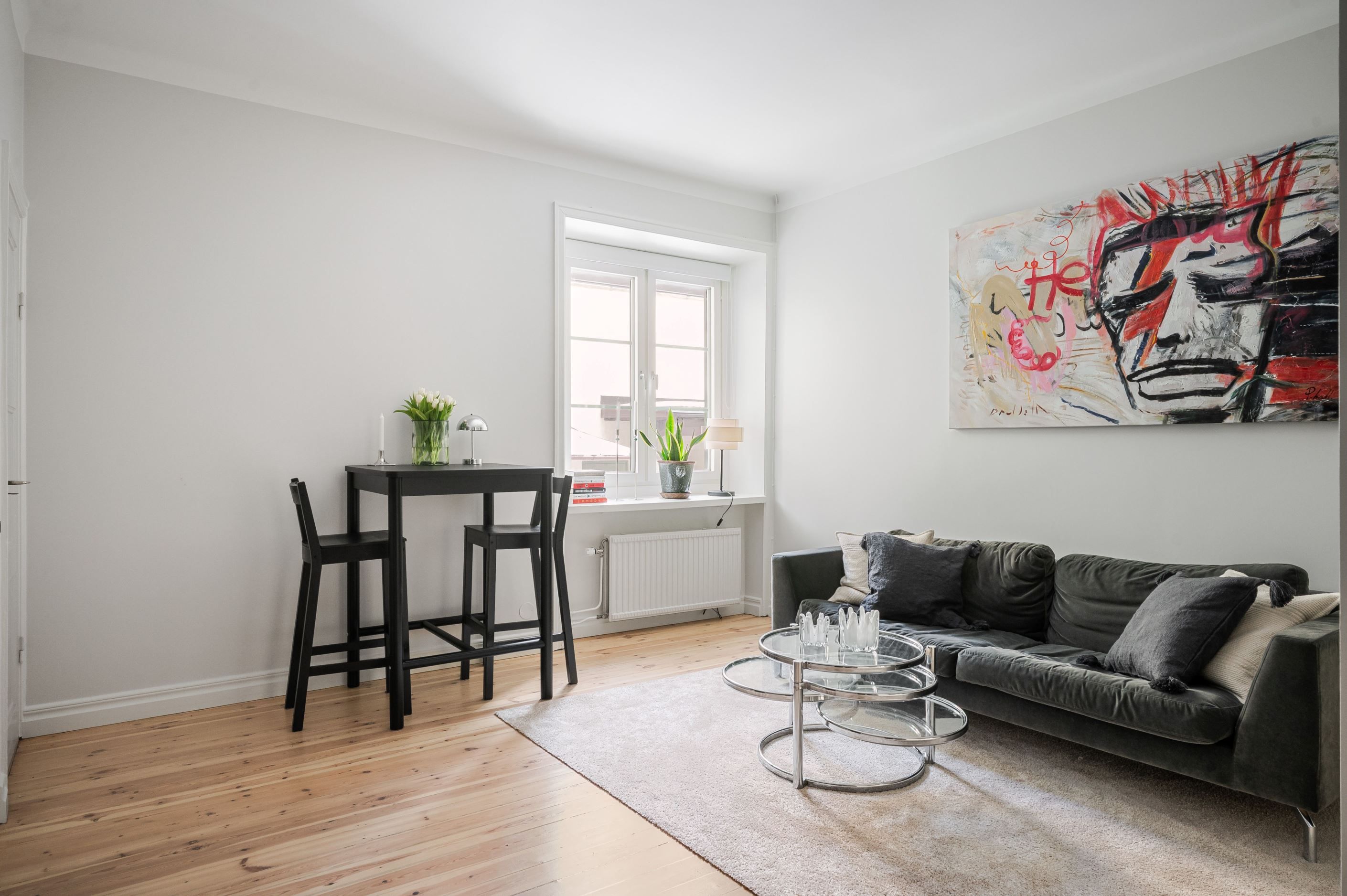 Den öppna planlösningen mellan kök och vardagsrum gör bostaden både social och lättmöblerad – perfekt för middagar med vänner såväl som lugna hemmakvällar. Köket är placerat i direkt anslutning till vardagsrummet och bidrar till ett luftigt och sammanhängande helhetsintryck. Sovrummet är smart avdelat och ramas in av ett spröjsat fönsterparti som släpper in ljus och samtidigt skapar en tydlig och ombonad sovdel.