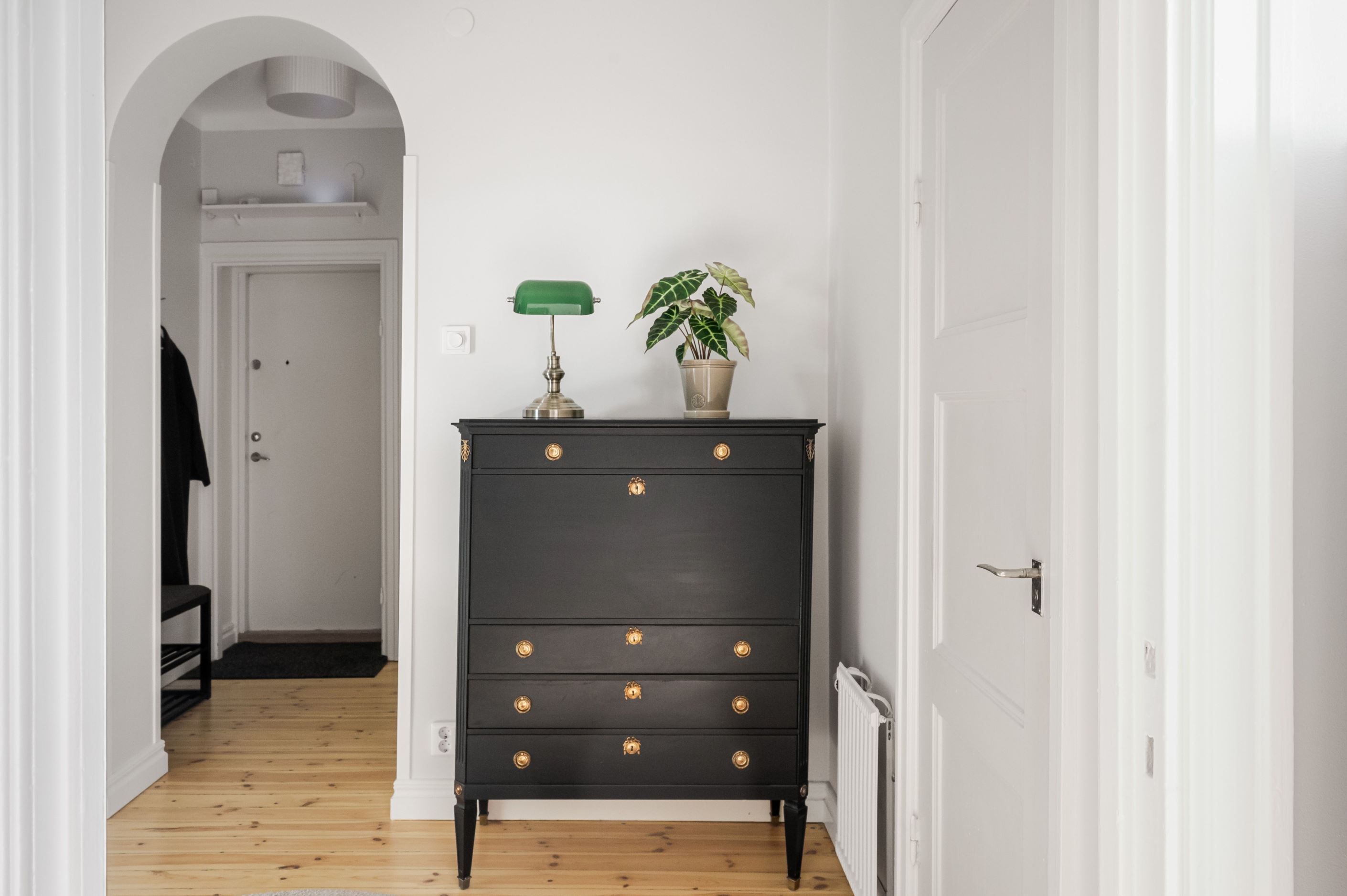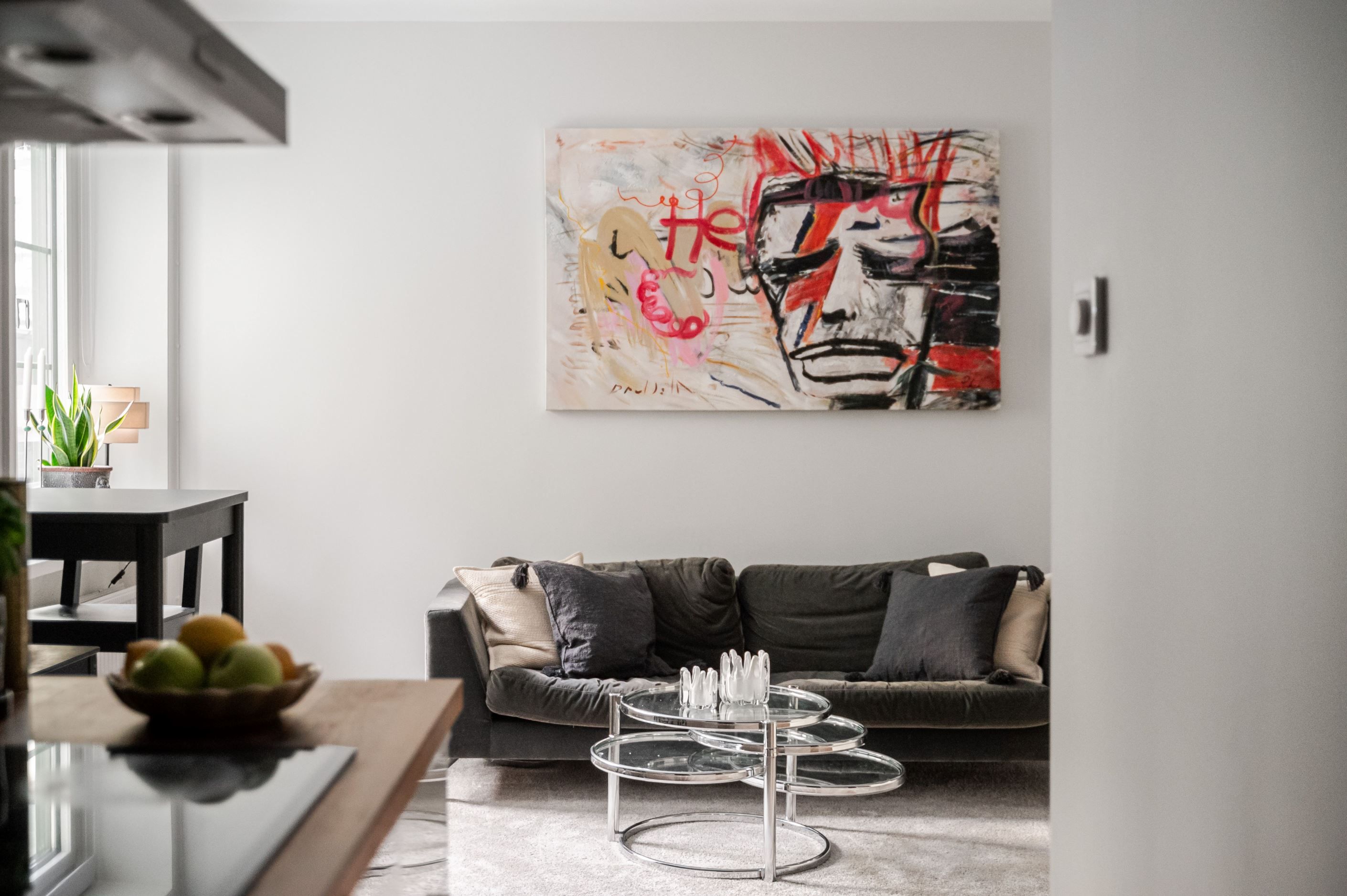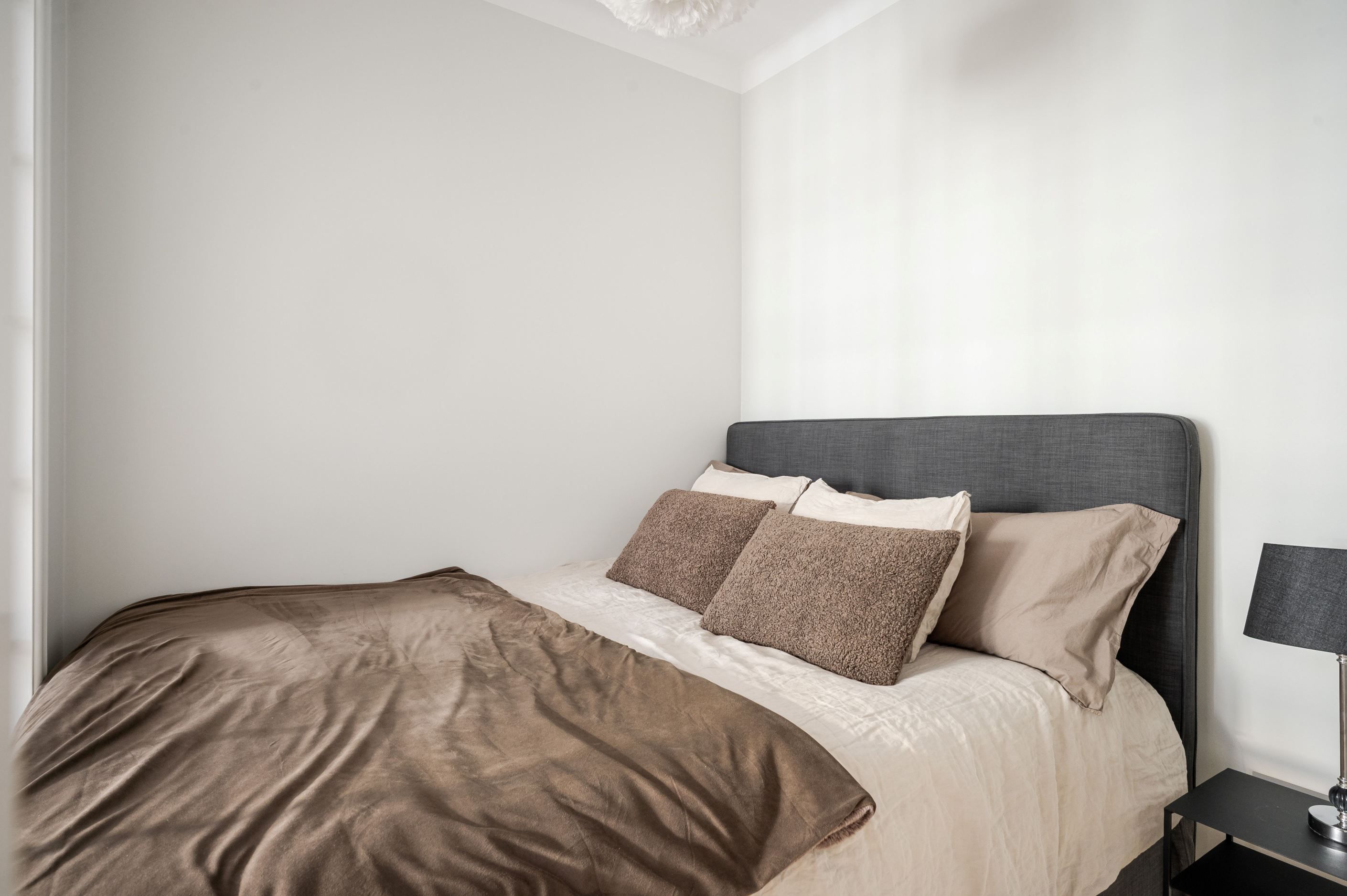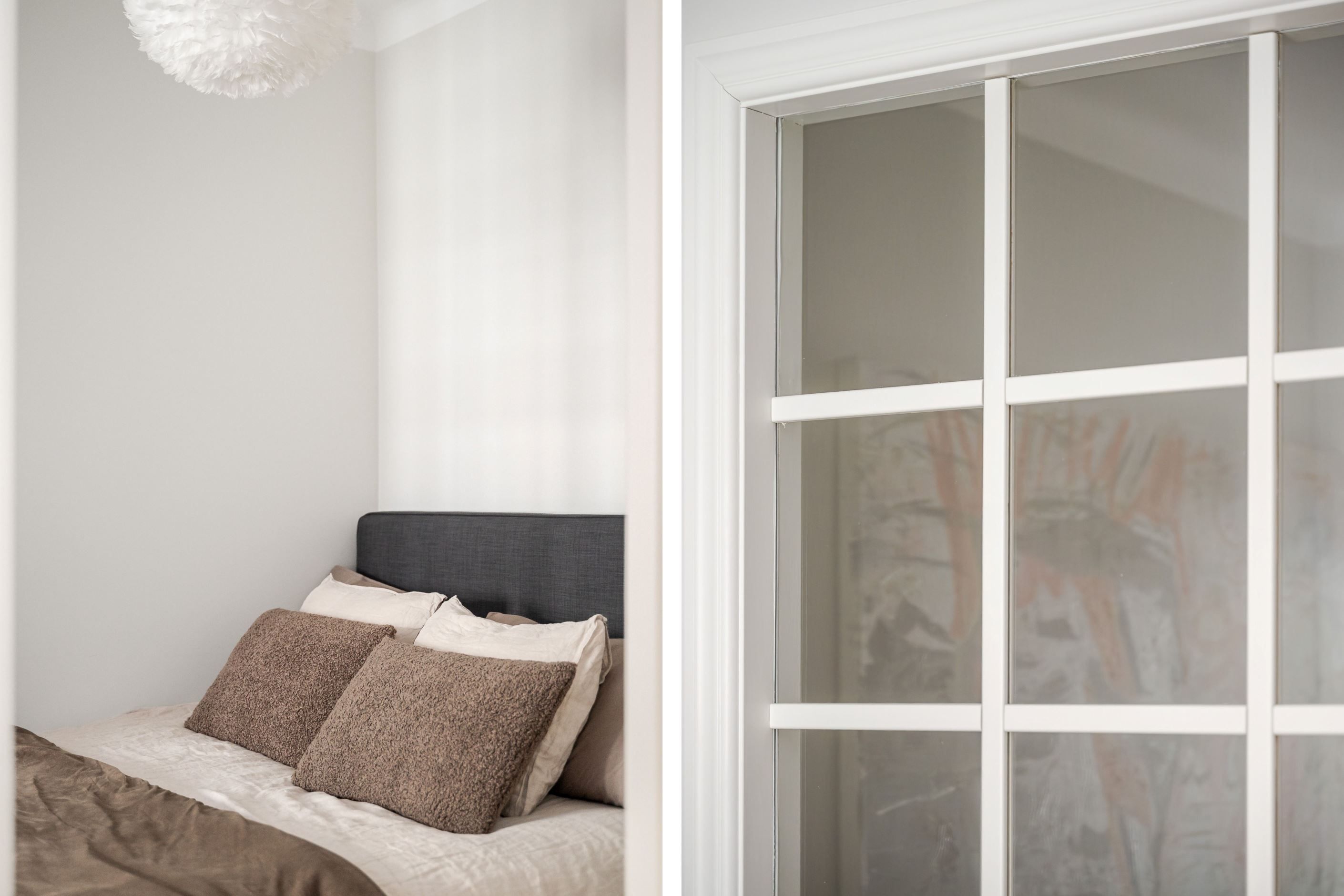 Den öppna planlösningen mellan kök och vardagsrum gör bostaden både social och lättmöblerad – perfekt för middagar med vänner såväl som lugna hemmakvällar. Köket är placerat i direkt anslutning till vardagsrummet och bidrar till ett luftigt och sammanhängande helhetsintryck. Sovrummet är smart avdelat och ramas in av ett spröjsat fönsterparti som släpper in ljus och samtidigt skapar en tydlig och ombonad sovdel.