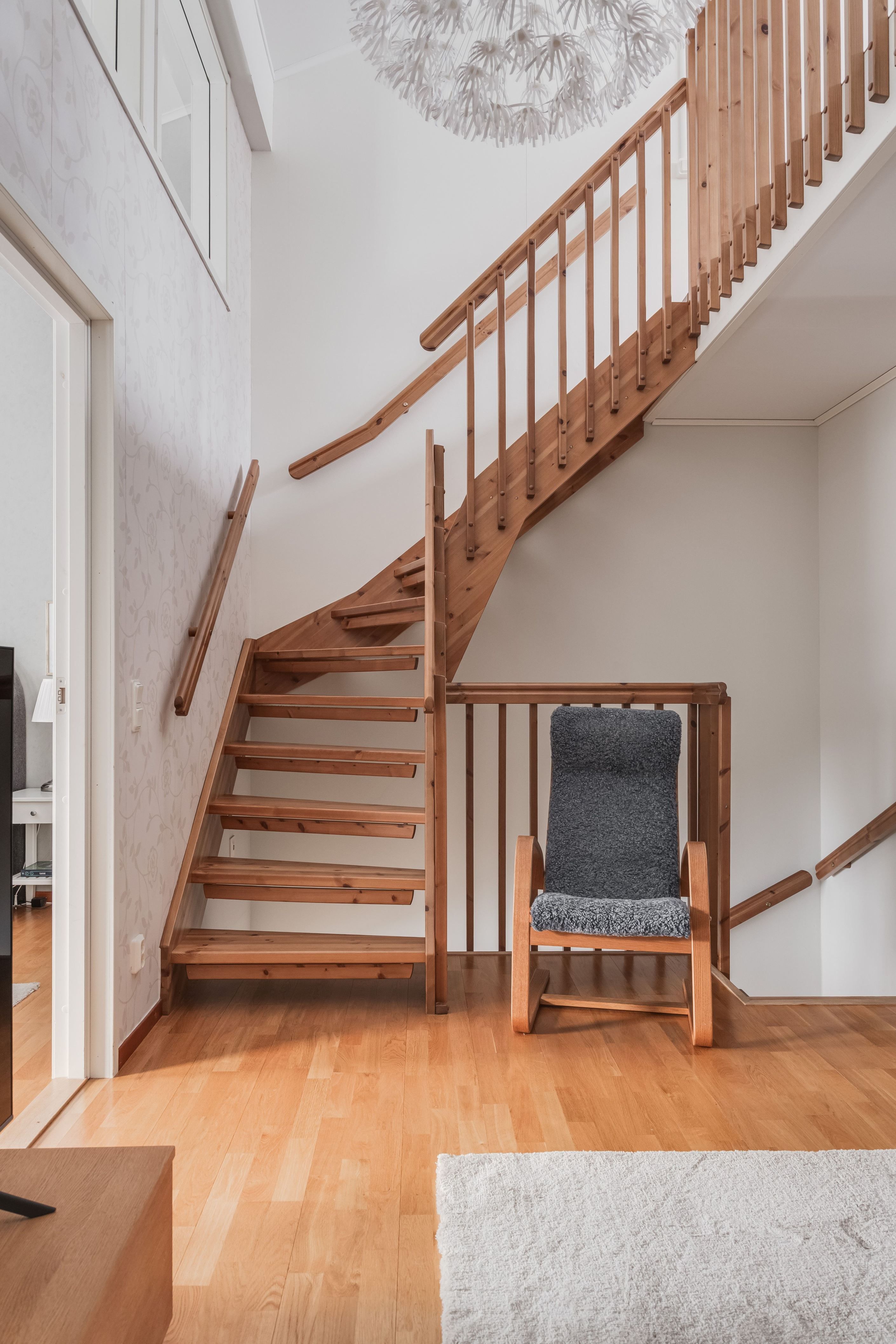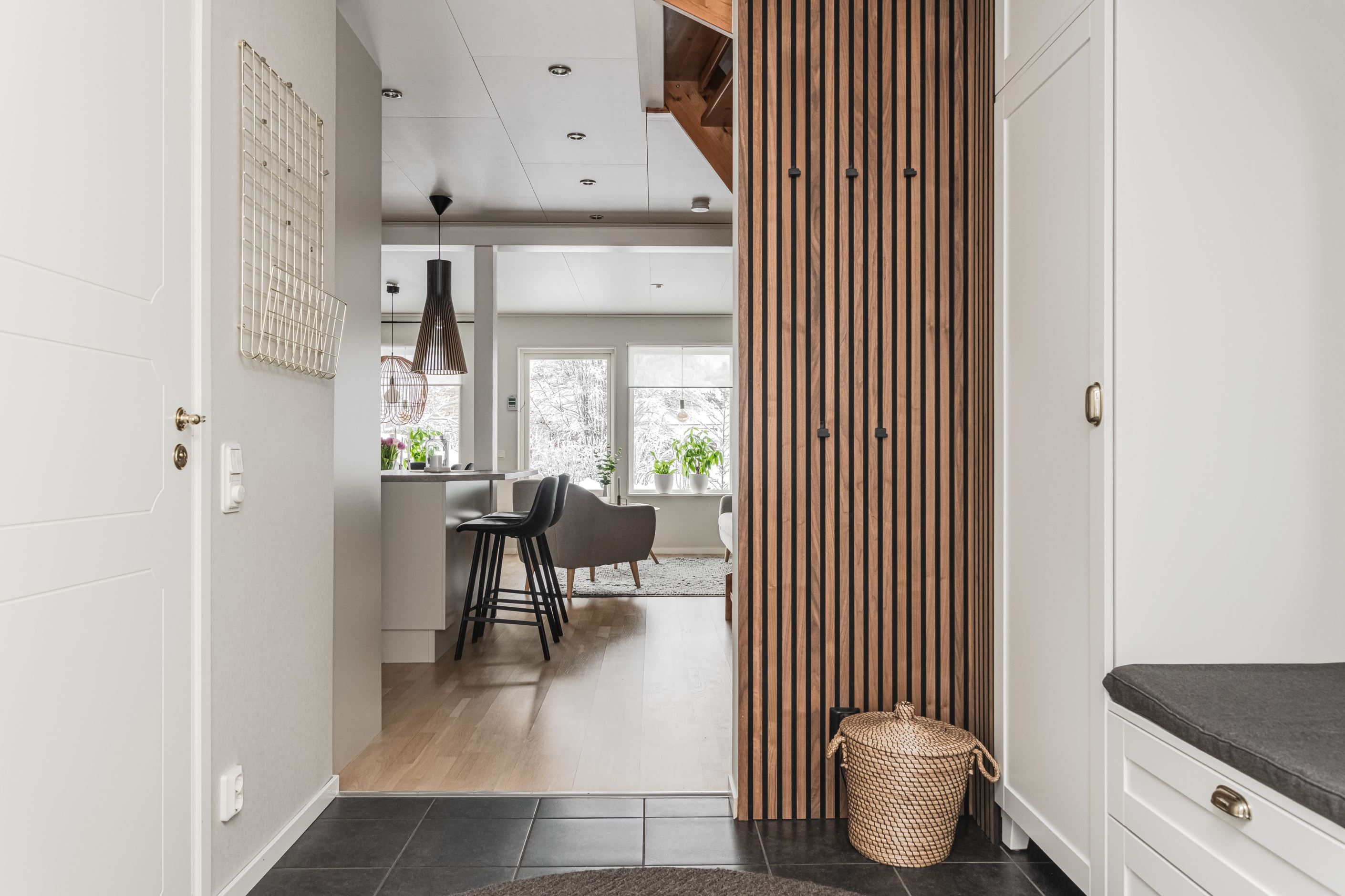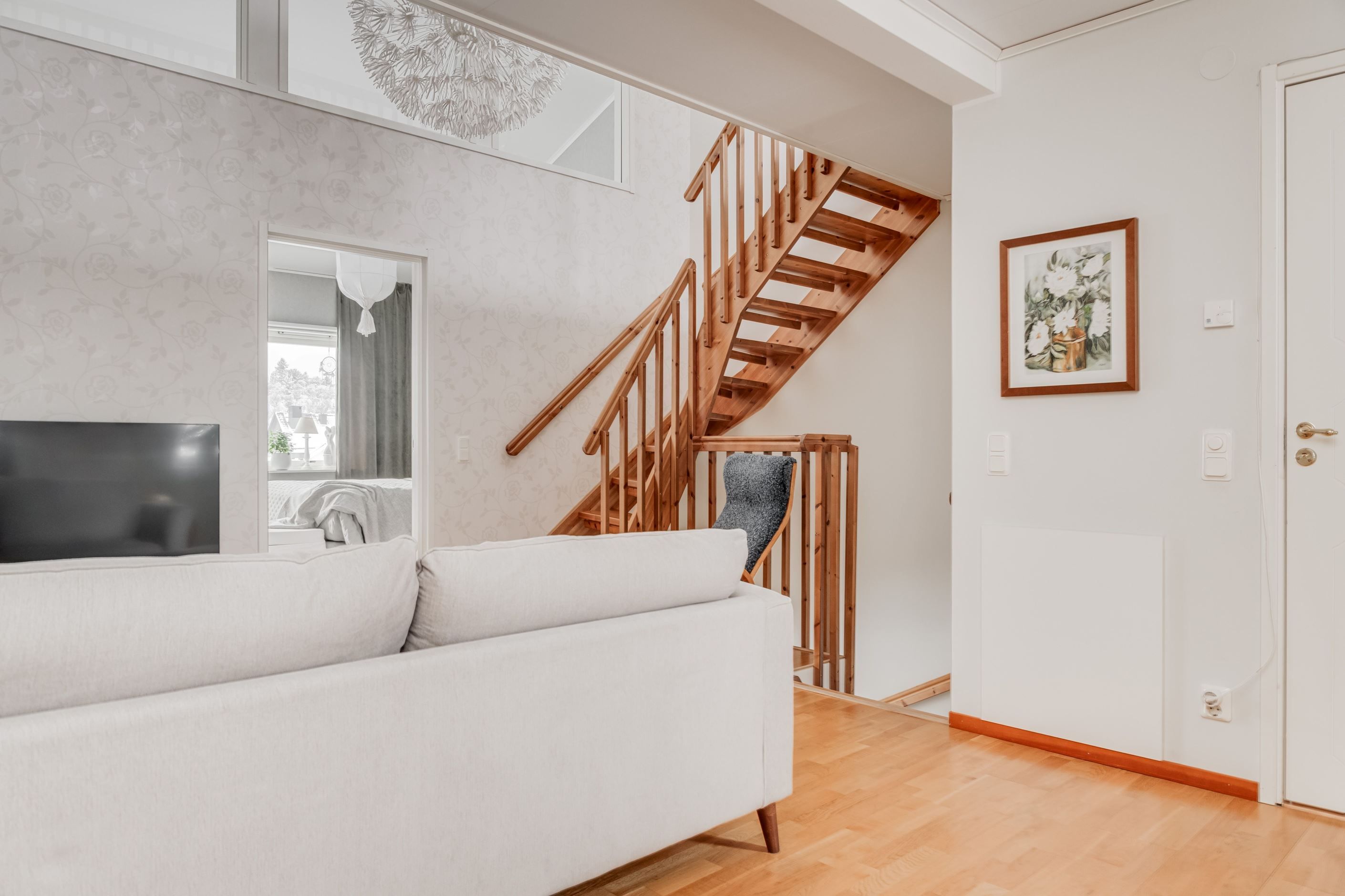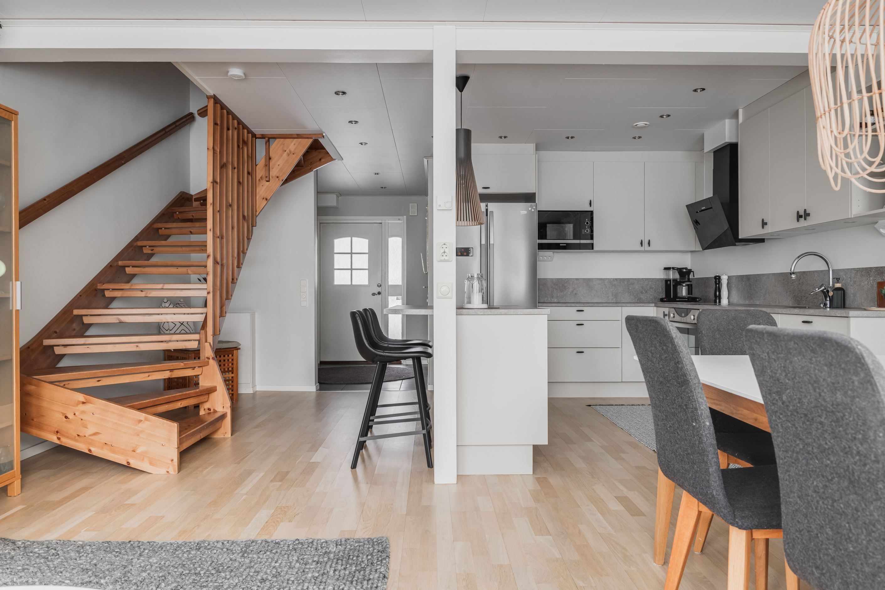 Redan vid entrén möts du av en genomtänkt planlösning och hög boendekomfort. Det renoverade köket med smakfull köksinredning från HTH erbjuder gott om arbetsytor och förvaring. På entréplanet finns även ett helkaklat badrum med klinkergolv bastu.
