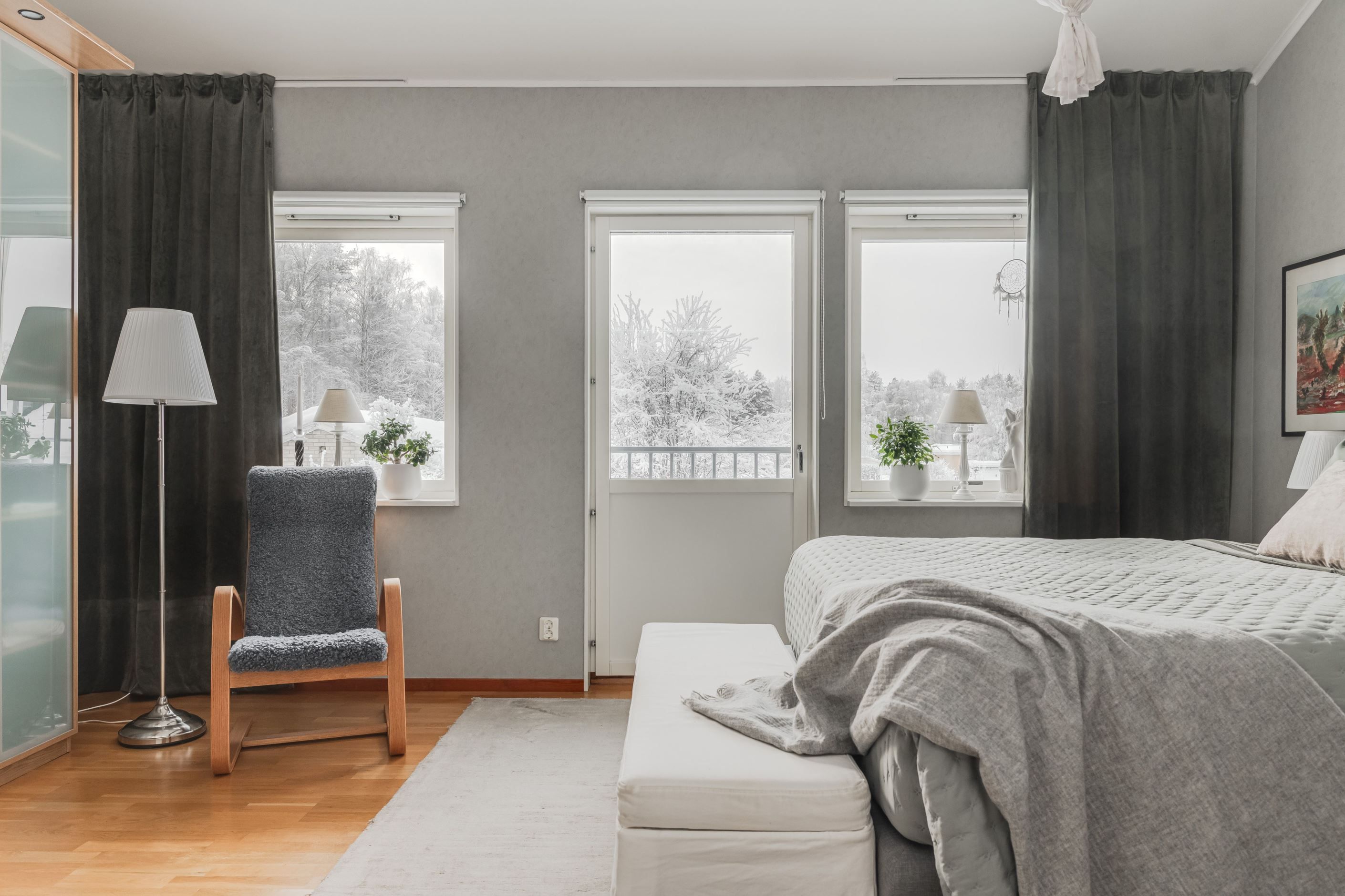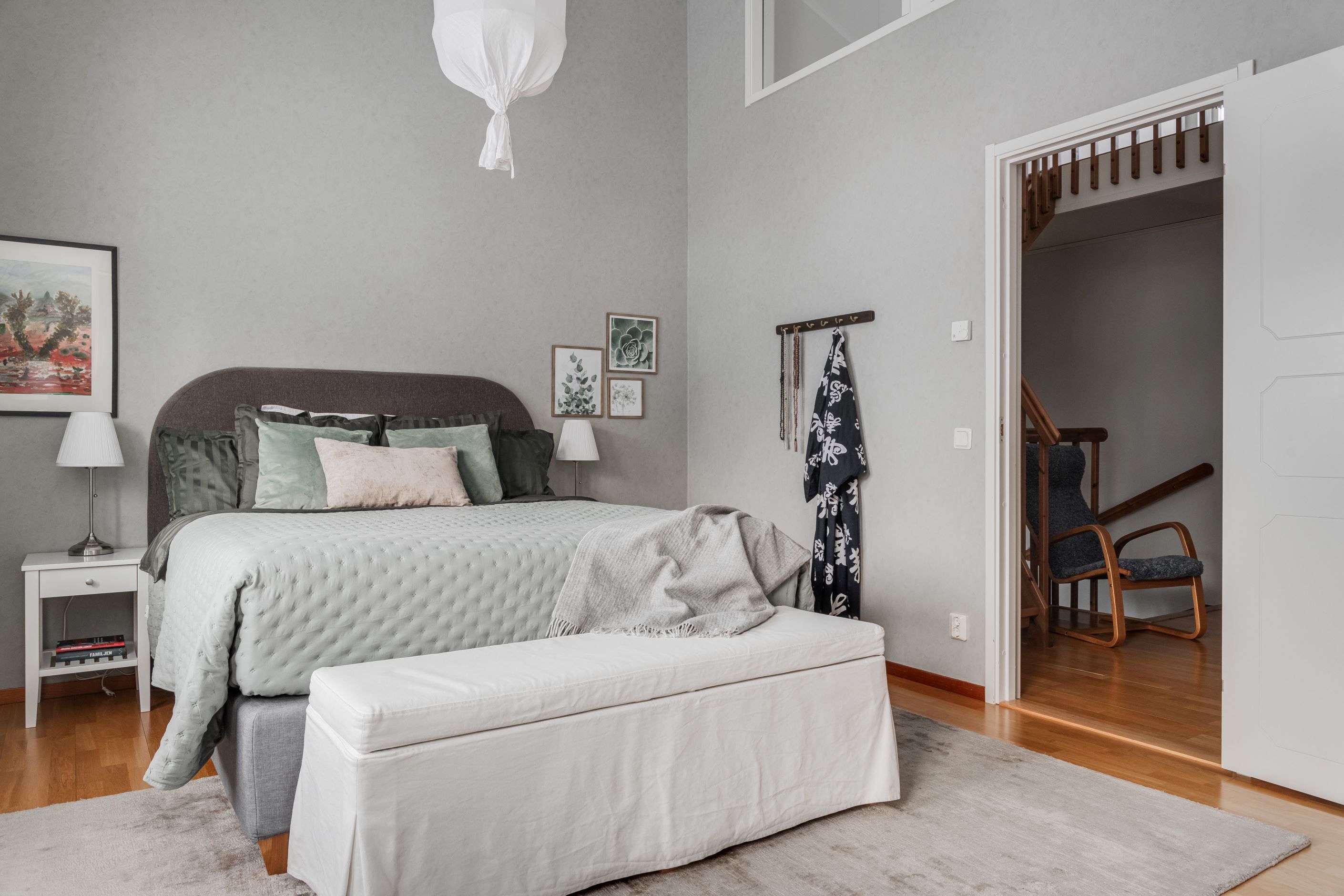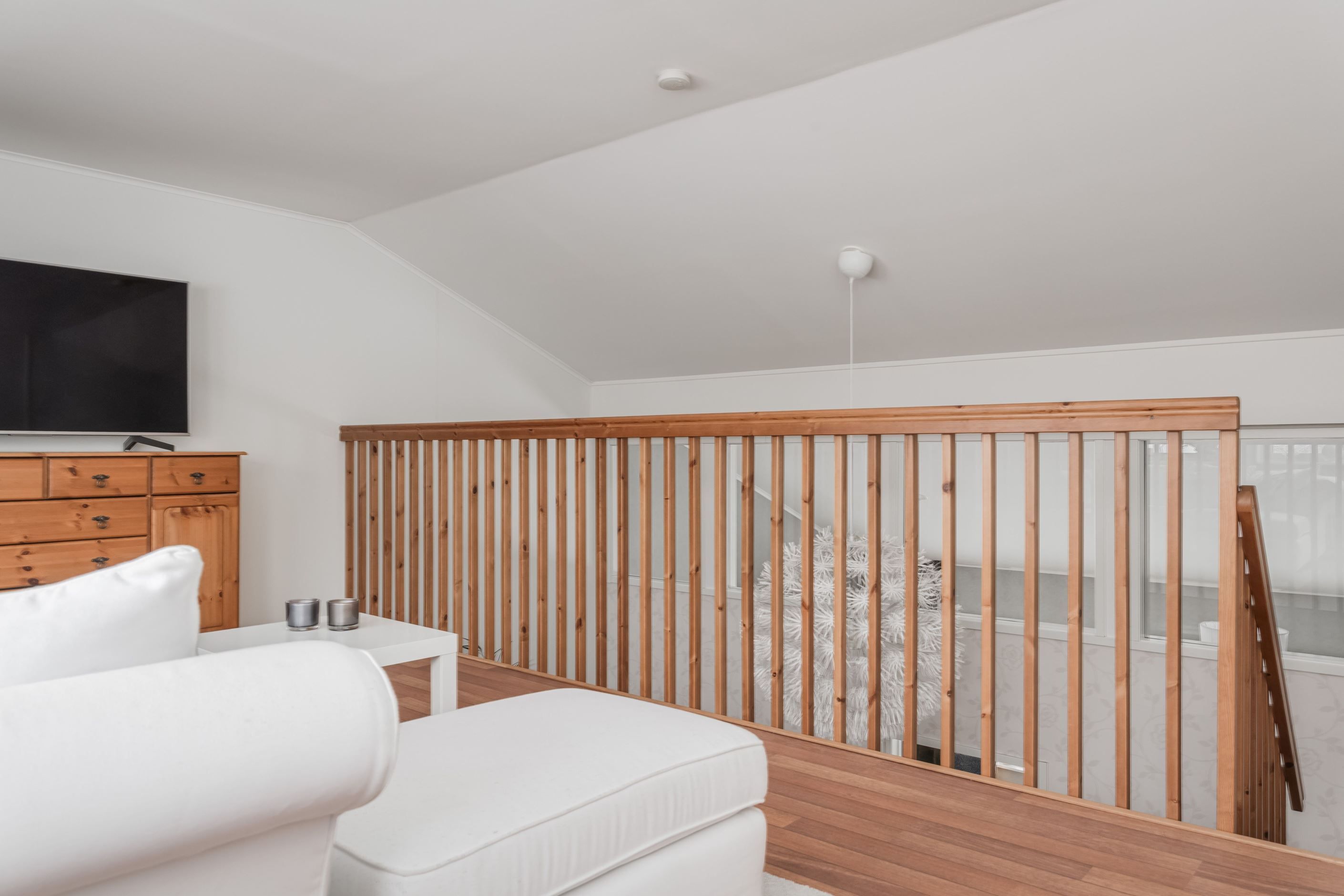 På övre plan möts du av två rymliga sovrum med tillhörande garderober, båda med fransk balkong som ger fint ljusinsläpp och en luftig känsla. Här finns även ett trivsamt allrum. Det övre badrummet är helkaklat och utrustat med badkar. Dessutom finns ett härligt loft som med fördel kan användas som allrum, sovrum eller hemmakontor – ett flexibelt utrymme som anpassas efter dina behov.