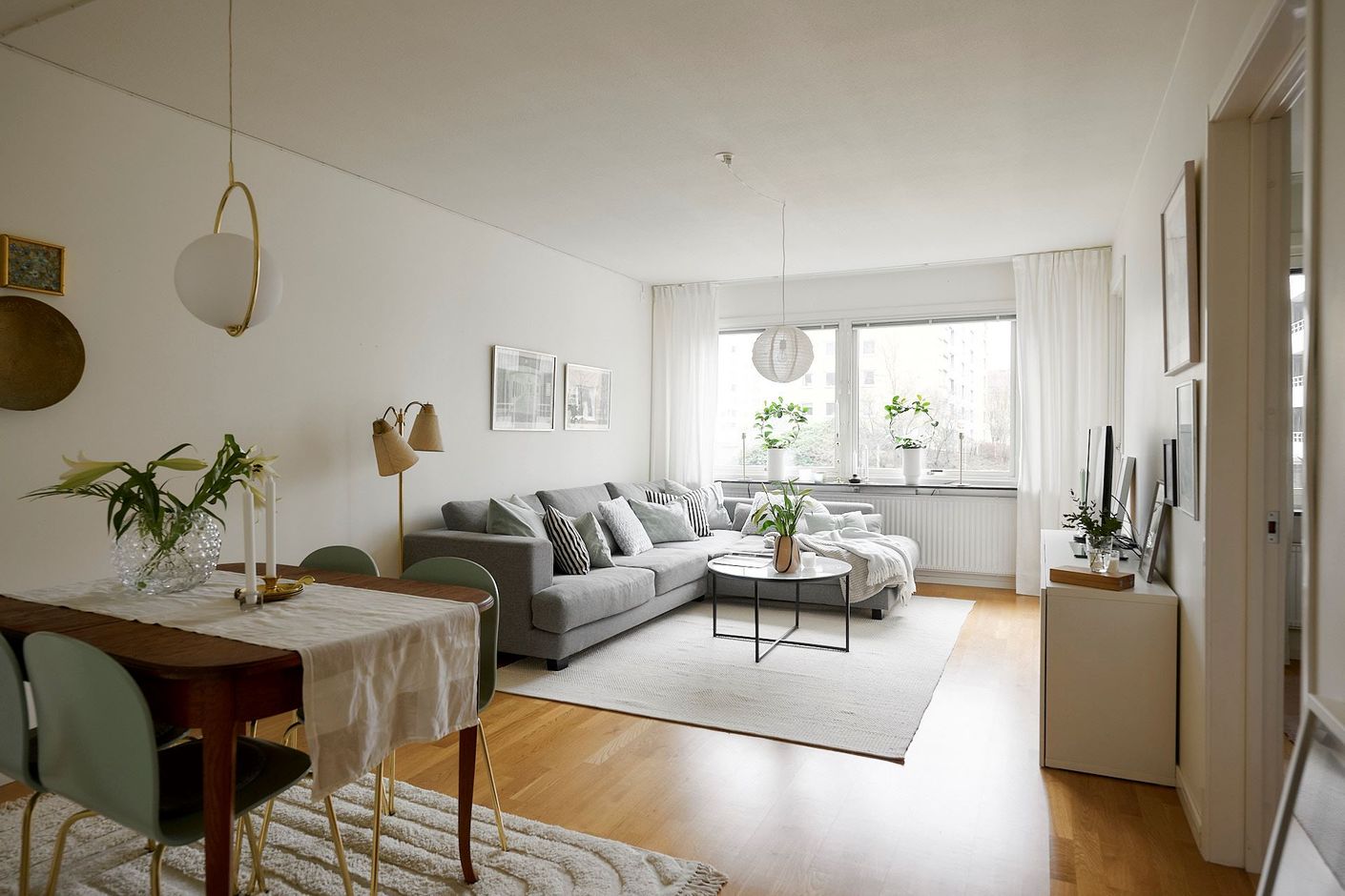 Genomgående ljusa golv samt stora fönsterpartier gör att ljuset flödar.
