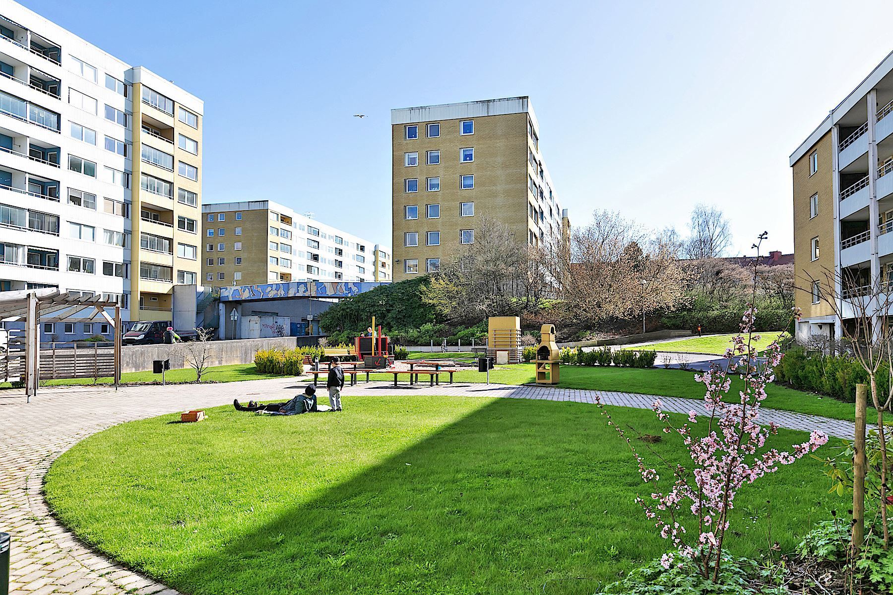 Lugnt område med grönområden, lekplatser samt spårvagnshållplats några minuter bort.