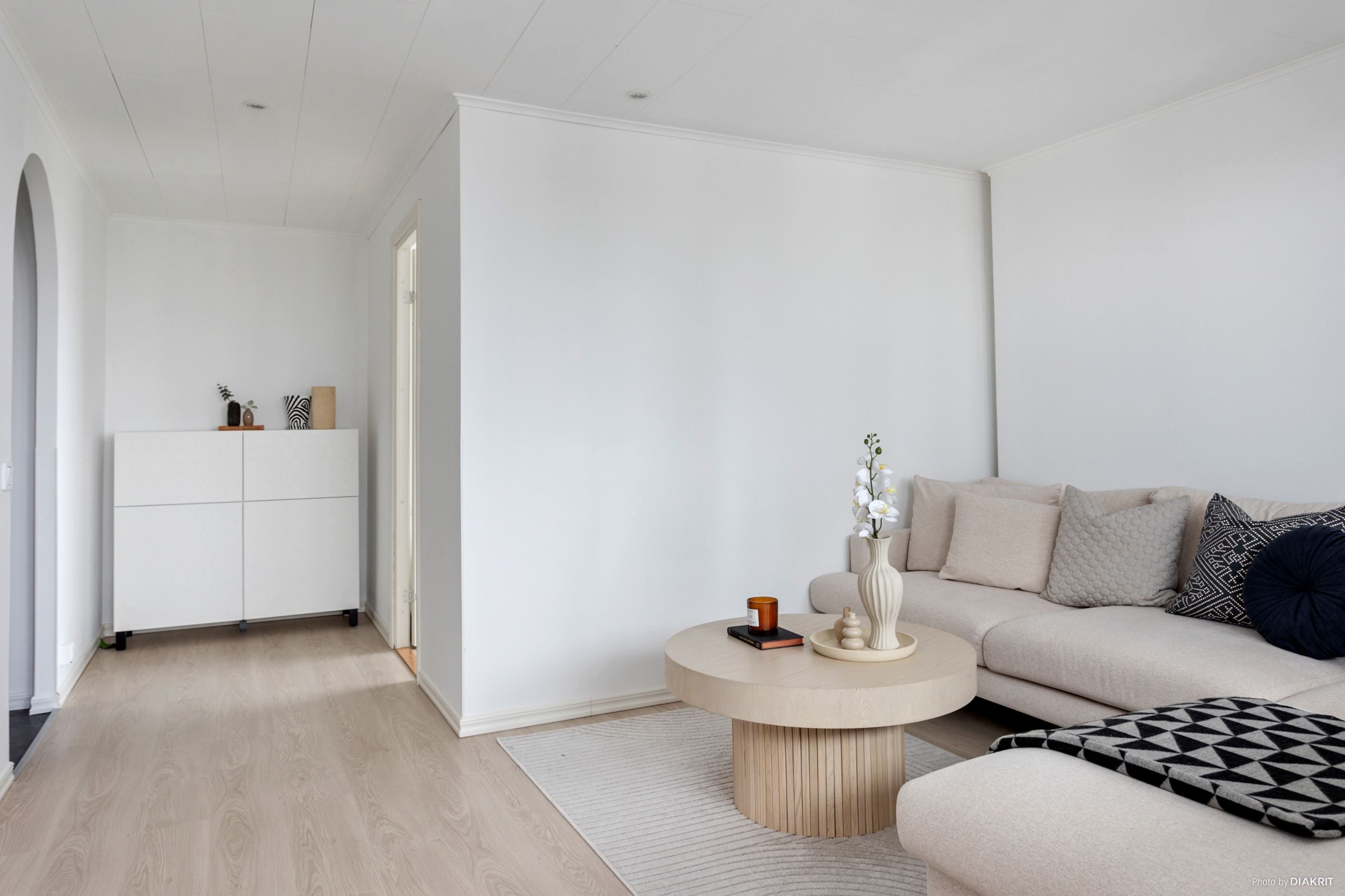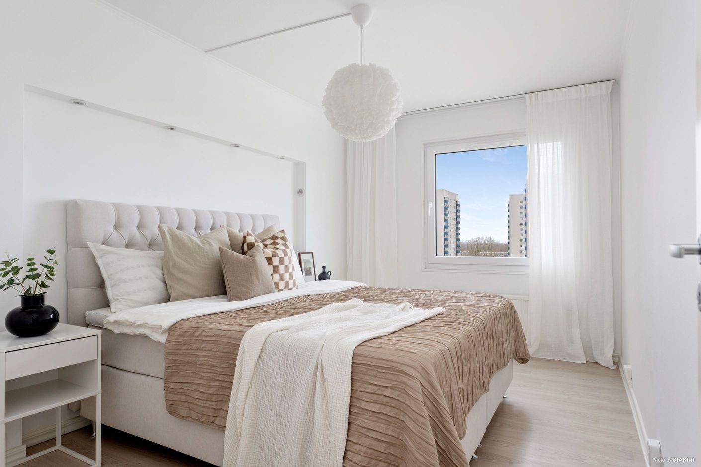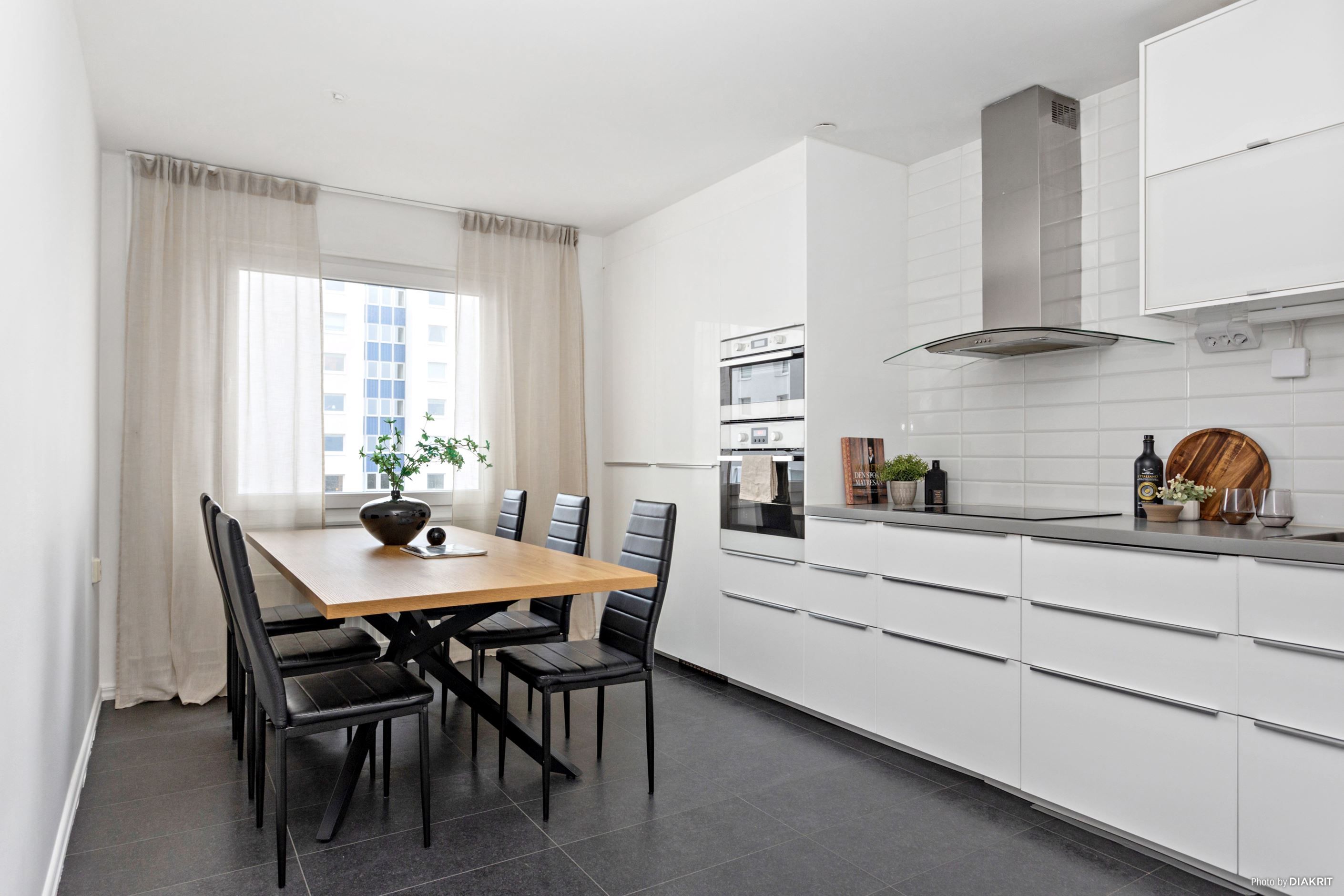 Välkommen till en ljus och hemtrevlig trea på 64 kvadratmeter, belägen på elfte våningen med härlig utsikt över området. Här bor du i en välplanerad lägenhet där varje rum känns luftigt och lätt att möblera. Det moderna köket har en stilren vit inredning och är utrustat med spishäll, fläkt, fullstor kyl och frys samt inbyggd ugn och mikro. Här finns gott om arbetsyta och plats för ett större matbord, perfekt för både matlagning och umgänge.