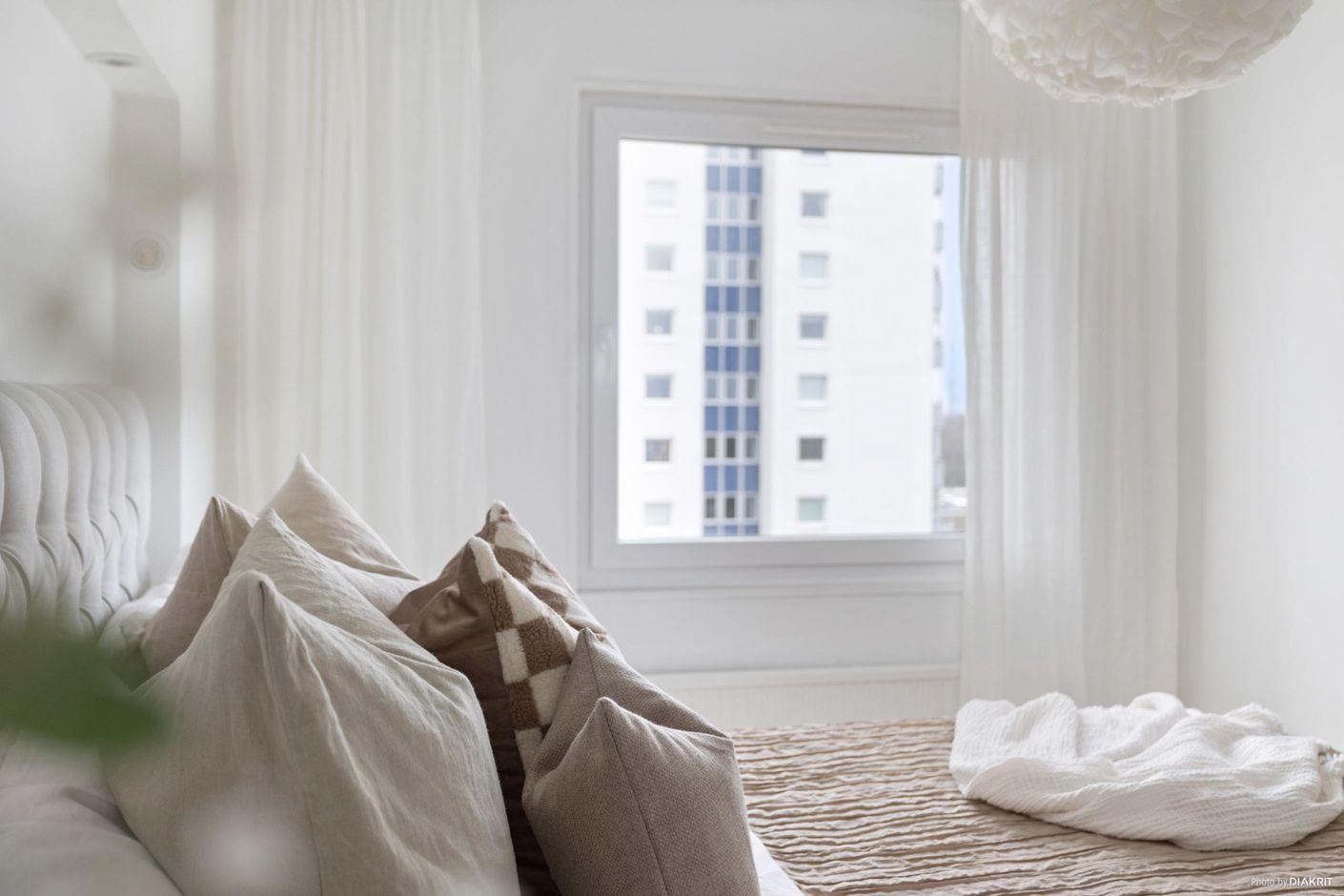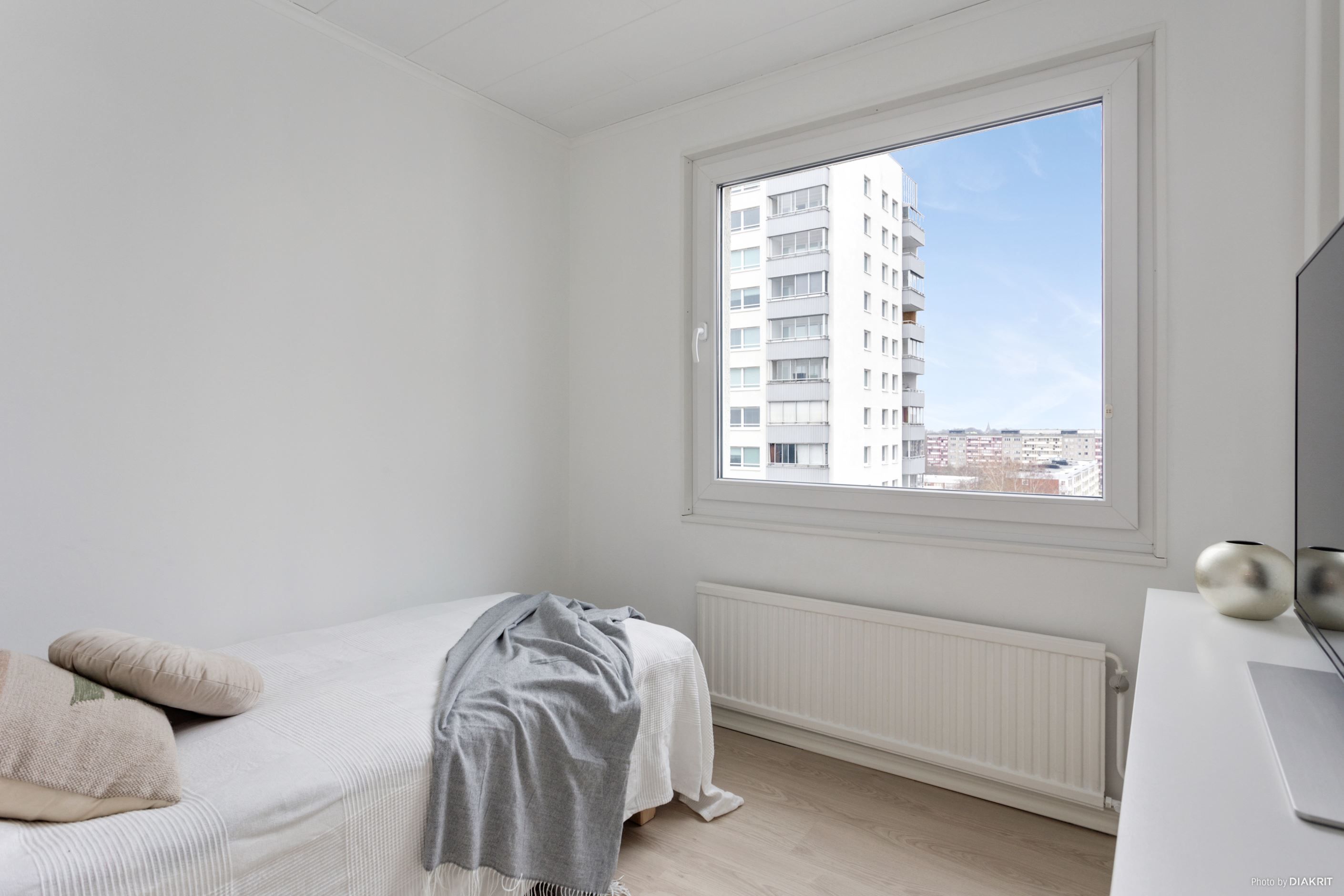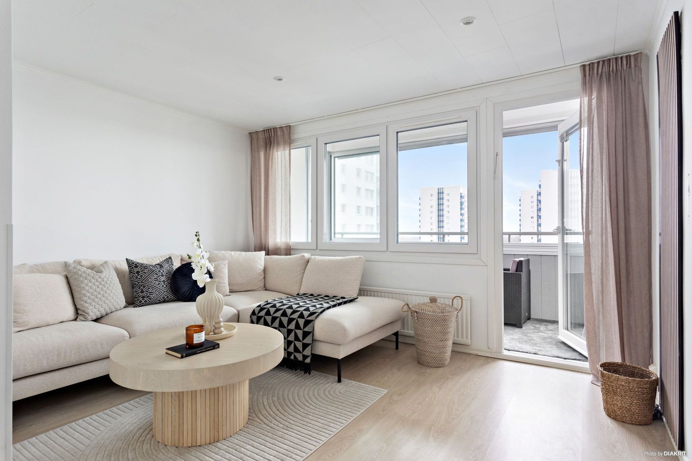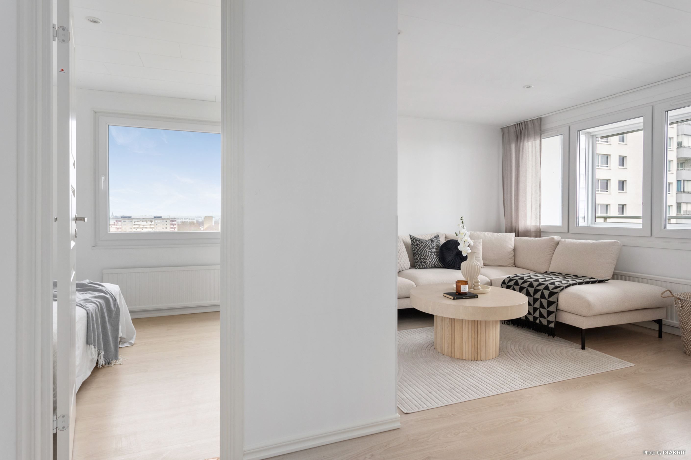 Välkommen till en ljus och hemtrevlig trea på 64 kvadratmeter, belägen på elfte våningen med härlig utsikt över området. Här bor du i en välplanerad lägenhet där varje rum känns luftigt och lätt att möblera. Det moderna köket har en stilren vit inredning och är utrustat med spishäll, fläkt, fullstor kyl och frys samt inbyggd ugn och mikro. Här finns gott om arbetsyta och plats för ett större matbord, perfekt för både matlagning och umgänge.