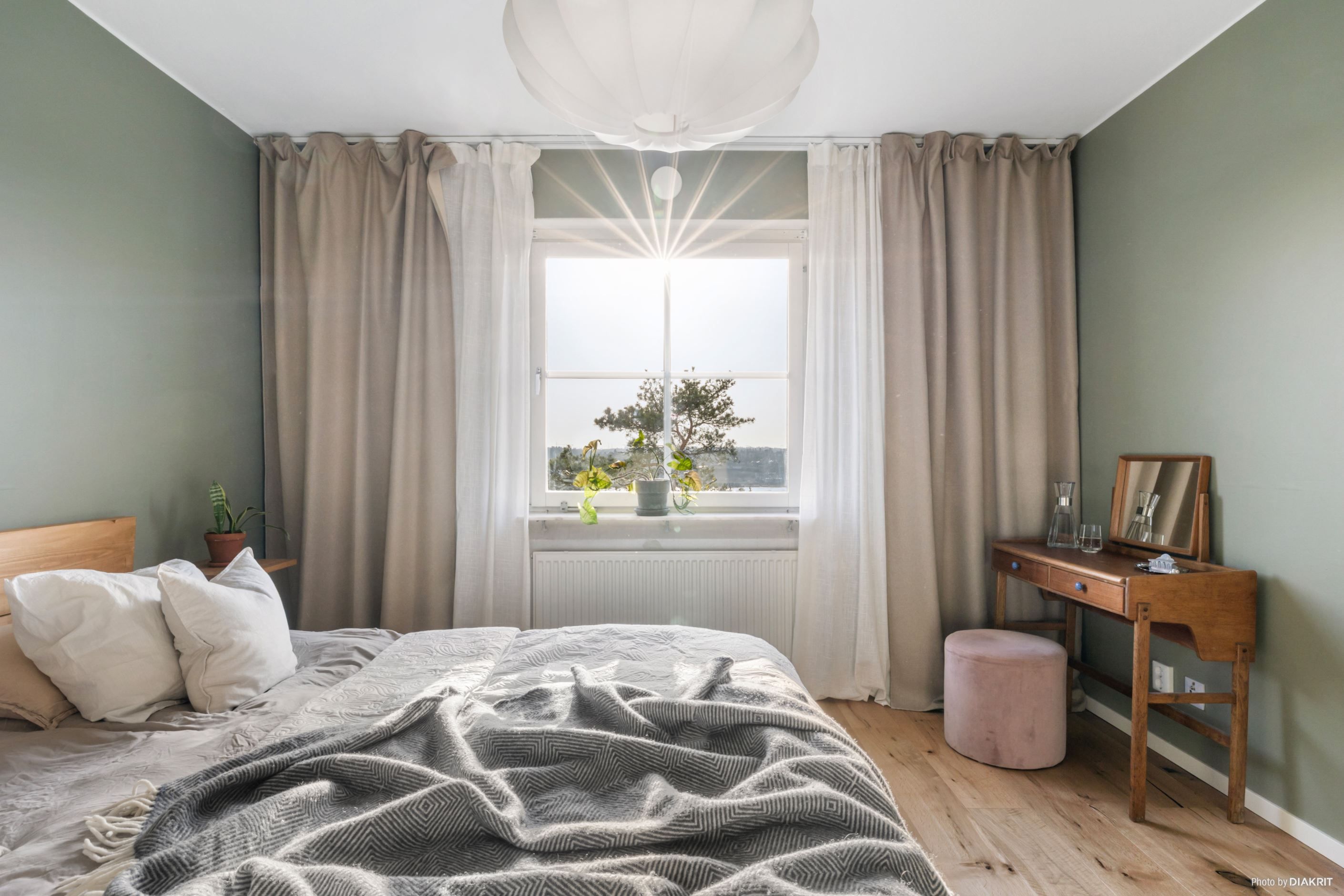 Stort sovrum med enstavs ekparkettgolv och slätspacklade väggar målade i färgtonen nougat.