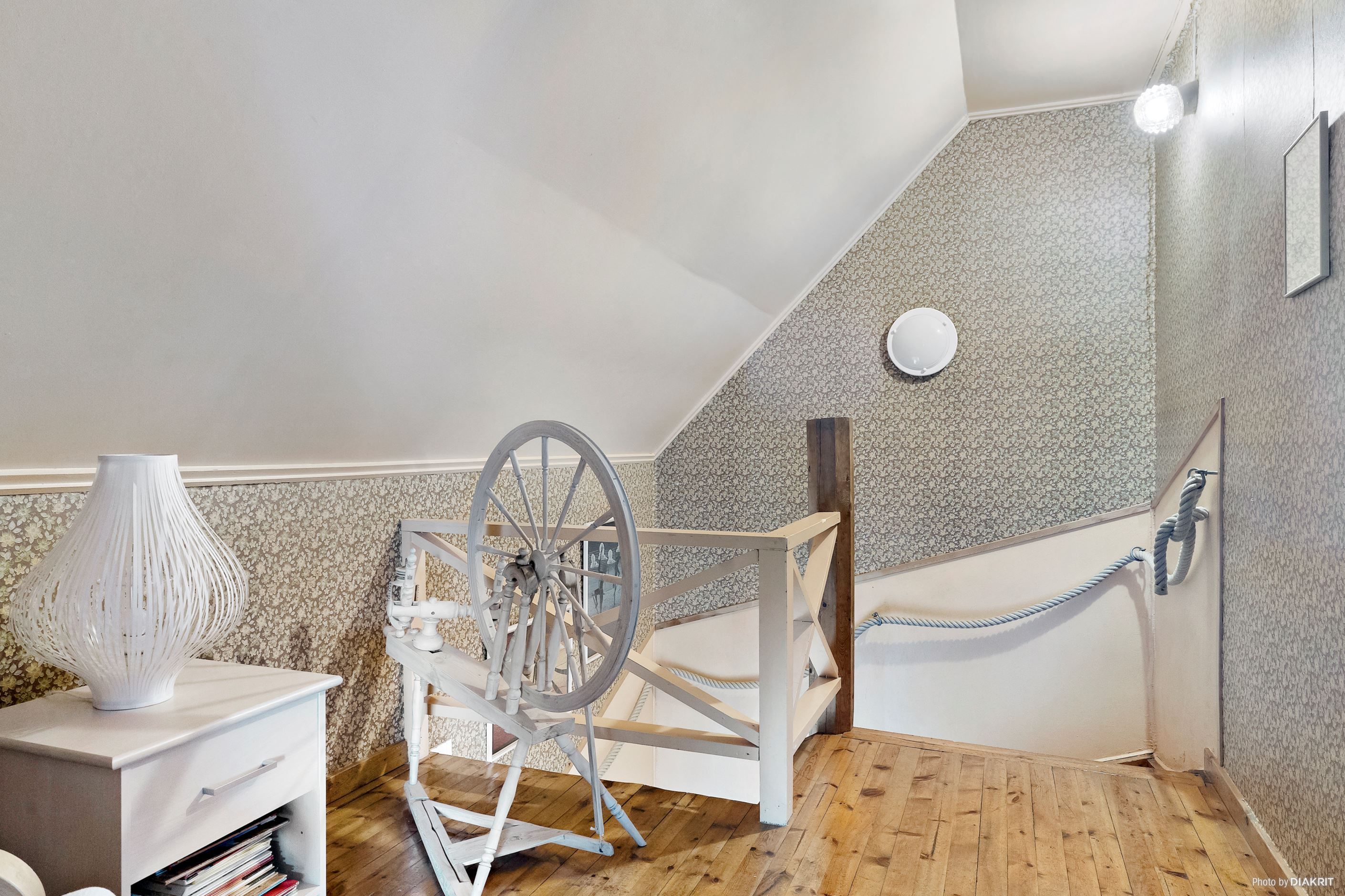 På övervåningen finner man två sovrum. Sovrum 1 har trägolv, väggar klädda i halvpanel och tapet och sovrummet har ett fint ljusinsläpp tack vare ett stort fönster. I detta sovrum finner man dessutom ytterligare en vedspis som också går att använda och ett förrådsutrymme. Sovrum 2 har trägolv, tapetserade väggar och två förrådsutrymmen. Även här finns också ett stort fönster som ger ett fint ljusinsläpp.