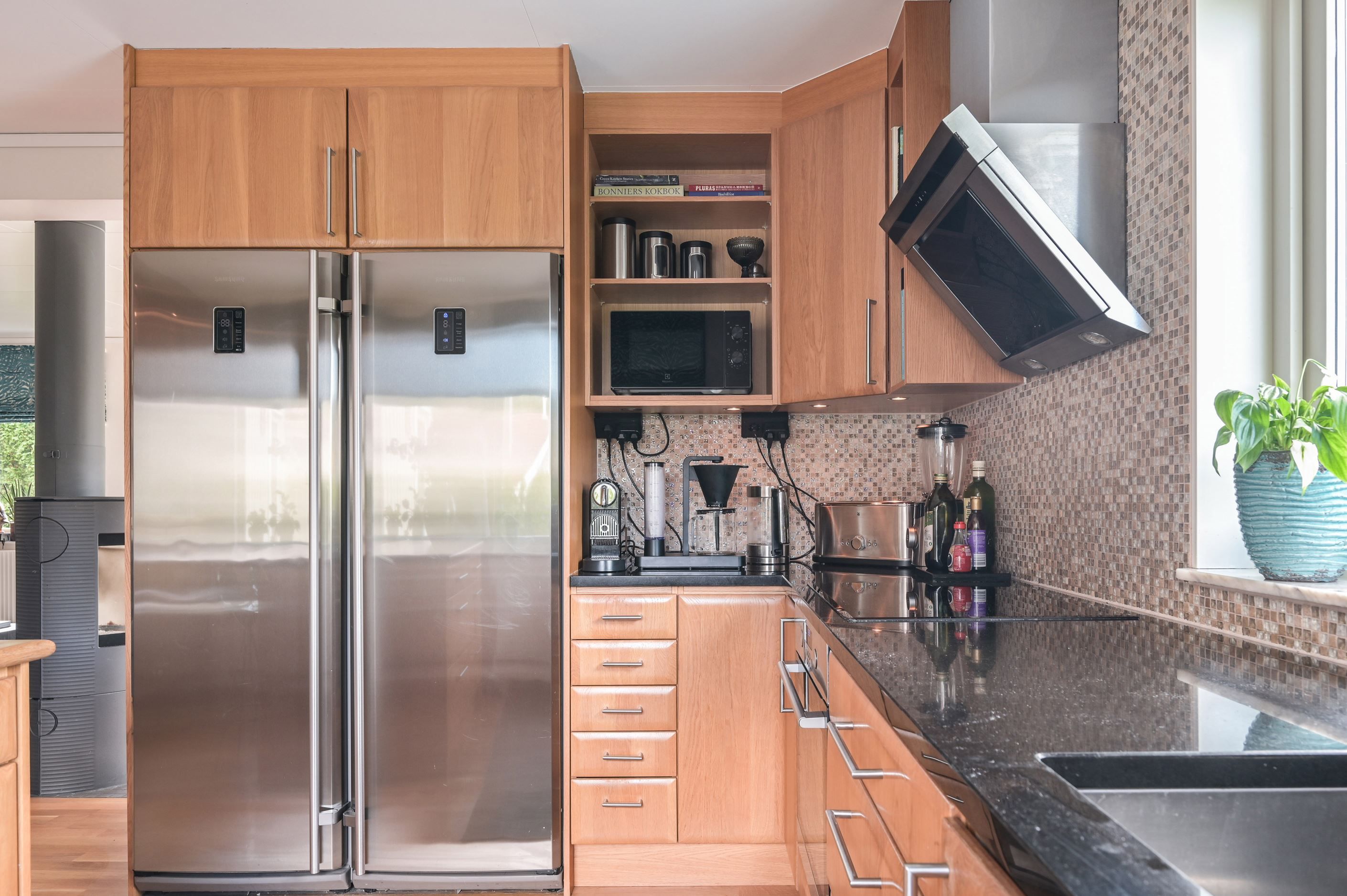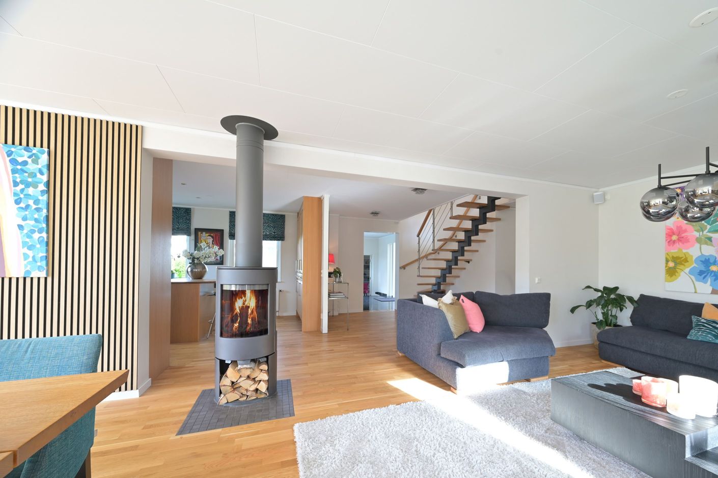 KÖK i trivsam öppen planlösning mot det inbjudande vardagsrummet. Bra förvaringsmöjligheter och arbetsyta i köket samt en köksö. Köket är i massiv ek tillsammans med en svart bänkskiva i granit. Infälld belysning, vitmålade väggar och parkettgolv. Den maskinella utrustningen består av induktionshäll, ugn (2011), fläktkåpa, inbyggd diskmaskin (2023), micro, kyl och frys (2012). VARDAGSRUM med fönster i flera väderstäck och två utgångar till altan vilket gör rummet mycket ljust och trivsamt. Här finns bra plats för soffgrupp samt matbord. Hög mysfaktor med braskaminen. Vitmålade väggar, vacker panel vid matsalsdelen och parkettgolv. Luftvärmepump med kyla (2019).