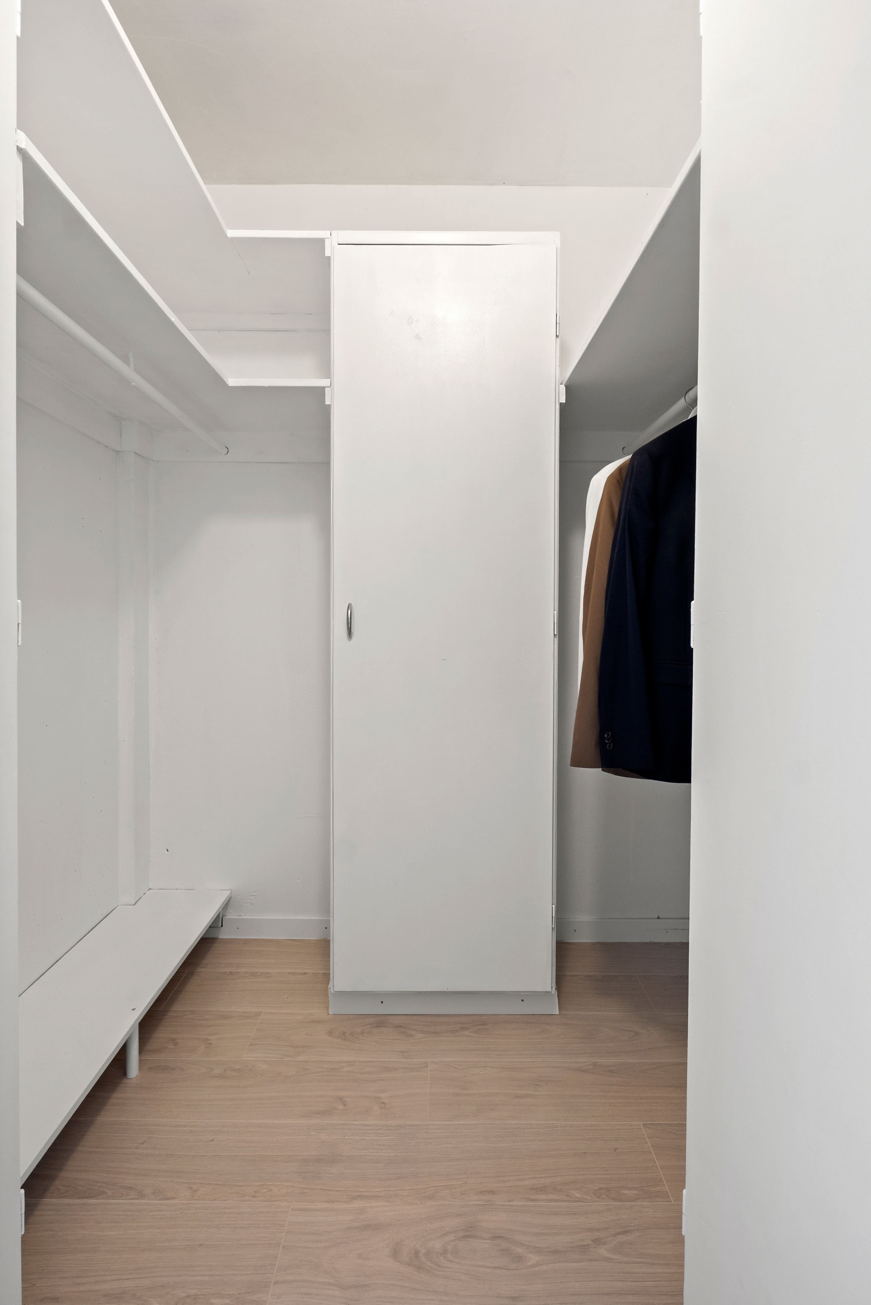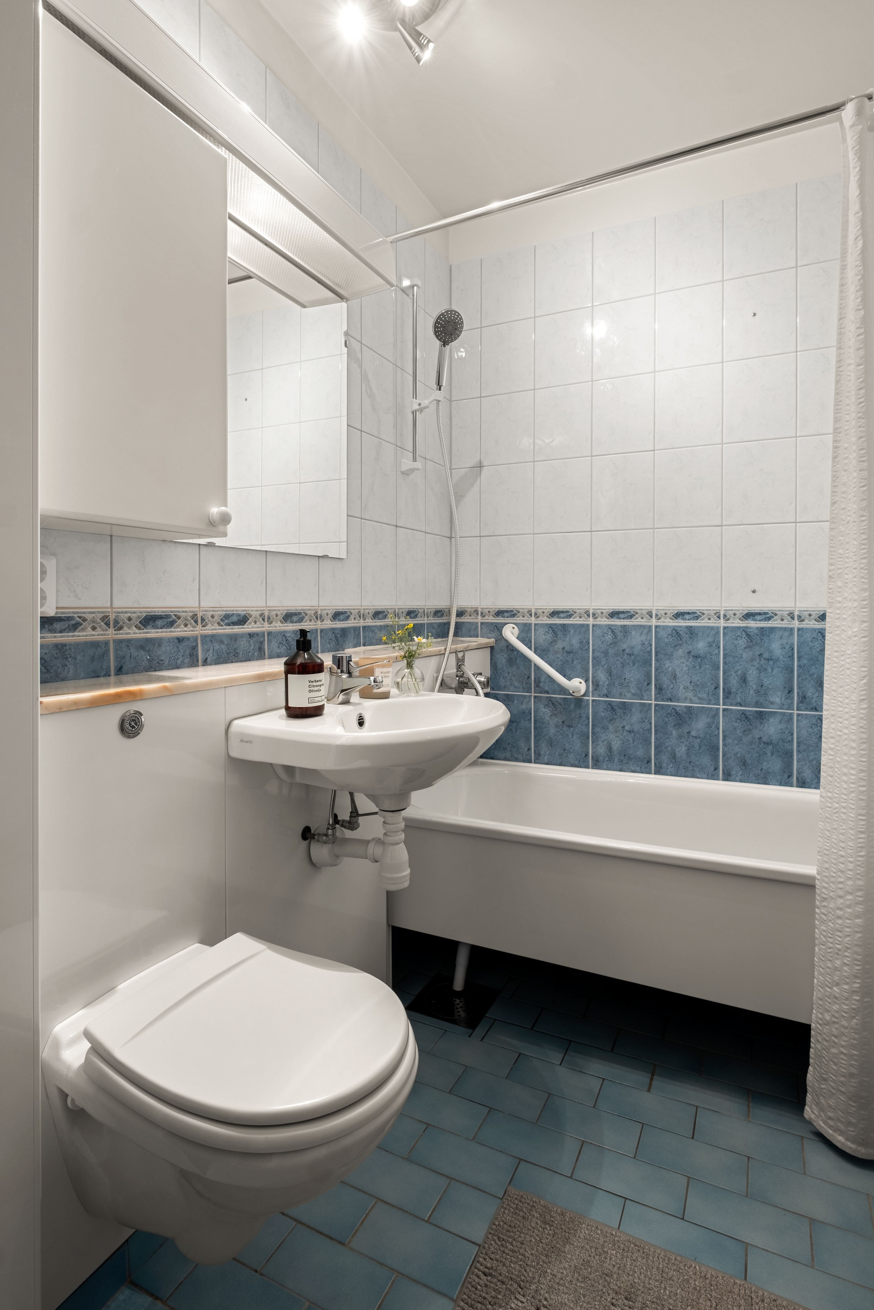 Den inglasade balkongen erbjuder en privat oas med eftermiddags- och kvällssol, perfekt för avkoppling eller sociala stunder. Här finns också ett helkaklat badrum med badkar samt förberett för tvättmaskin och en uppskattad klädkammare.