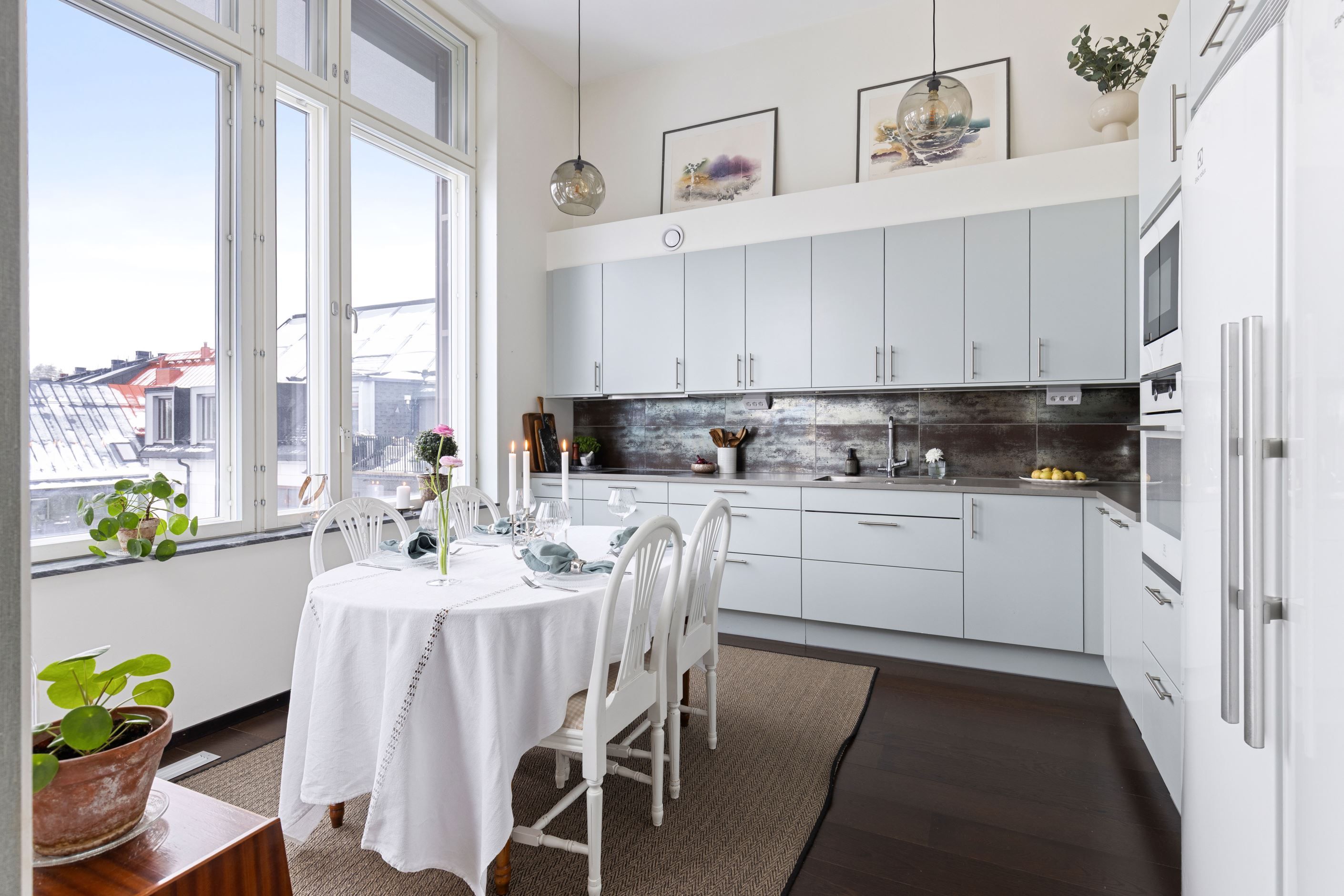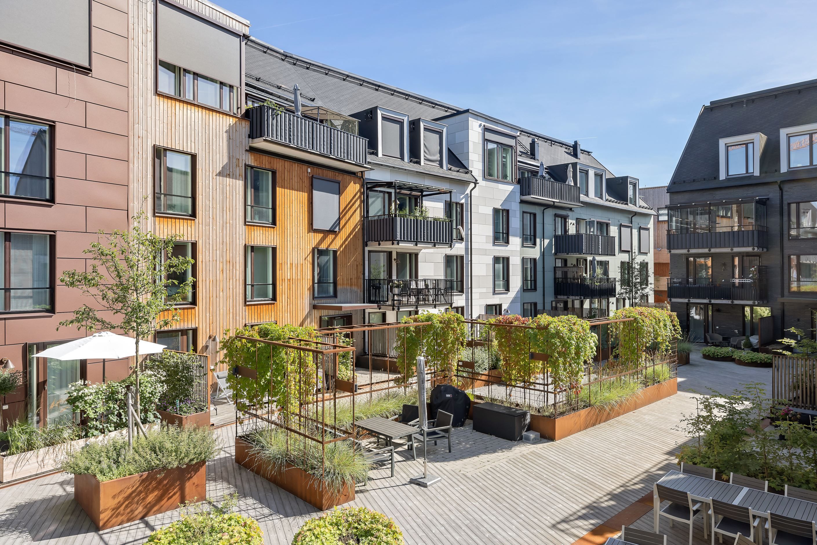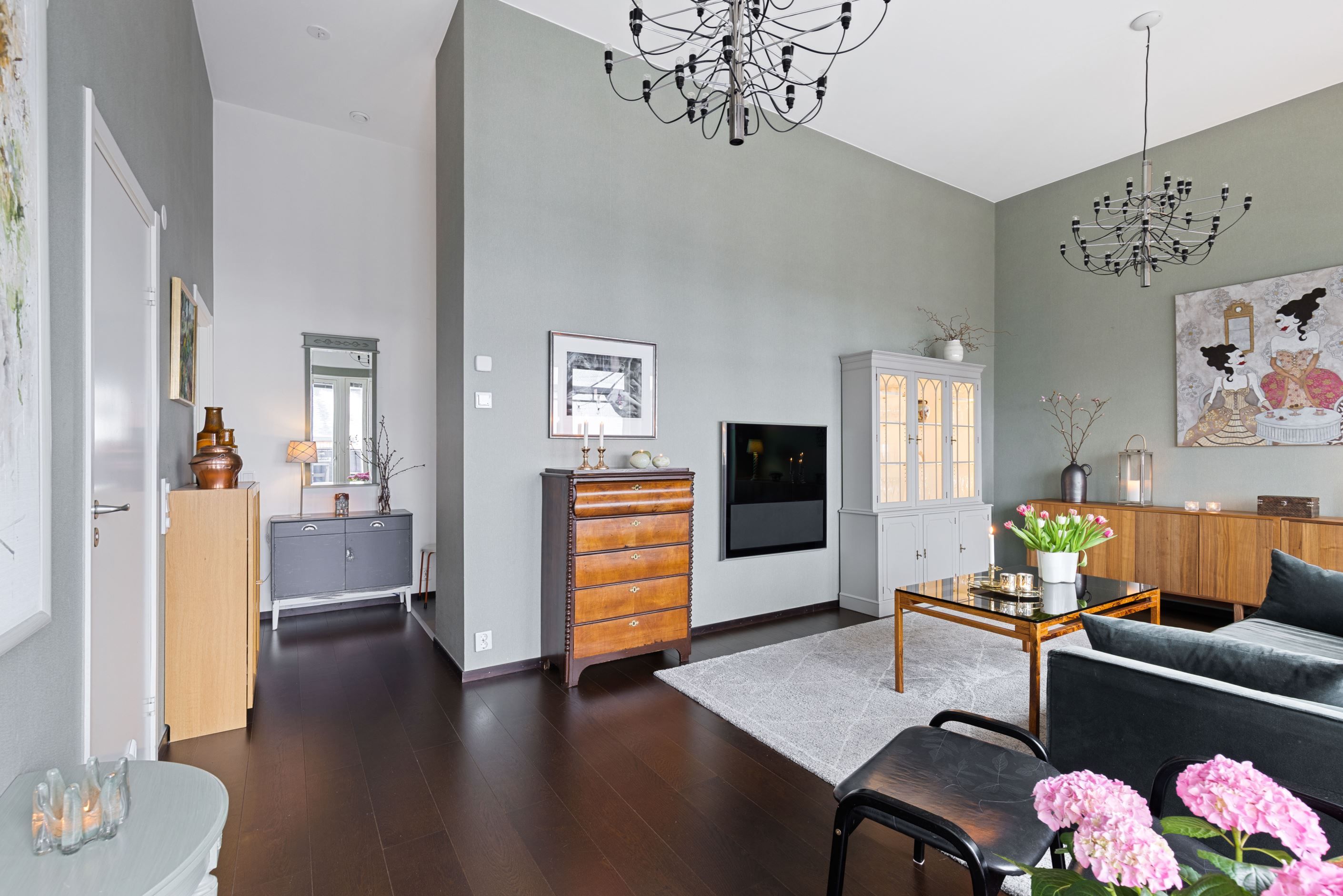 Imponerande vindsvåning med stor, solrik takterrass som ligger mot föreningens vackra innergård. Här möts ljus, rymd och genomtänkt design i en exklusiv bostad med modern och stilren känsla. Den generösa takhöjden på upp till 3,7 meter, stora fönsterpartier i full höjd och charmiga takkupor skapar ett härligt ljusinsläpp och en luftig atmosfär. Den rymliga takterrassen har ett utmärkt solläge och blir en självklar plats för avkoppling, trevliga middagar eller en stilla stund med kaffekoppen i solen.