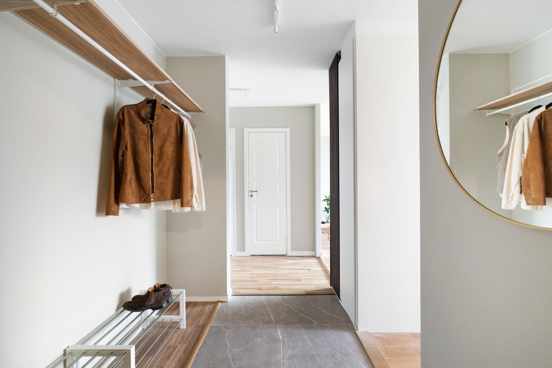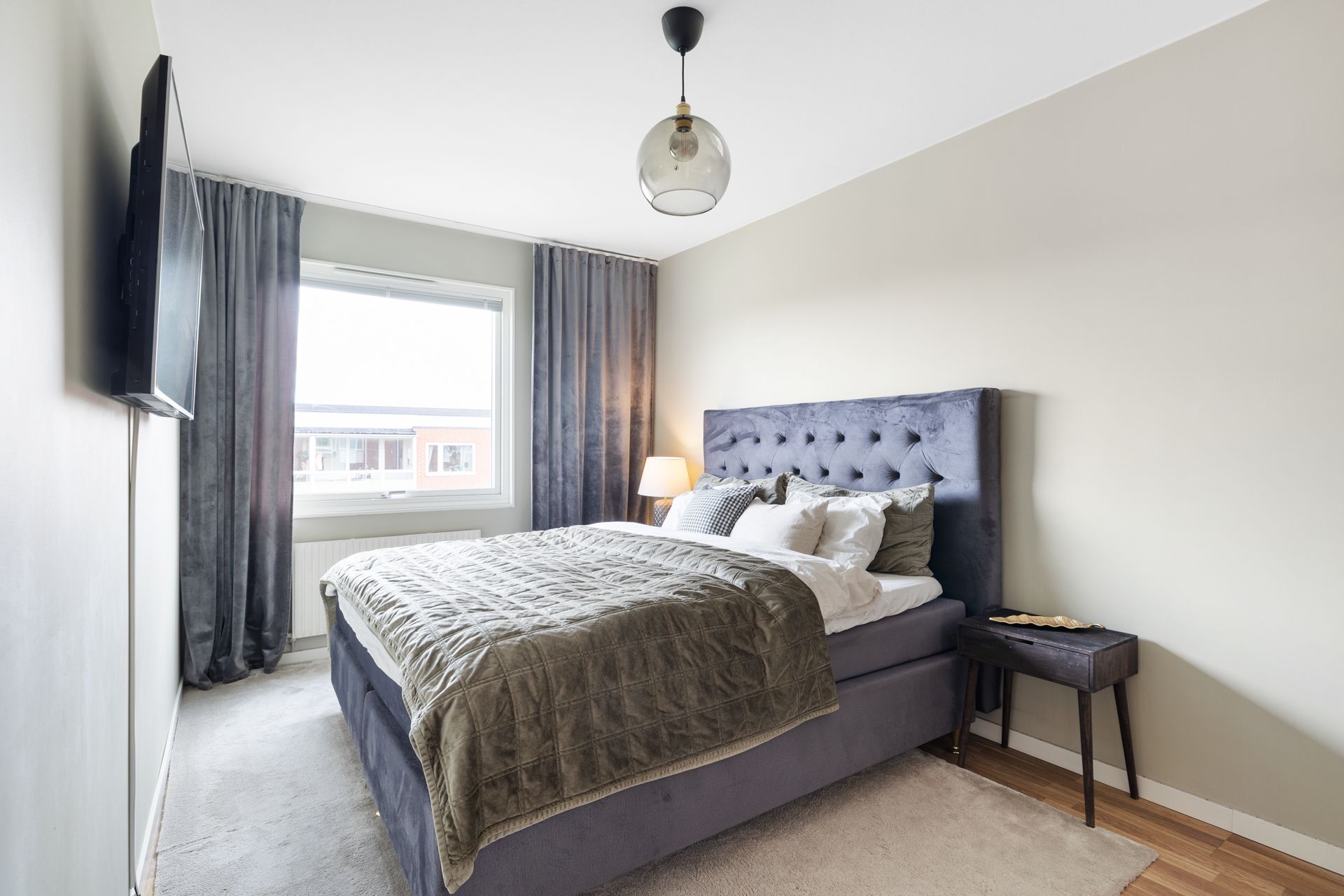 De två sovrummen ligger avskilt från de sociala ytorna och ger en tydlig uppdelning mellan umgänge och vila. Det större sovrummet har dessutom en rymlig klädkammare som passar perfekt som walk-in-closet. Badrummet är stilrent och funktionellt med tvättmaskin, torktumlare och gott om plats. Förvaringen är generös – både i lägenheten och i tillhörande förråd.