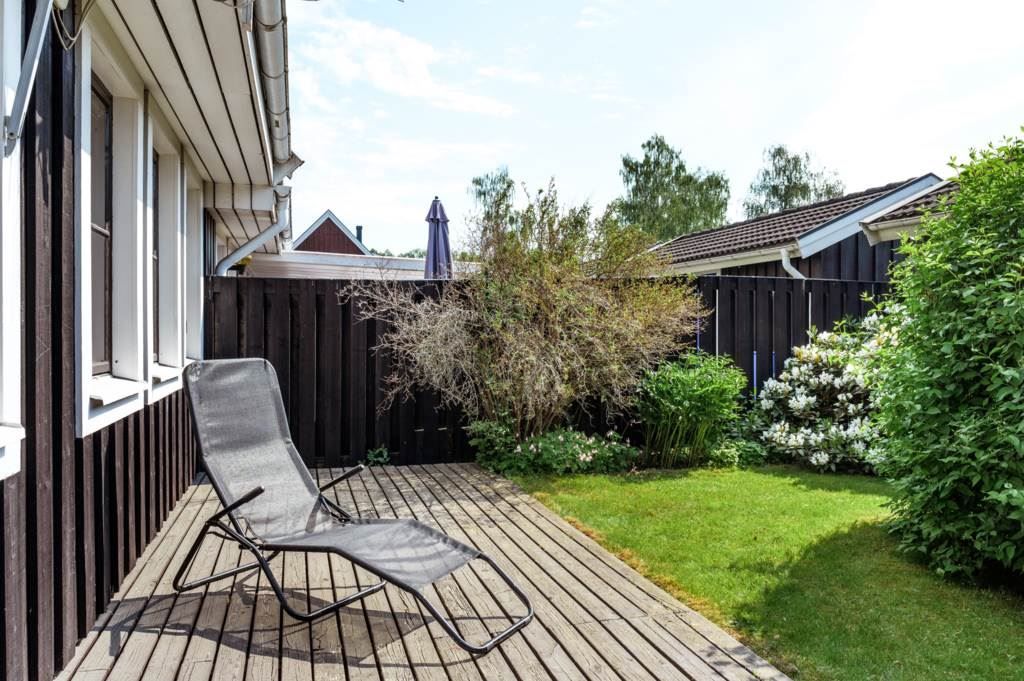 Den lättskötta trädgårdstomten bjuder på en trevlig uteplats i soligt läge. Här finns även buskar, rabatter och utrymme för både barnens aktiviteter och lugna stunder i solen. Till huset hör även ett enkelgarage med motordriven port och ett förråd på baksidan. Baksidan vetter mot en allmänning.