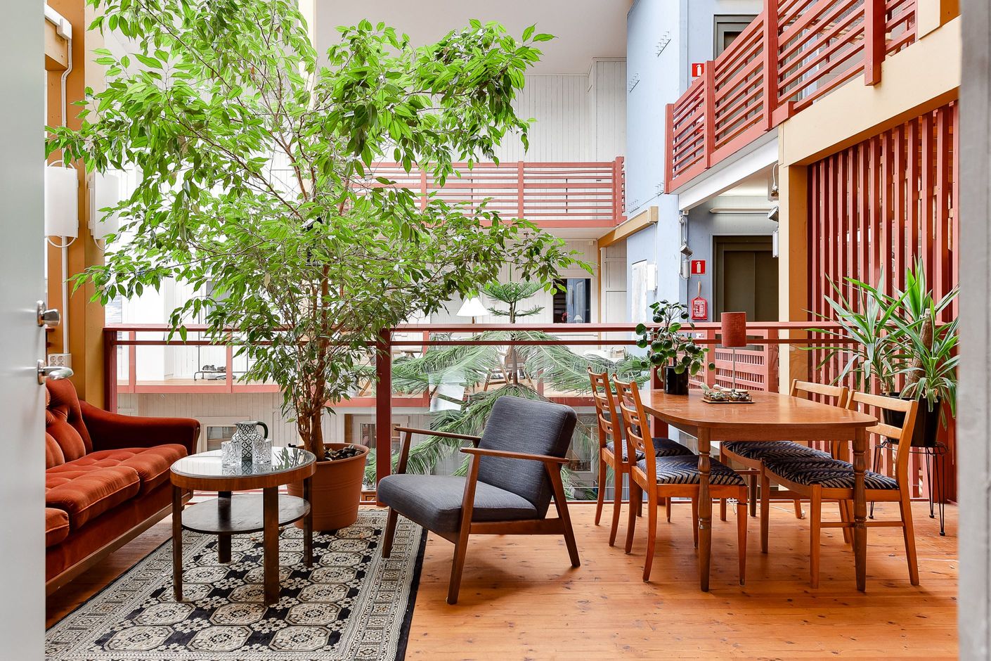 Nu erbjuds en sällsynt chans att förvärva en imponerande 3:a i detta eftertraktade hus. Bostaden är en rymlig och välplanerad och disponerar 89 kvm med genomgående ekparkettgolv och generösa ytor för flexibel möblering. Det stora vardagsrummet erbjuder gott om plats för soffgrupp och matplats, och från rummet nås även den härliga balkongen. Köket är trivsamt med bra arbetsytor och förvaring, och bostaden rymmer två sovrum samt ett helkaklat badrum med duschhörna och egen tvättdel. Ett av hemmet stora plus är de två uteplatserna: en balkong i anslutning till vardagsrummet och en altan precis utanför lägenhetens entré i vinterträdgården – en perfekt plats att njuta av tillvaron, i en härlig grönskande omgivning.