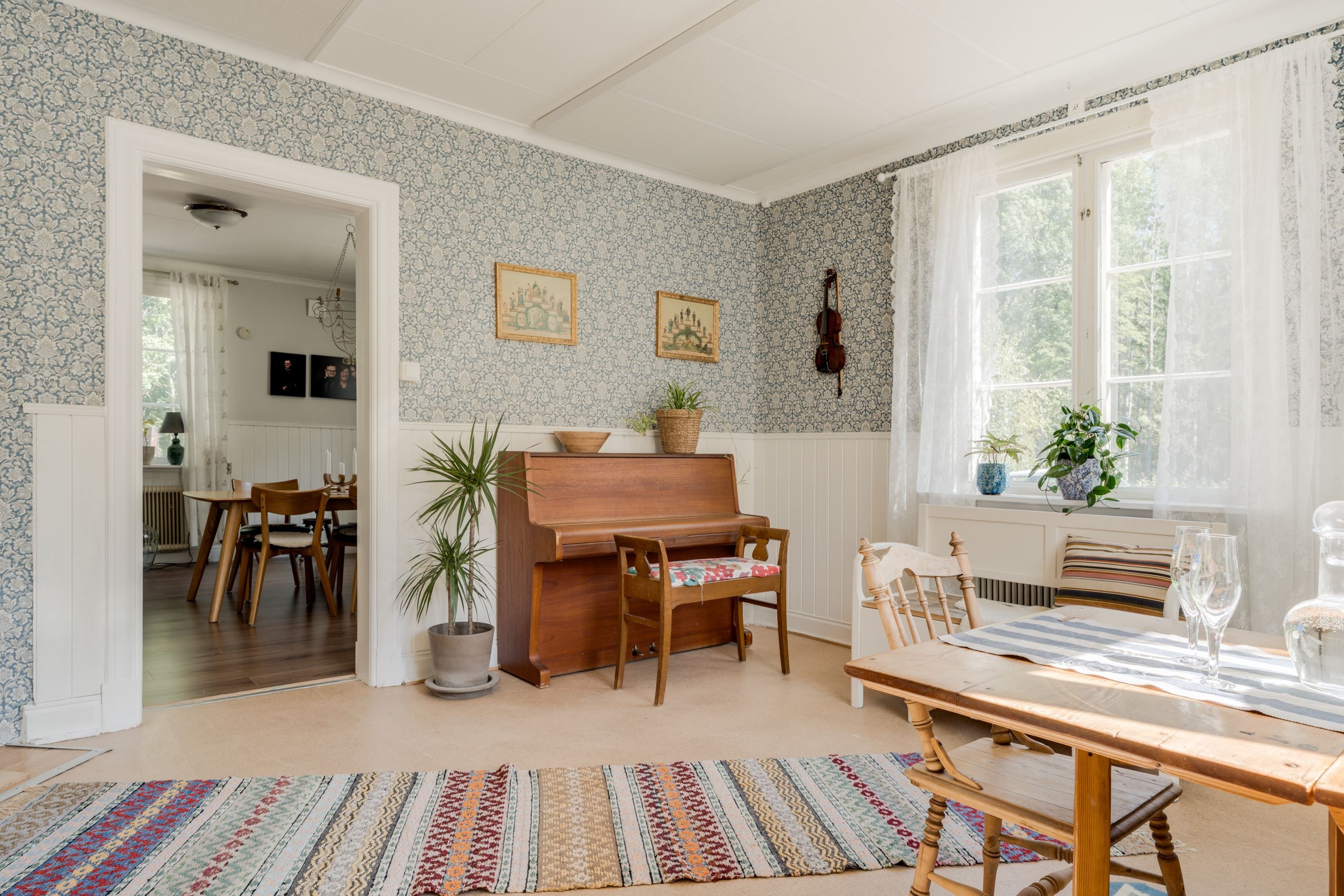 När du kliver in möts du av generösa rum med vackert ljusinsläpp och ett flöde som bjuder in till både vardagsliv och fest. Det rustika tv-rummet med sin retrokaraktär, synliga murstock och värmande kamin ger en ombonad känsla, medan matsalen – med nya ytskikt och vackert golv – är som gjord för långa middagar och sociala tillställningar. Här möts du av ett inbjudande kök som förenar moderna vitvaror med bevarad charm och en stilfull tegelmurstock som ger karaktär. Nuvarande ägare har dessutom låtit bygga ett skafferi i tidstypisk stil, vilket både förstärker husets originalkänsla och erbjuder extra förvaringsutrymme.