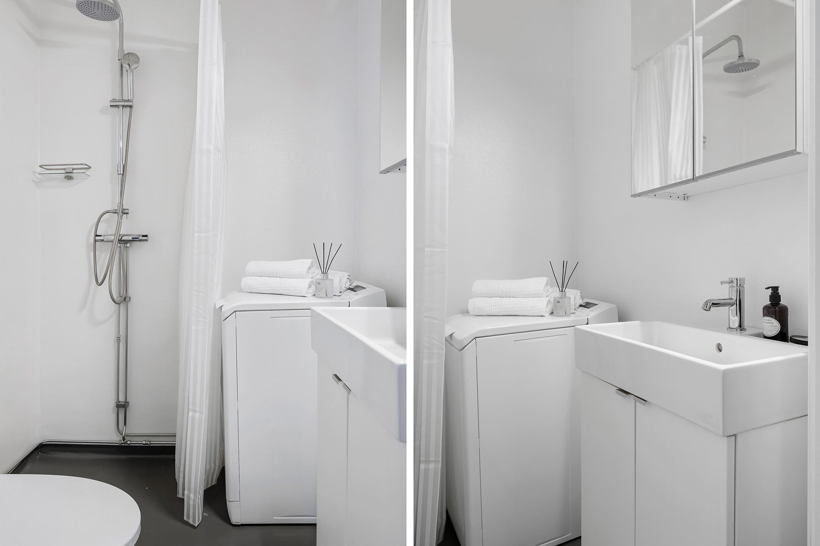 Det fräscha badrummet är ljust och trevligt med tvättmaskin.