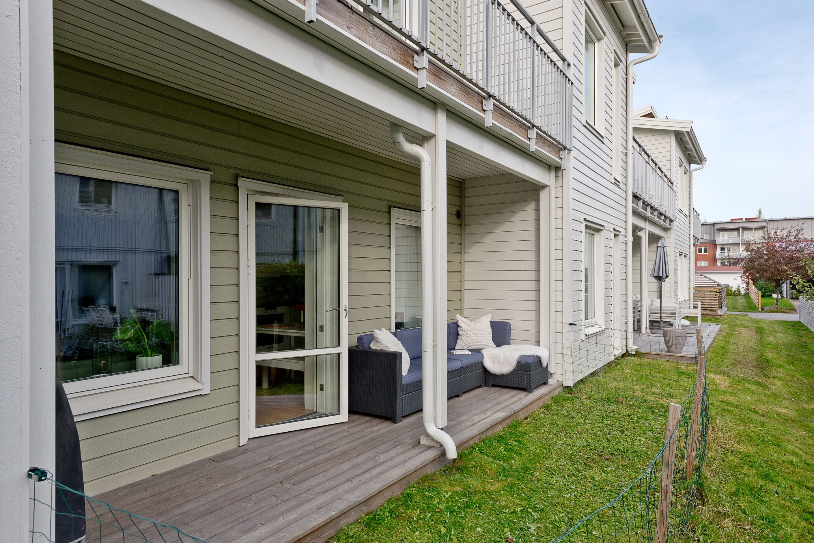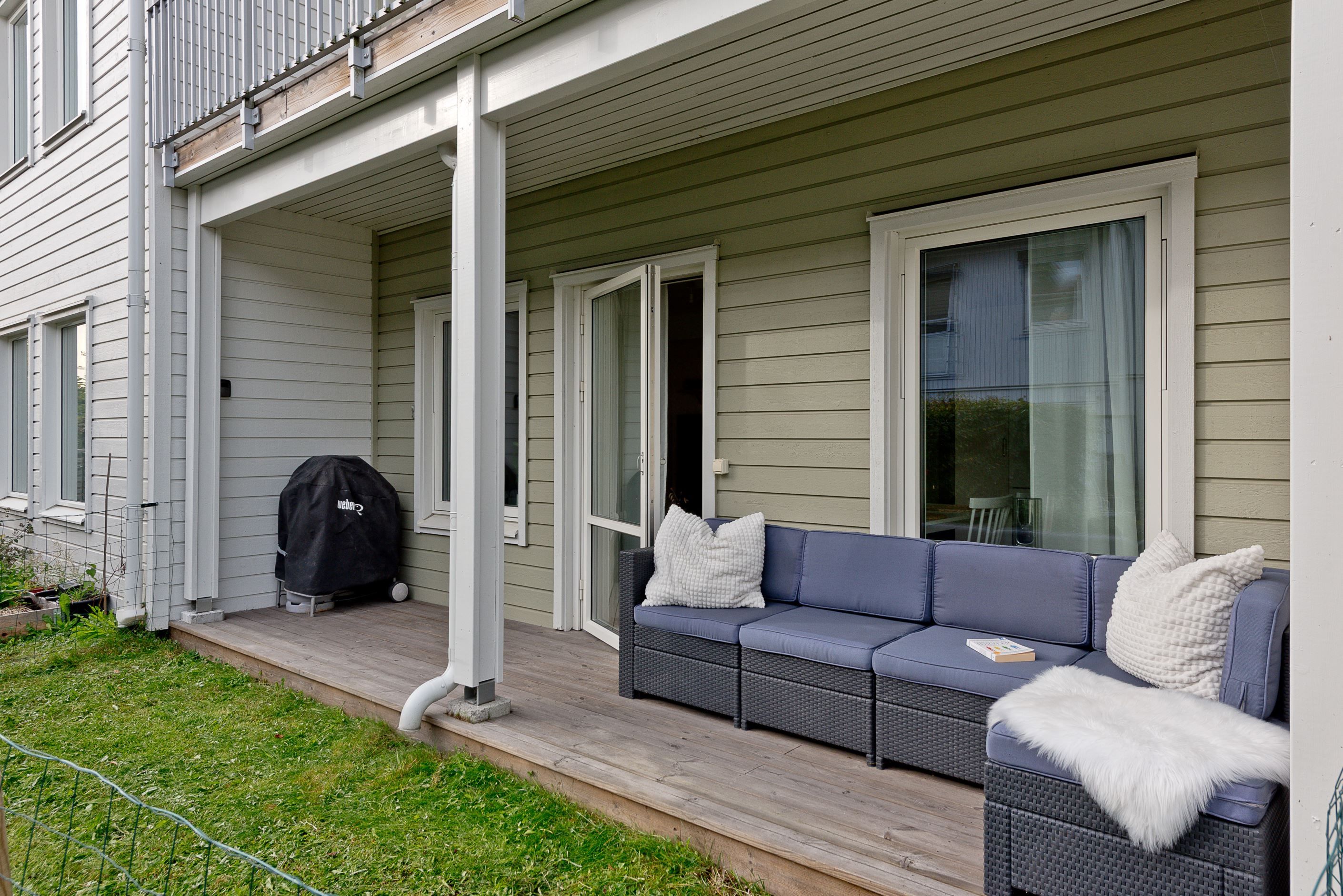 Här möts du av en genomtänkt planlösning där varje kvadratmeter används på bästa sätt. Den egna entrén ger en hemtrevlig känsla redan från start, och inne möts du av en välplanerad bostad med fint ljusinsläpp från de stora fönstren. Uteplatsen gör att du enkelt kan förlänga vardagsrummet utomhus under sommarhalvåret – perfekt för morgonkaffet eller en grillkväll.