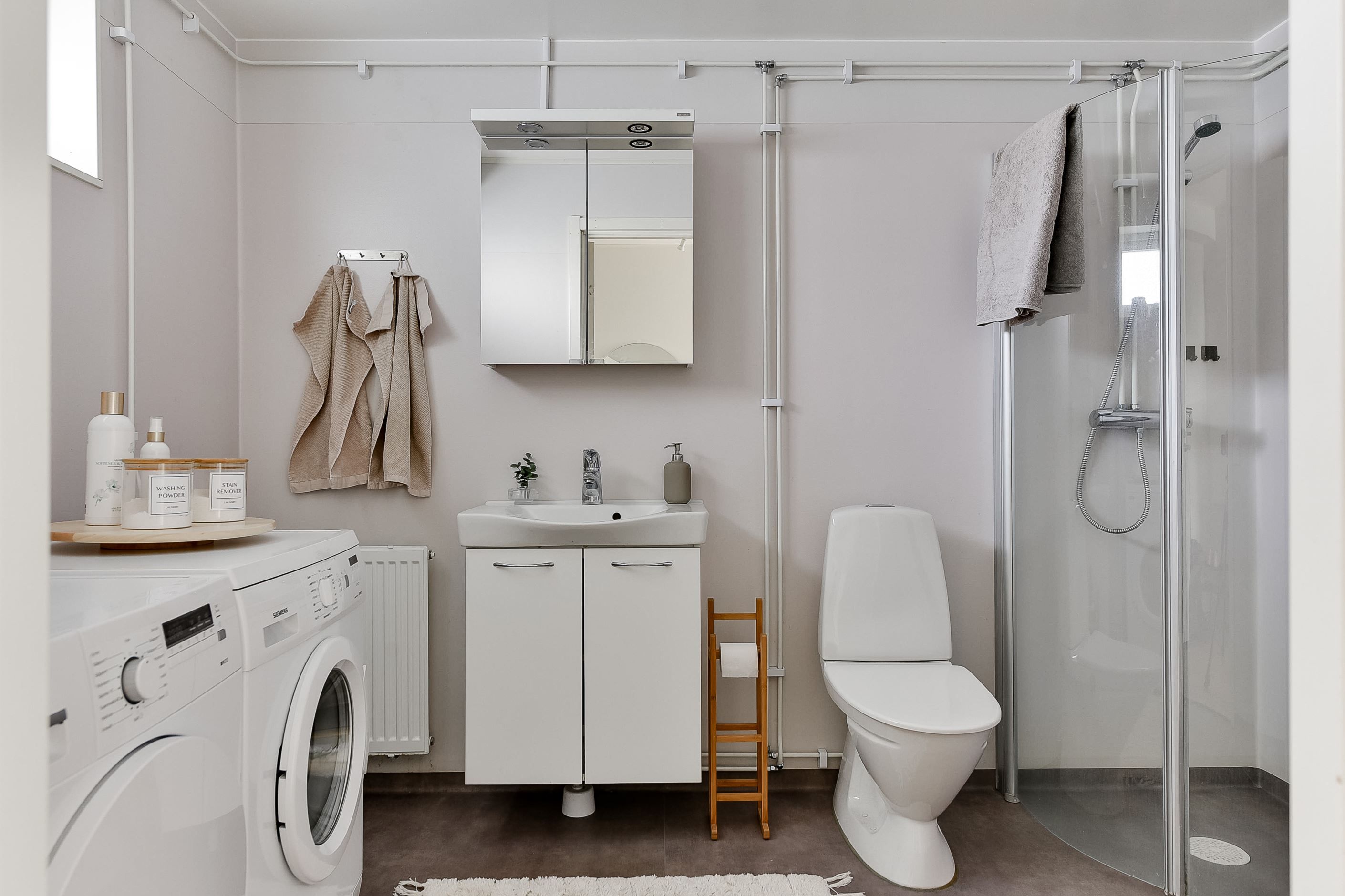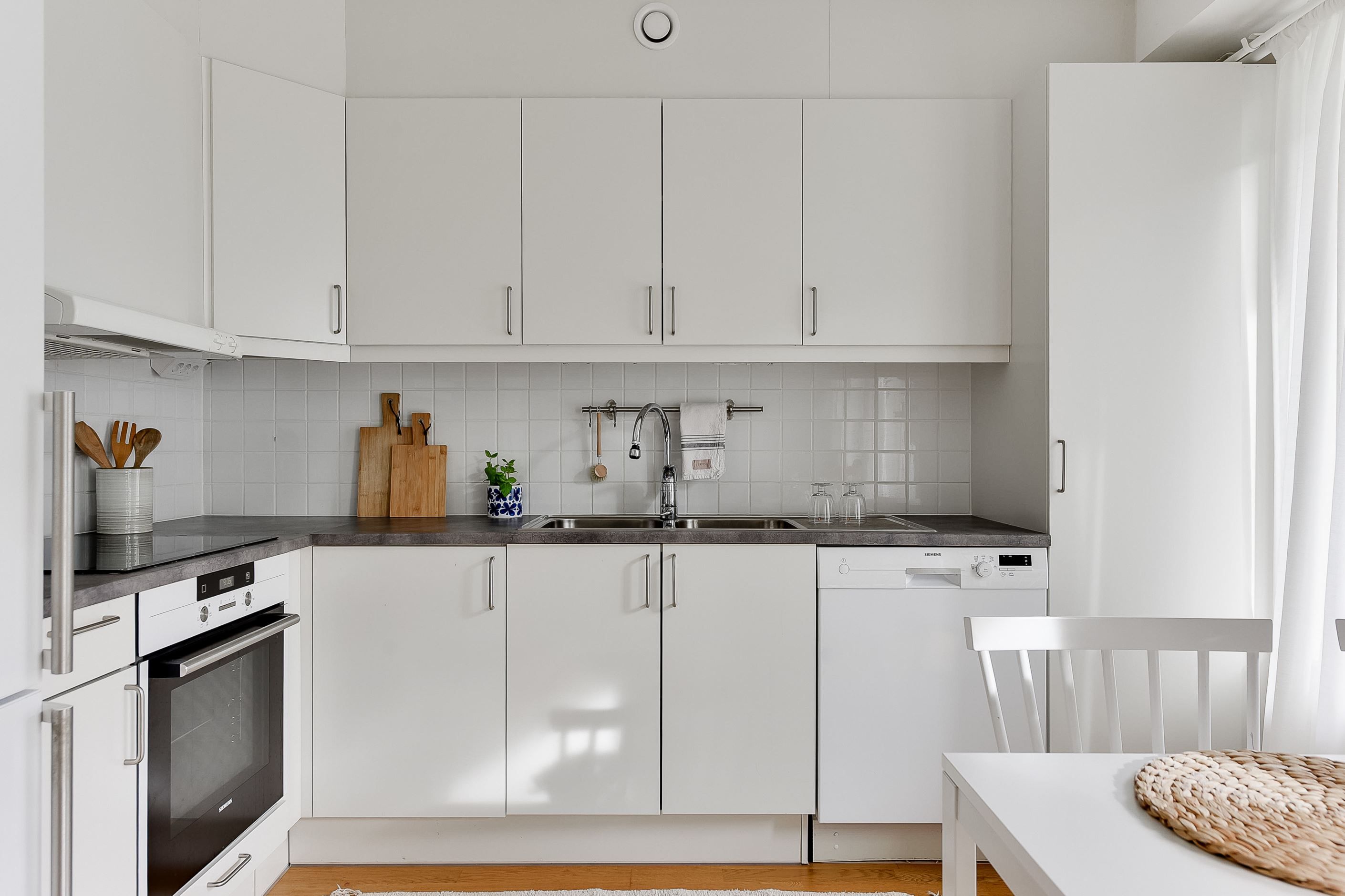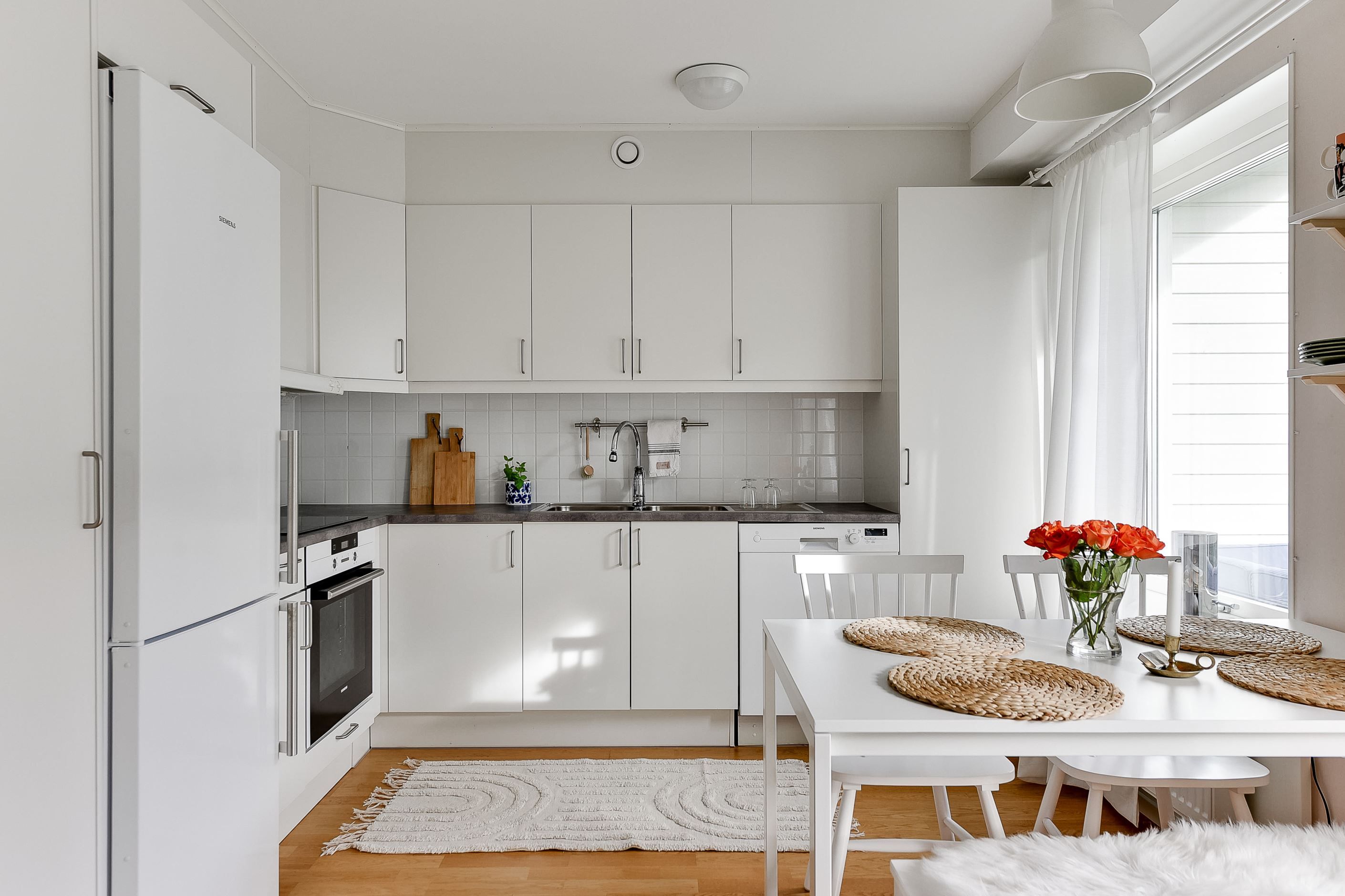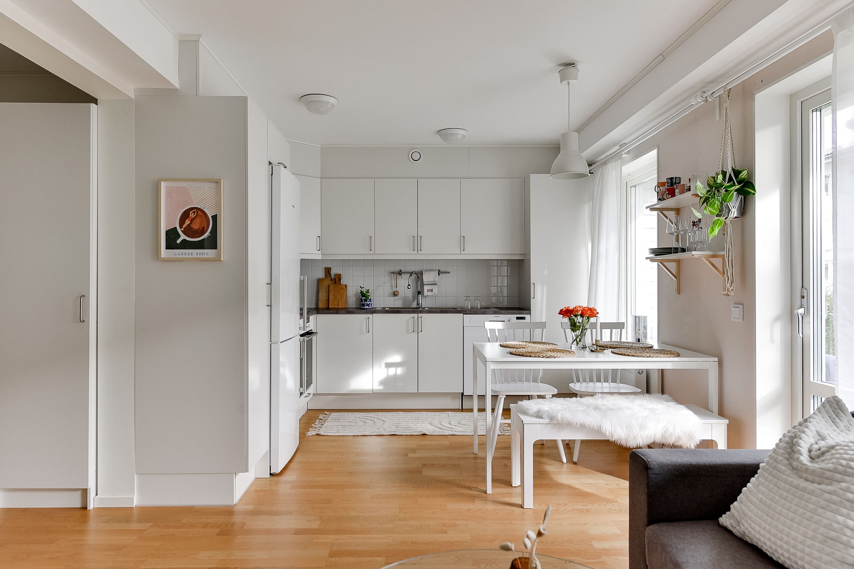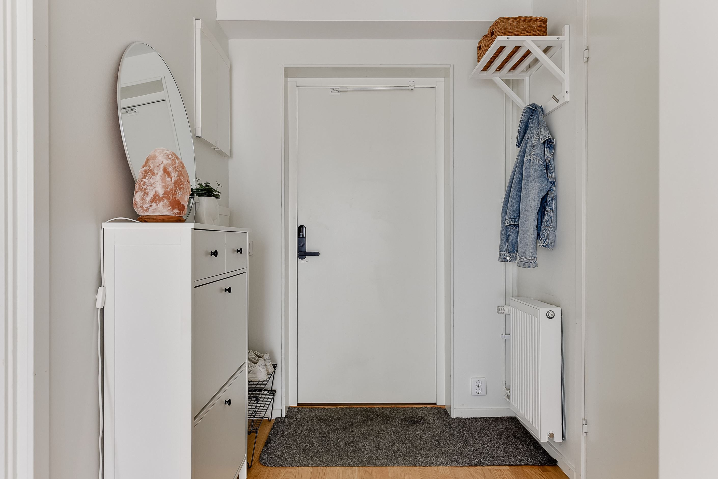 De ljusa ytskikten och det genomgående trägolvet skapar en enhetlig och fräsch känsla. Här finns bra förvaring mer flera garderober i både hall och sovrum. Vitt, praktiskt vinkelkök med bra arbetsytor, gott om förvaring och fullt utrustat med häll, ugn, diskmaskin samt kyl/frys. Här finns plats för matbord vid fönstret. Fräscht duschrum med tvättmaskin, torktumlare, glasväggar och modern inredning. Det ljust vardagsrummet har generösa fönster och gott om plats för både soffa, tv-möbel och övrig möblering. Här är det lätt att trivas!