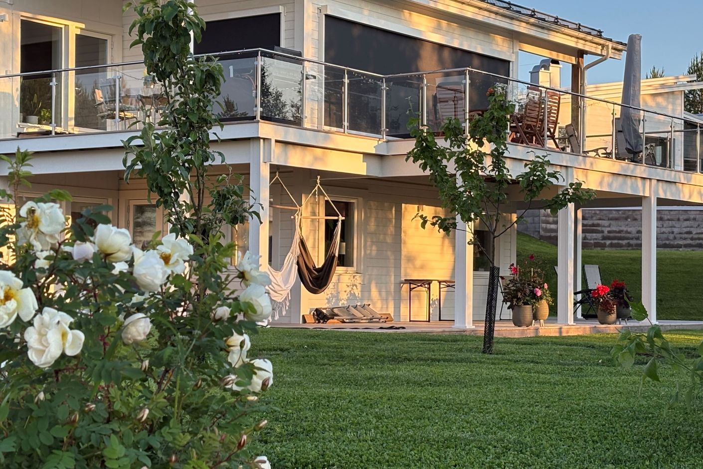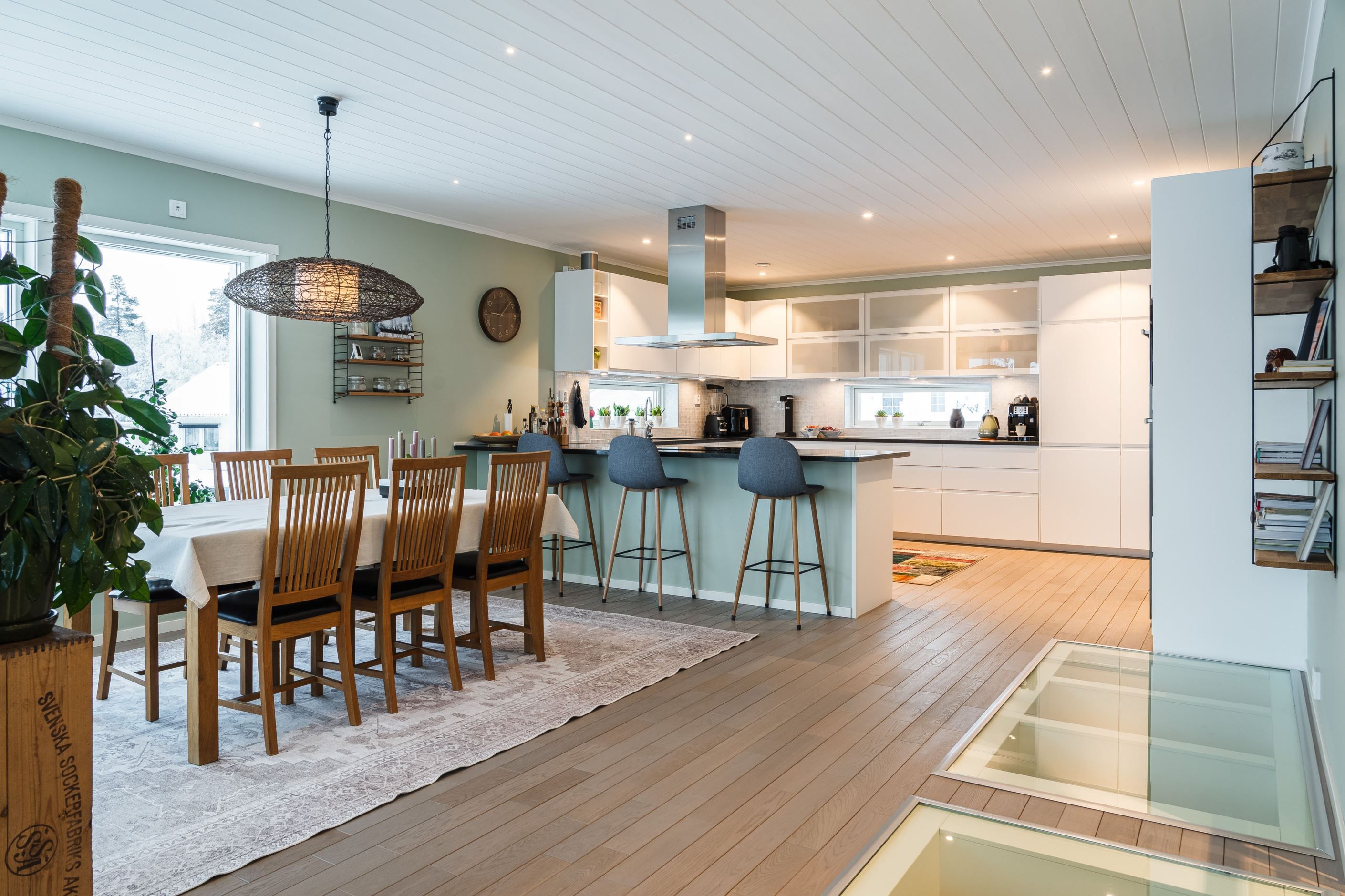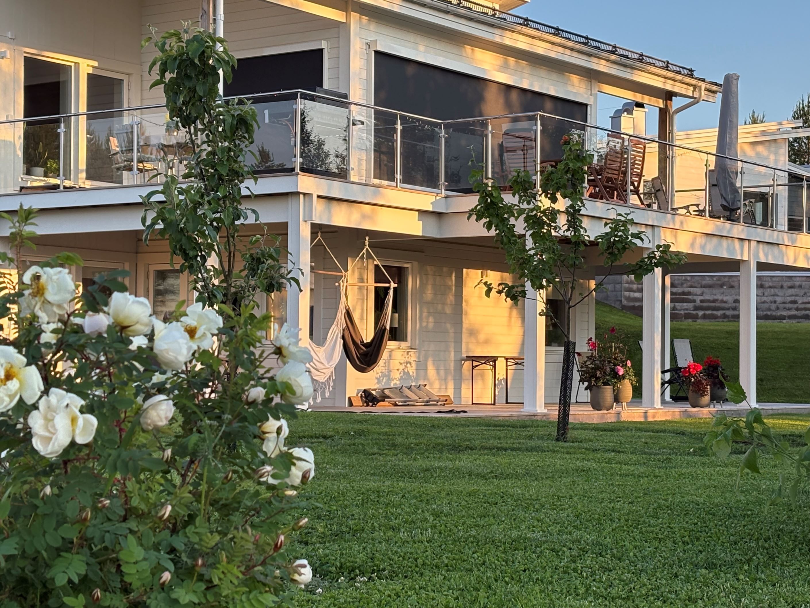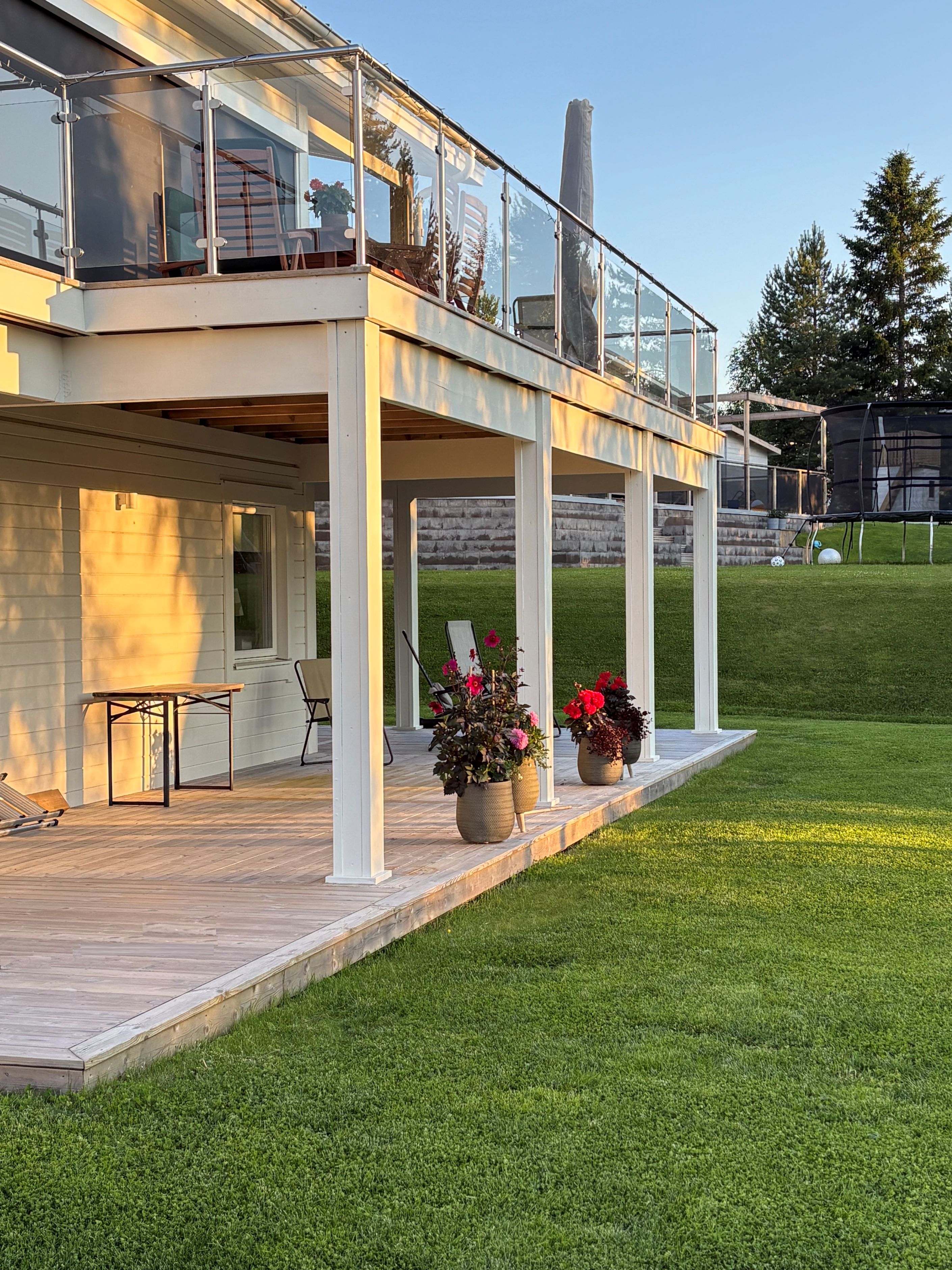 Köket är stort och inbjudande med generös förvaringsyta och en stenbänkskiva som förenar funktion med stil. Här finns rikligt med arbetsyta för matlagning samt en stor bänk som gör det enkelt att både laga mat och umgås med familj och gäster. Matrummet har ett unikt glasgolv som låter ljuset flöda ner till det nedre planet och skapar en effektfull detalj. Den stora terrassen nås direkt från matplatsen och bjuder på eftermiddags- och kvällssol med havsglimt och utsikt över trädgården – en perfekt plats för avkoppling och trevliga grillkvällar.