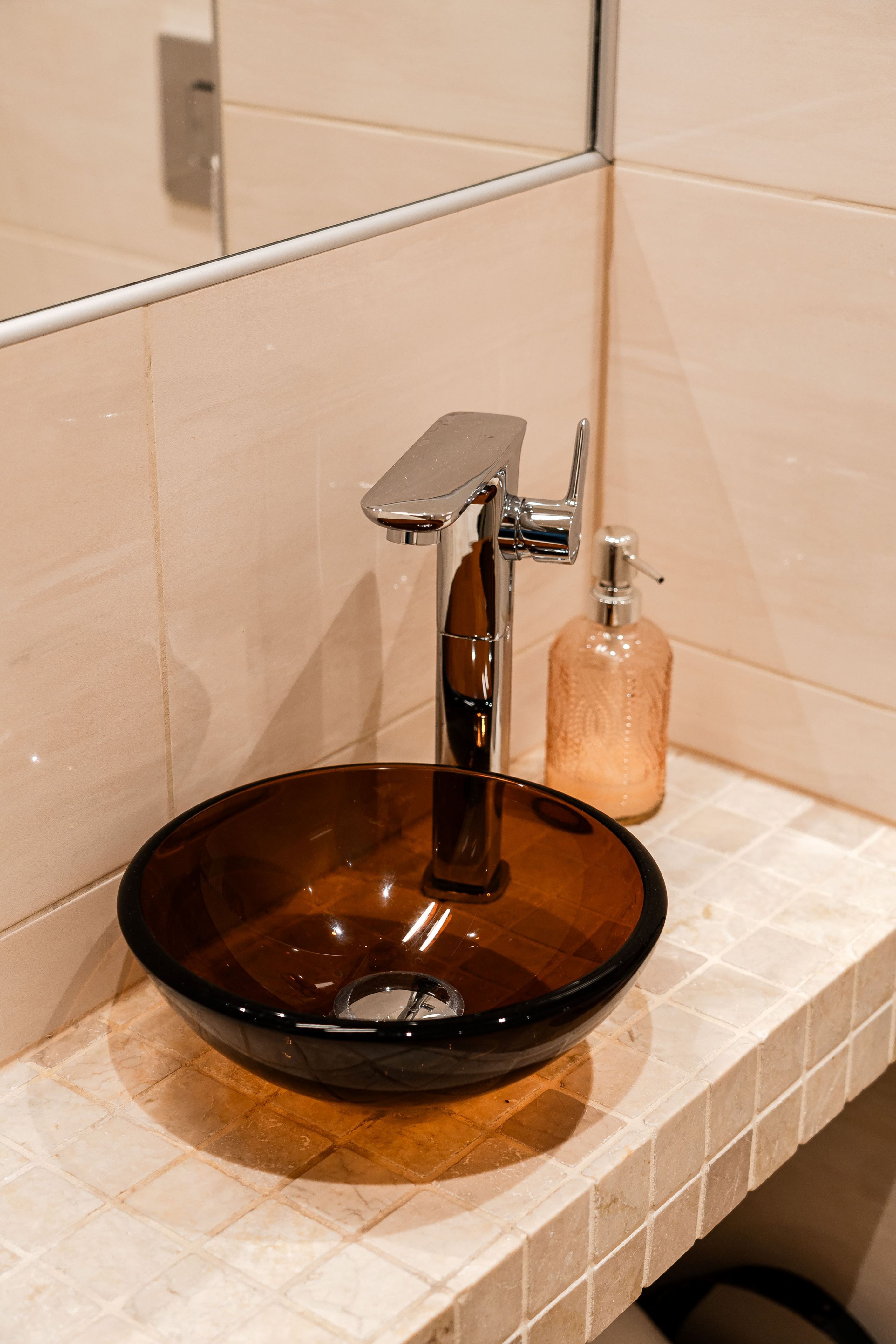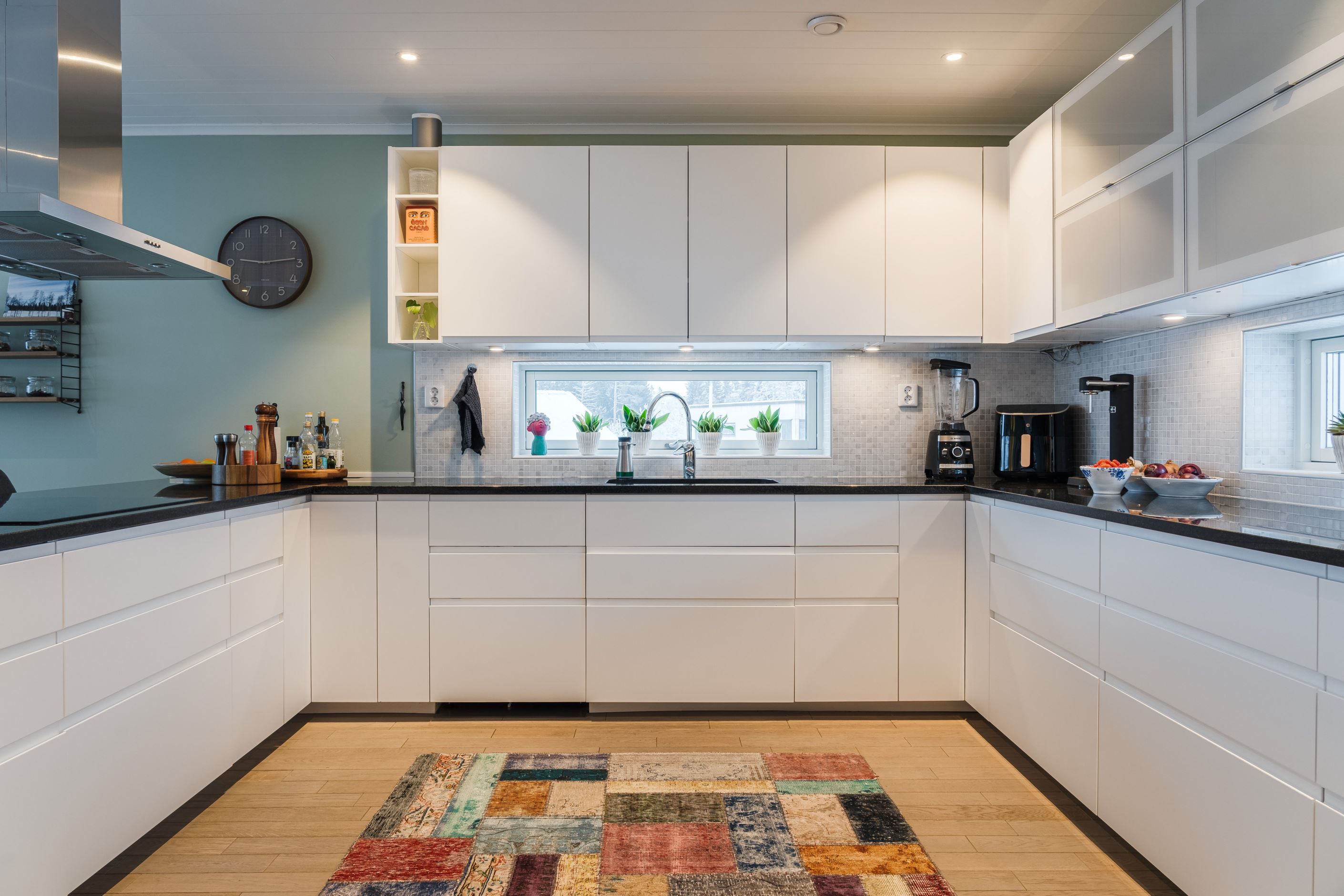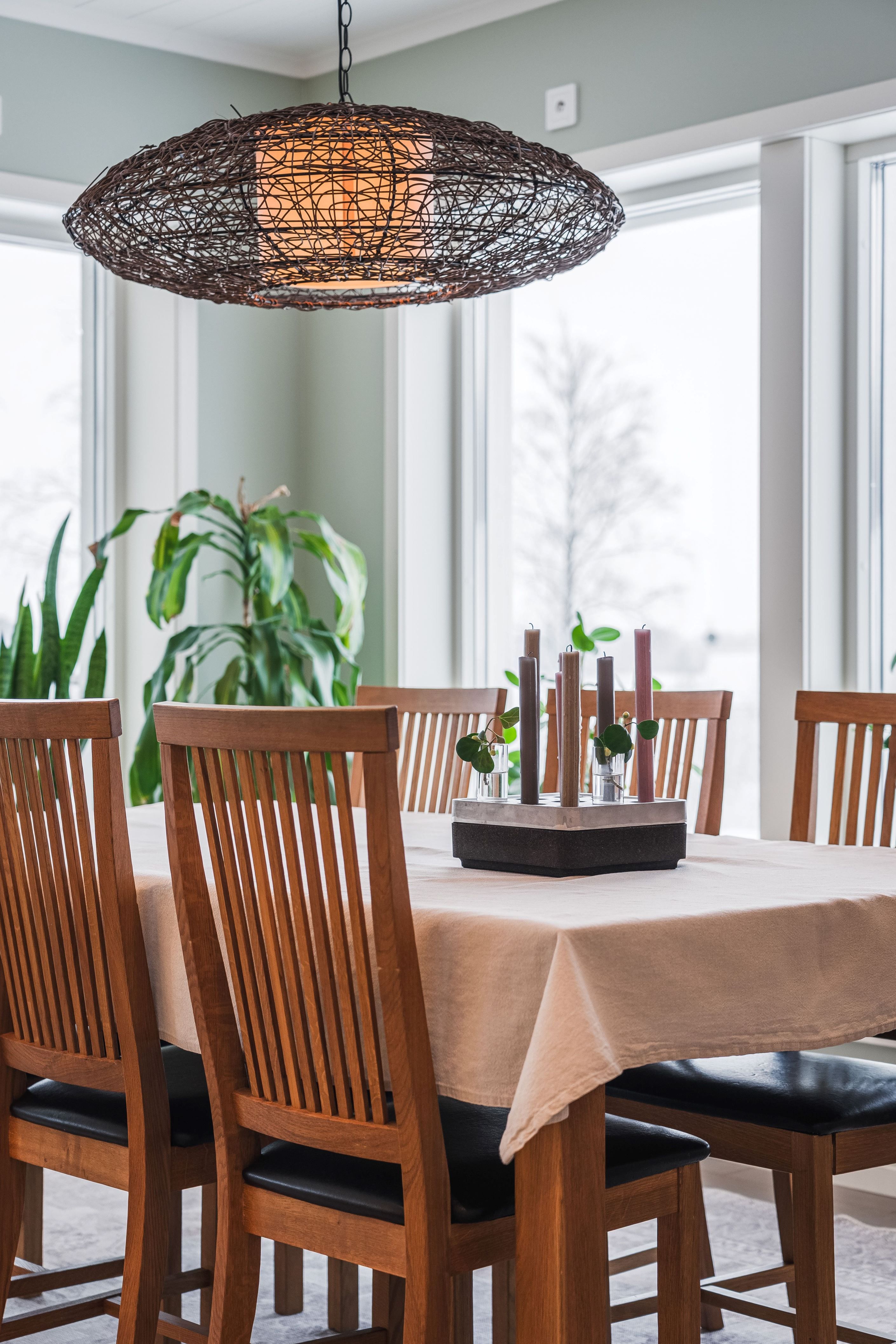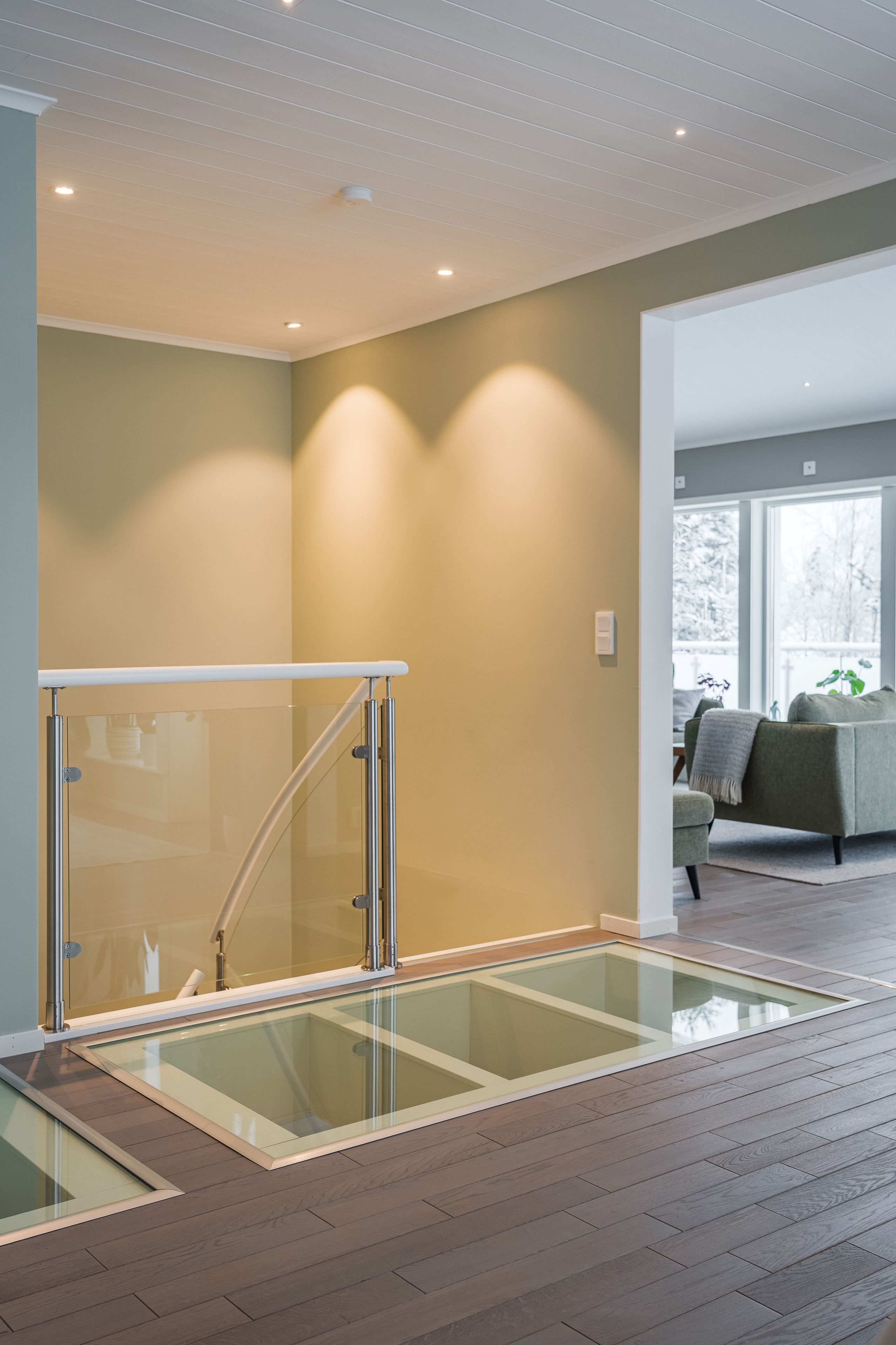 Köket är stort och inbjudande med generös förvaringsyta och en stenbänkskiva som förenar funktion med stil. Här finns rikligt med arbetsyta för matlagning samt en stor bänk som gör det enkelt att både laga mat och umgås med familj och gäster. Matrummet har ett unikt glasgolv som låter ljuset flöda ner till det nedre planet och skapar en effektfull detalj. Den stora terrassen nås direkt från matplatsen och bjuder på eftermiddags- och kvällssol med havsglimt och utsikt över trädgården – en perfekt plats för avkoppling och trevliga grillkvällar.