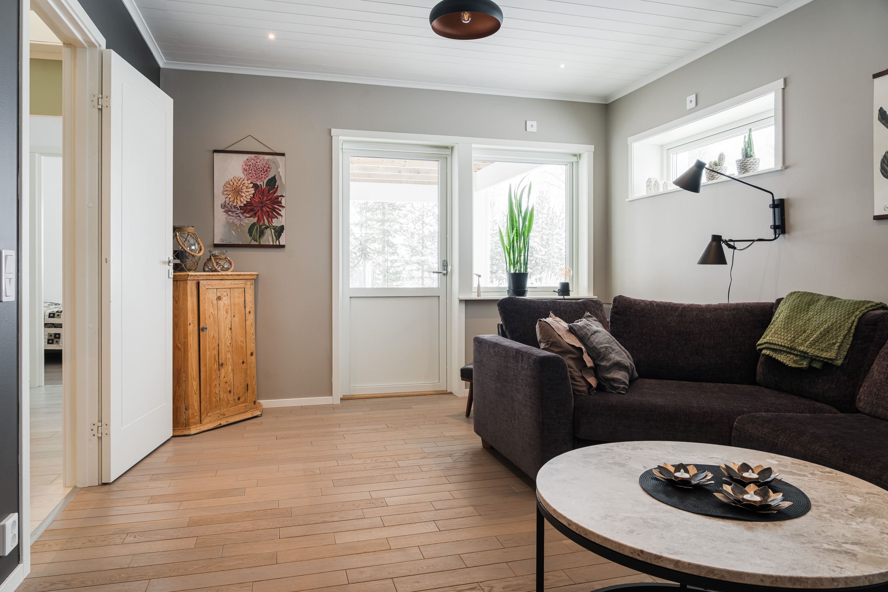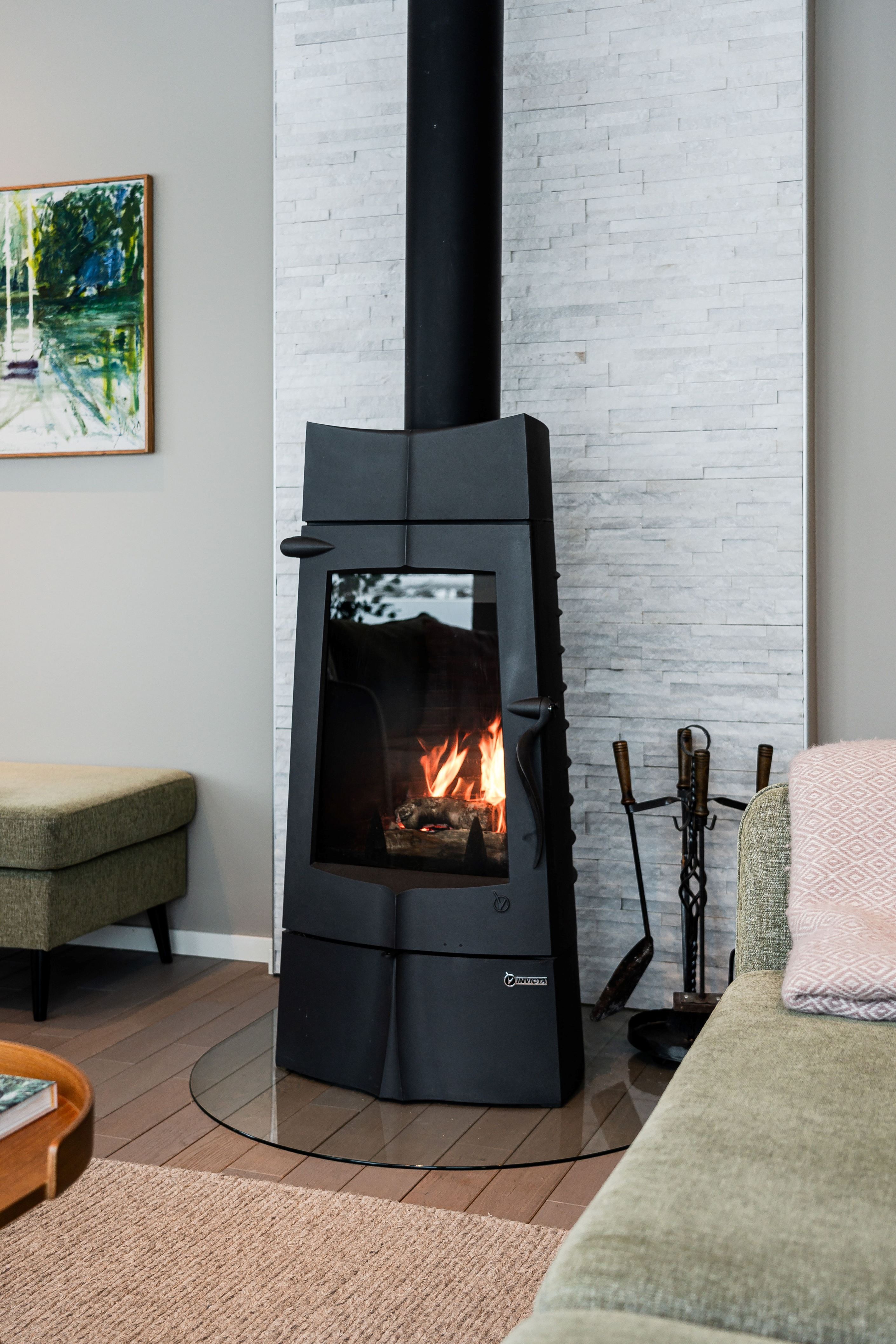 Det rymliga vardagsrummet med imponerande takhöjd har en kamin som sprider värme och skapar en hög mysfaktor under kyliga kvällar. Bostaden har utrustats med vertikalmarkiser som säkerställer ett behagligt inomhusklimat och förstärker bostadens exklusiva känsla.