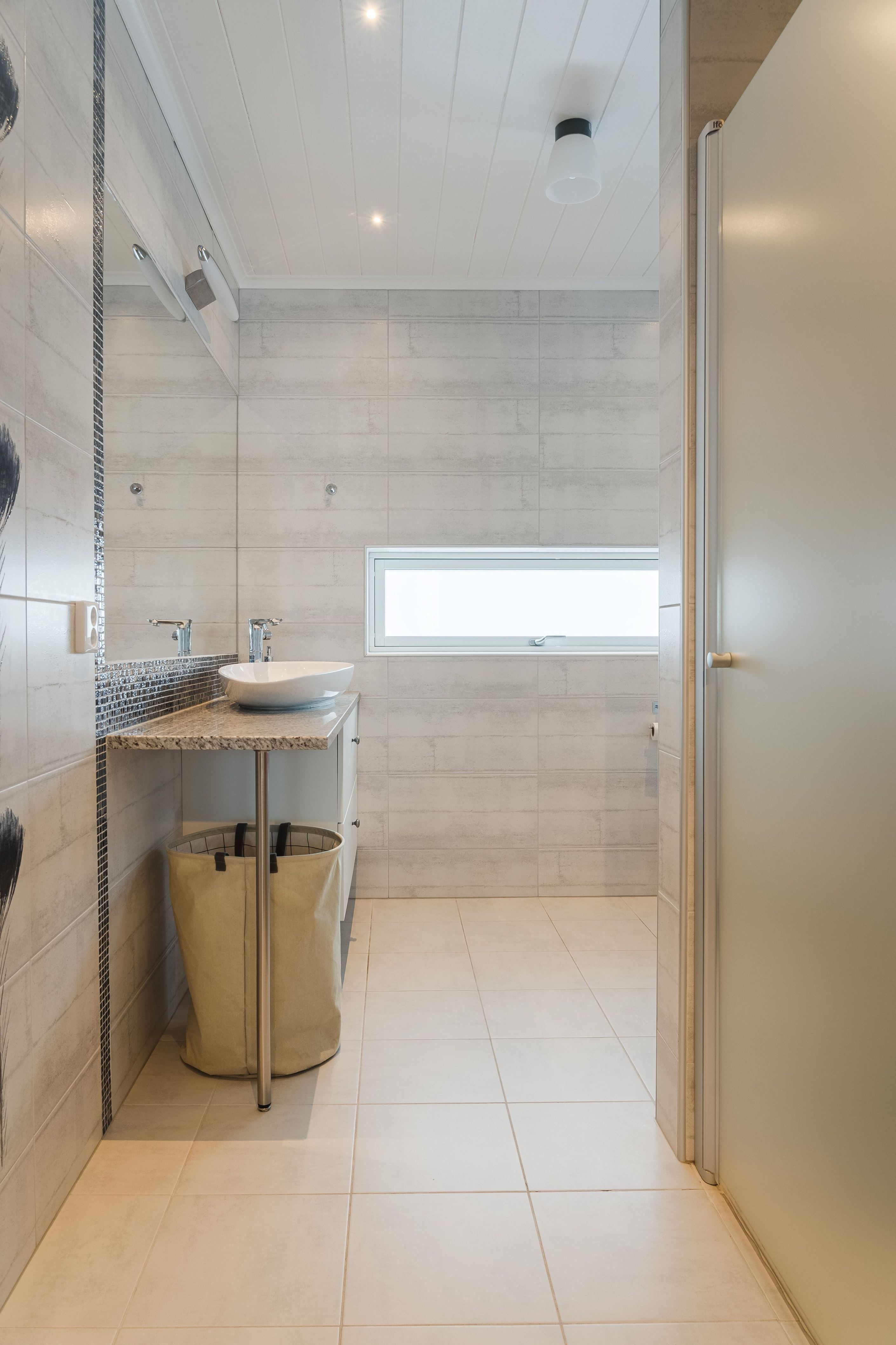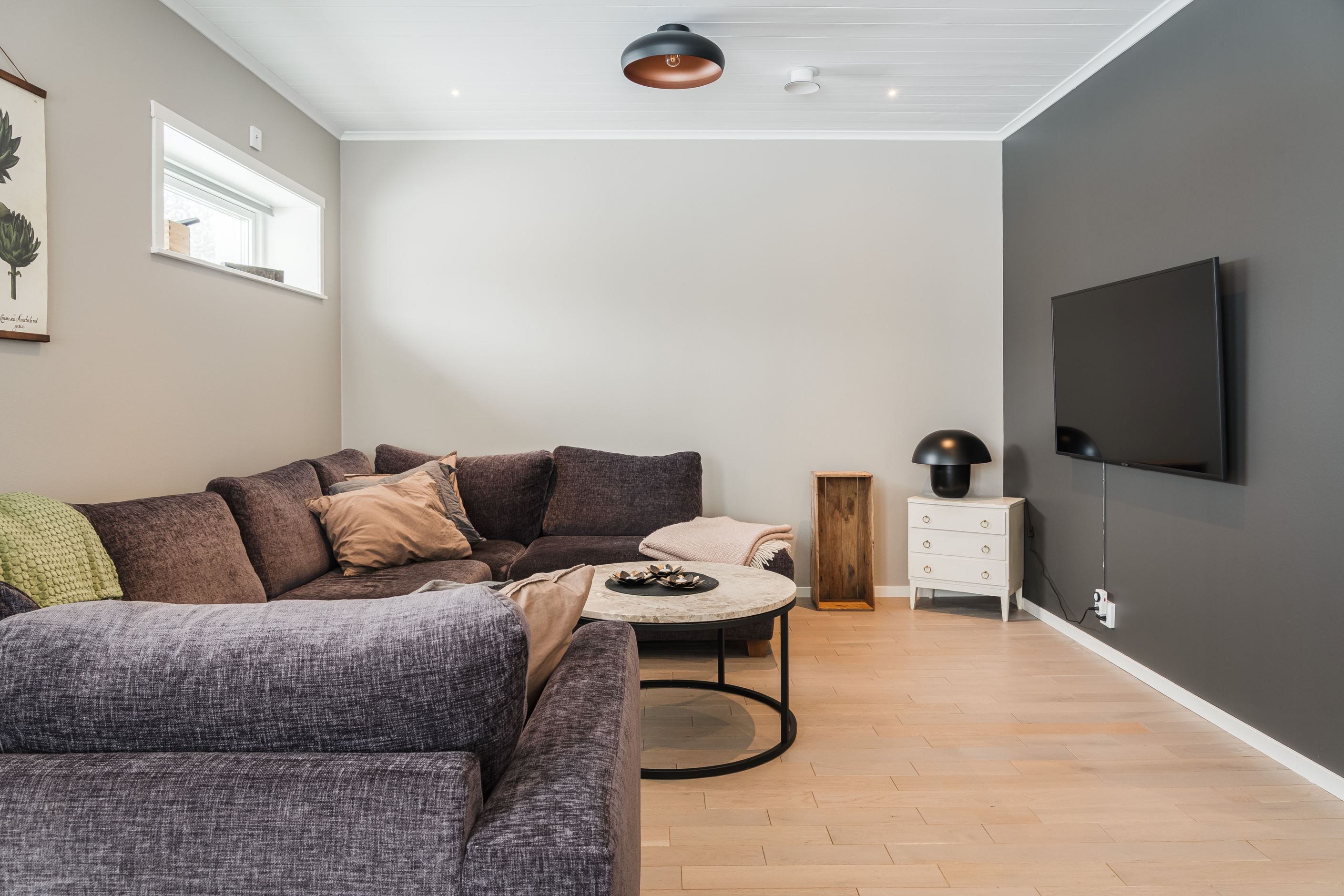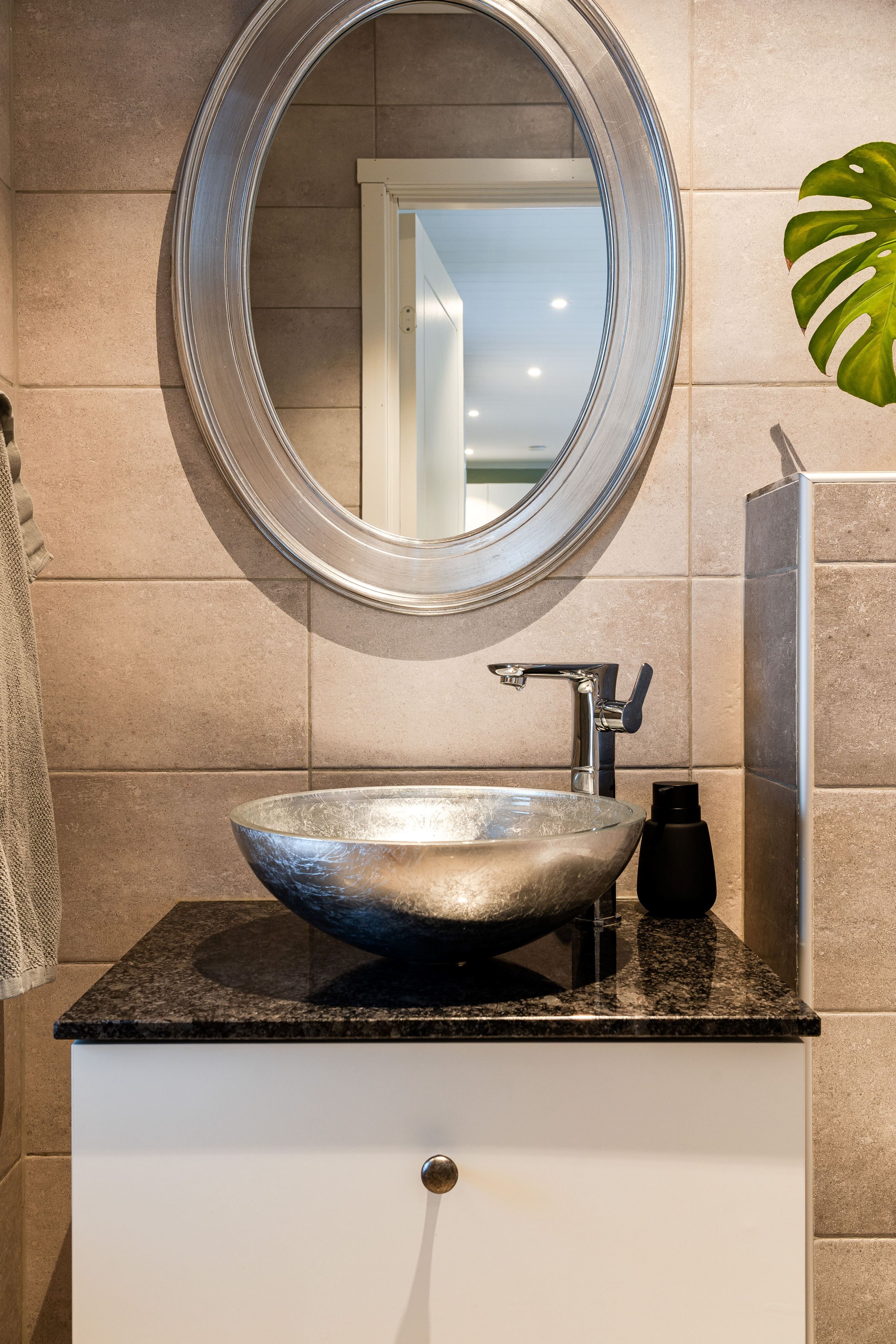 En trappa ner hittar du det lyxiga badrummet med spa-känsla, utrustat med badkar, dusch och bastu samt anslutande wc – en privat oas för vardagslyx. Här finns även en välplanerad tvättstuga samt övriga sovrum, där ett av rummen är generöst tilltaget och används idag som allrum och härifrån når du altanen på baksidan av gården.