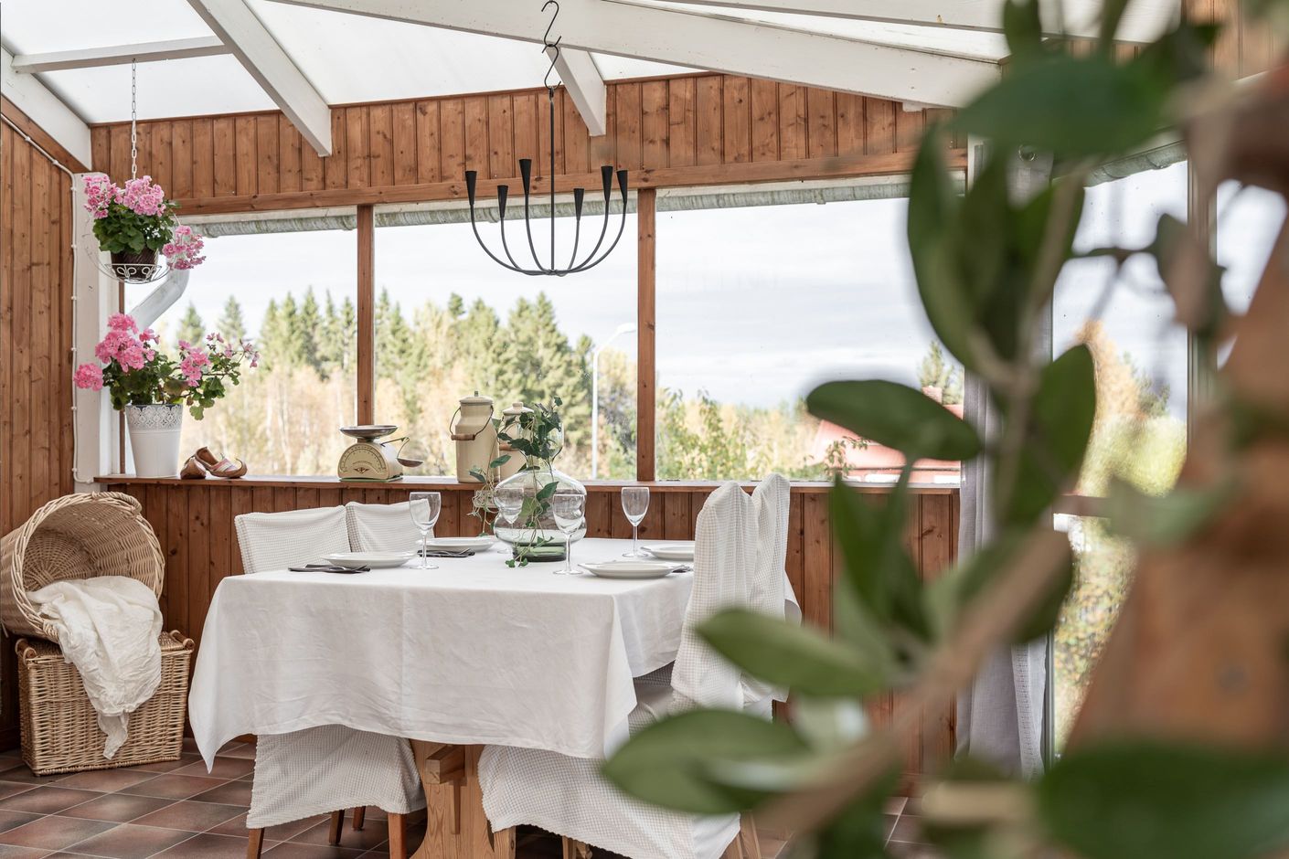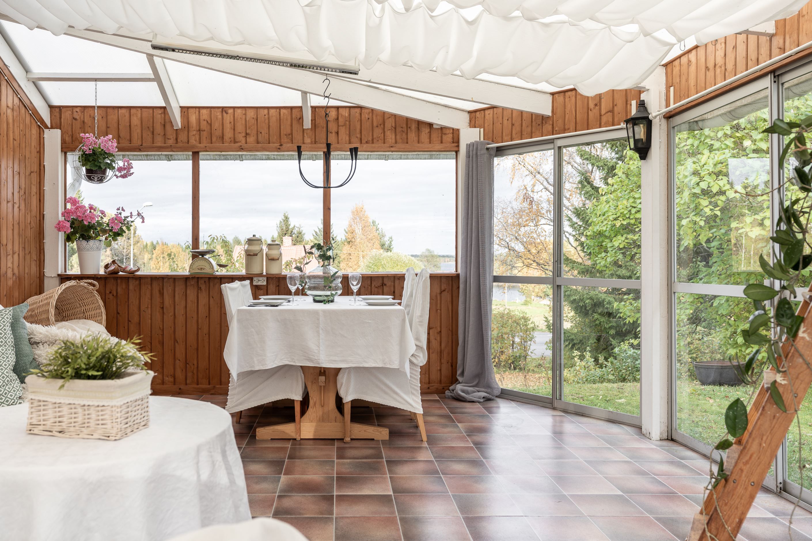 Från köket når du en stor, inglasad altan om ca 24 kvm – en självklar favoritplats under årets varmare månader. Här kan du njuta av morgonkaffet, middag med vänner eller en stilla stund med blicken mot grönskan, oavsett väder.