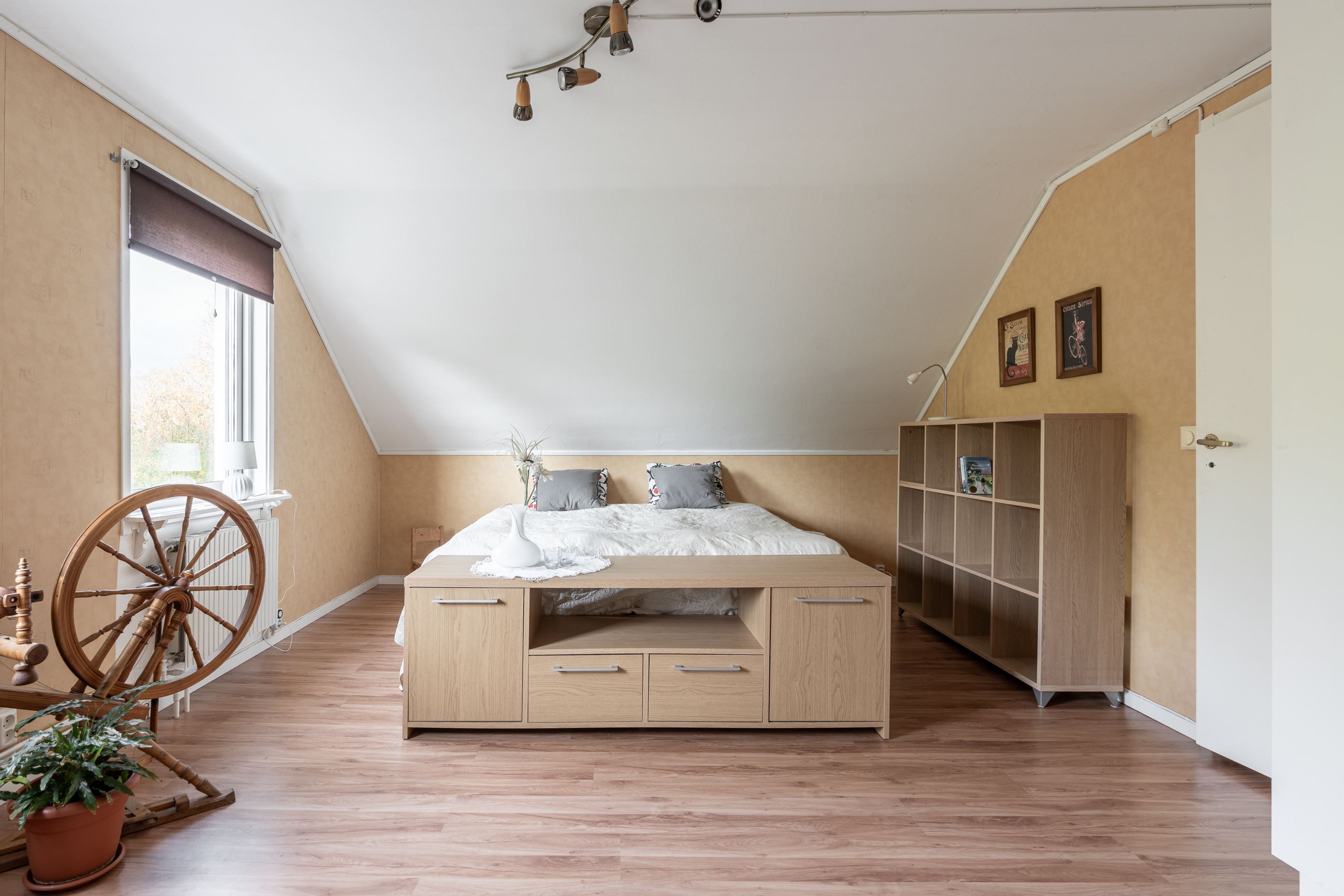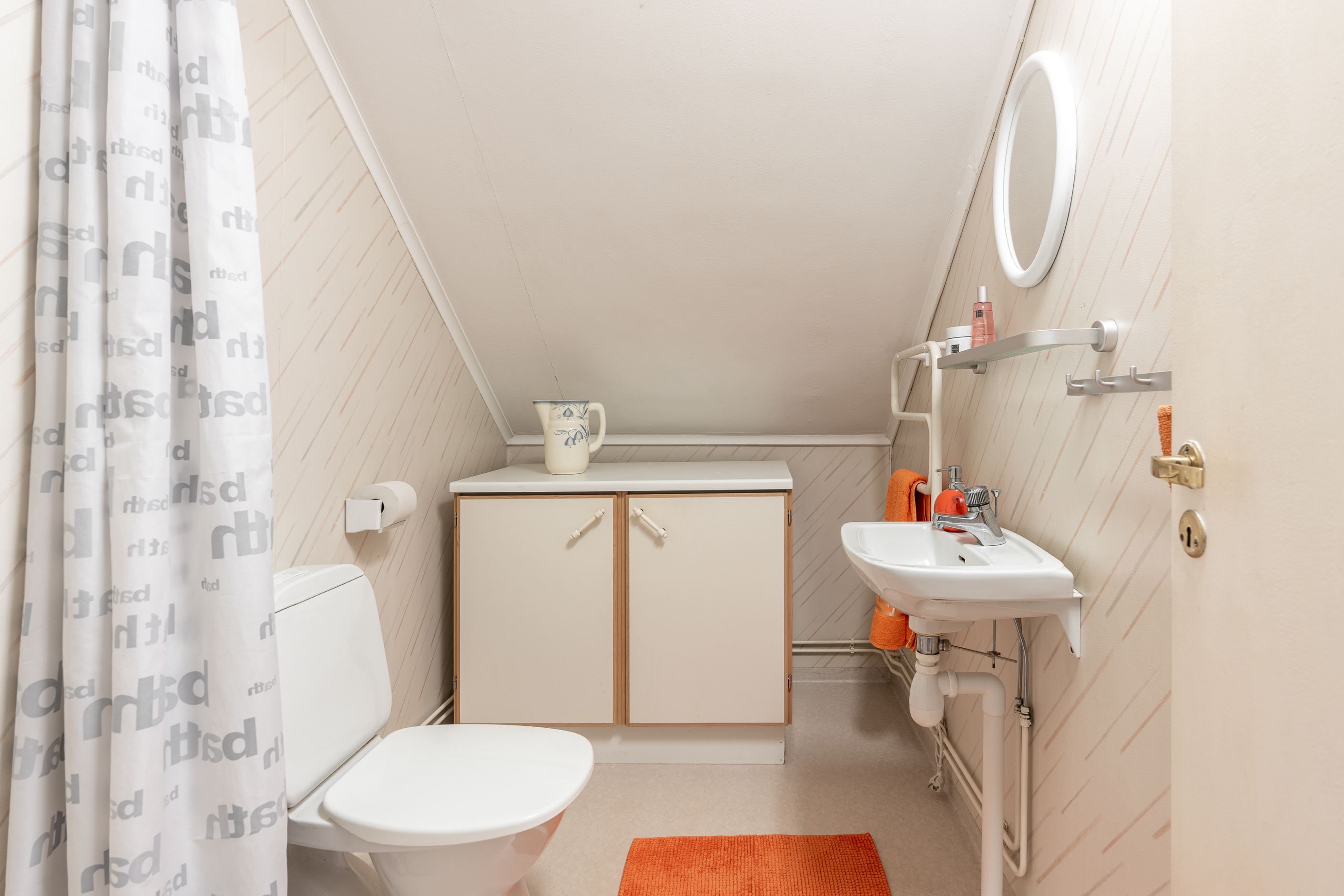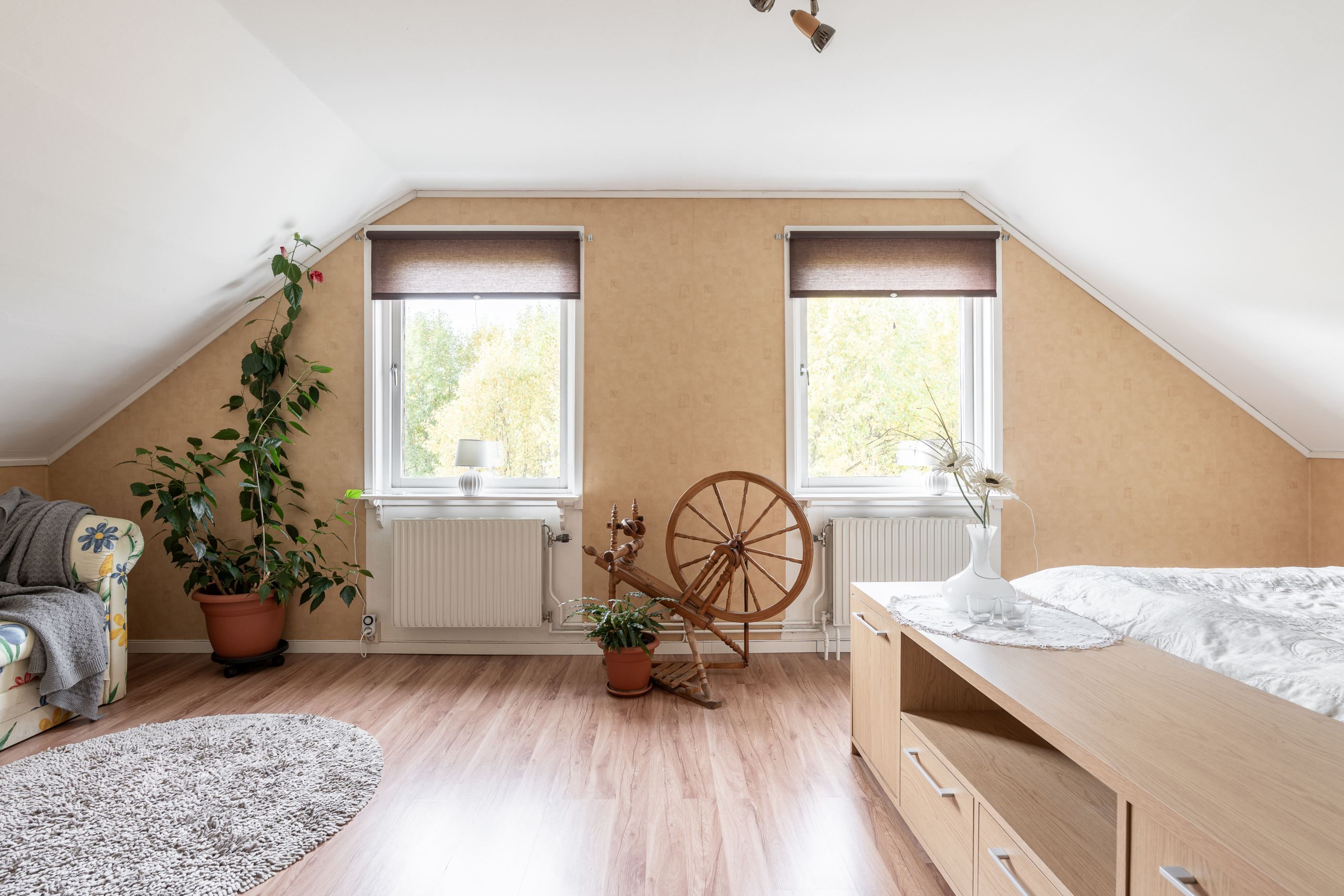 Bostaden erbjuder tre sovrum, varav två finns på övre plan. Det finns även två badrum – ett större med både tvättmaskin, torktumlare och behaglig golvvärme, samt ett mindre med dusch. Förvaringsmöjligheterna är goda genom hela huset.