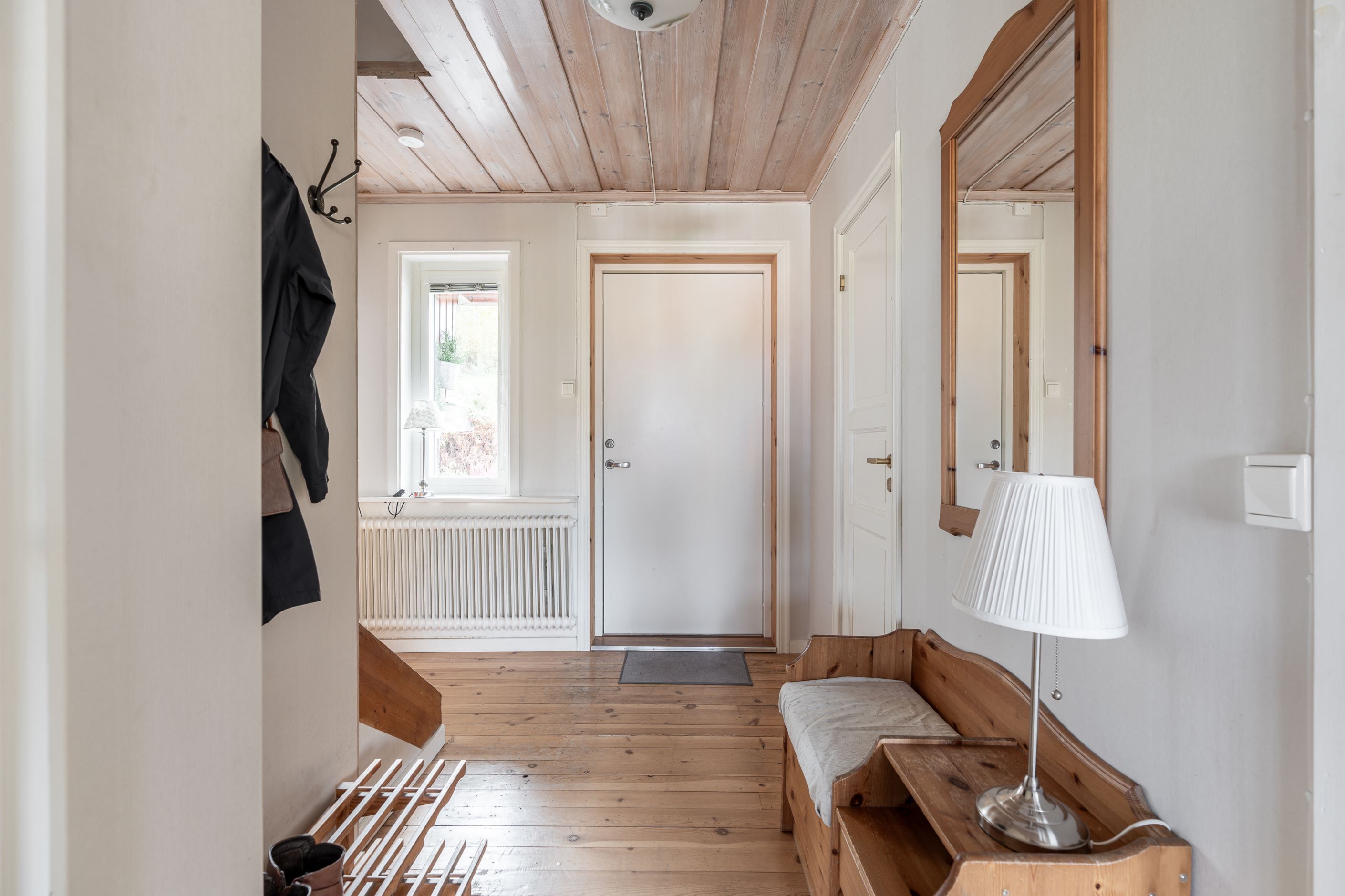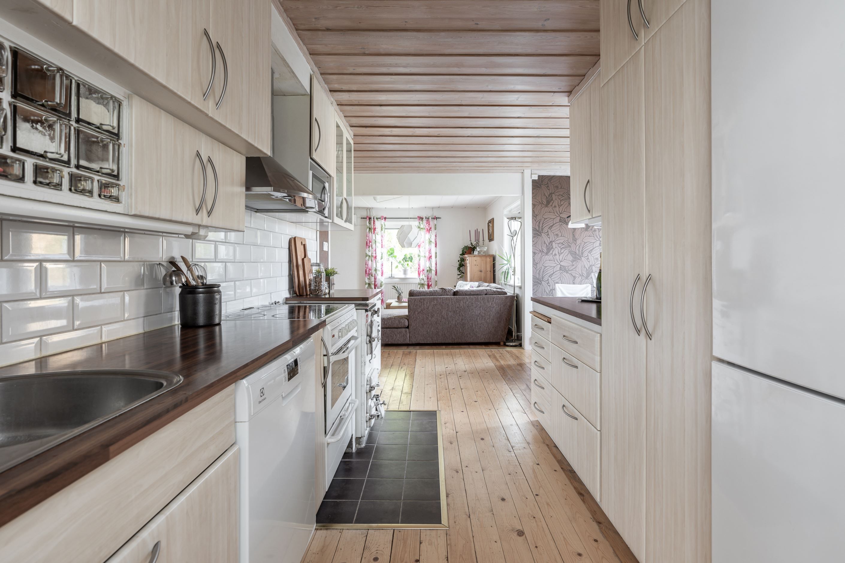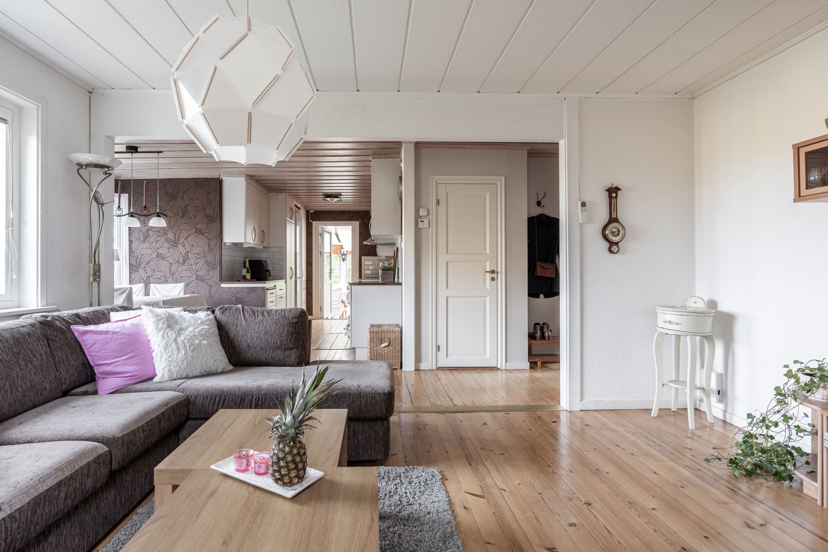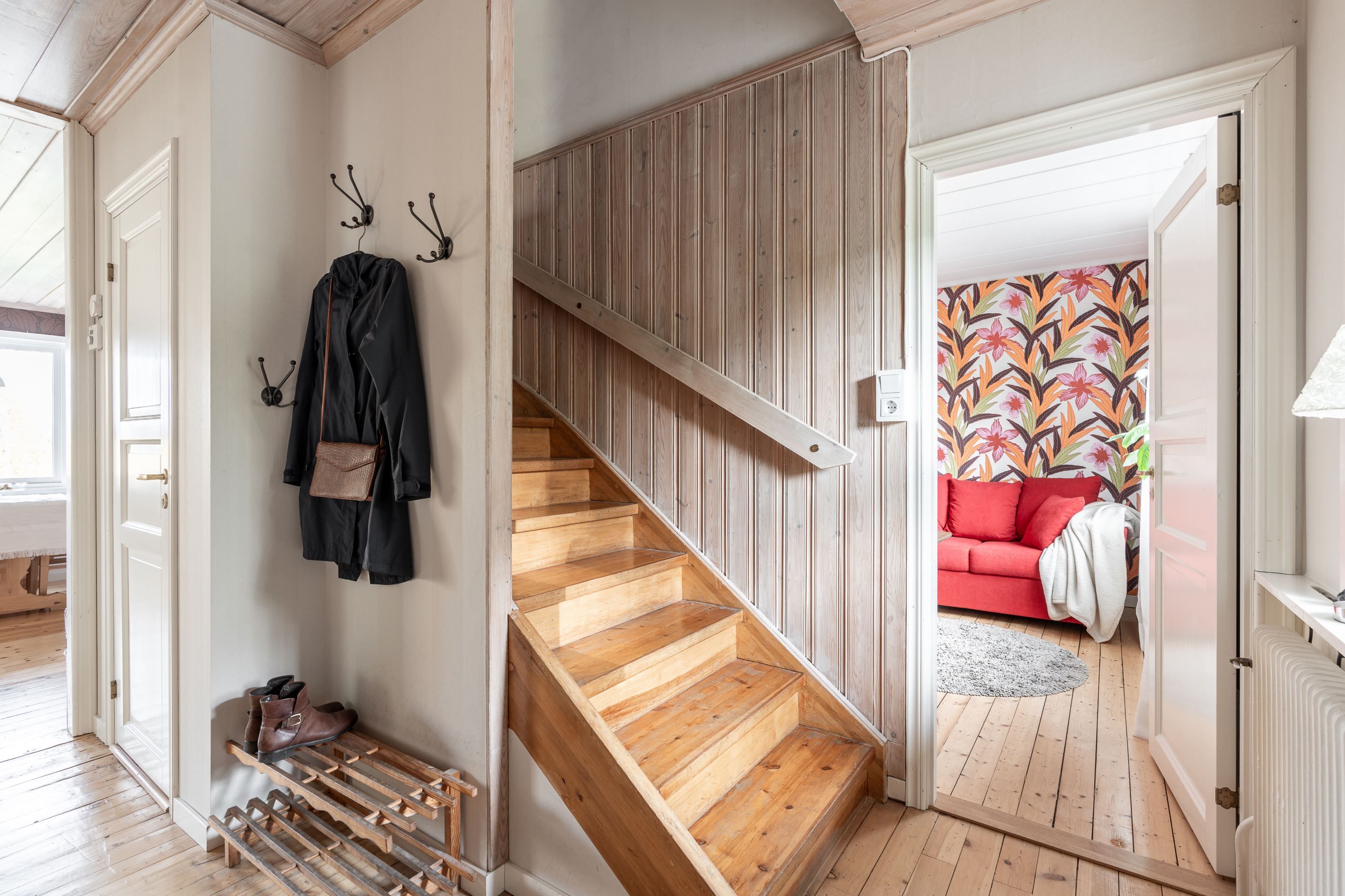 Entréplanet bjuder på en varm och välkomnande atmosfär, där trägolv och genomtänkt planlösning skapar en trivsam inramning. Det sociala hjärtat i huset är det öppna köket i anslutning till vardagsrummet – en naturlig samlingspunkt för både vardagsliv och umgänge.