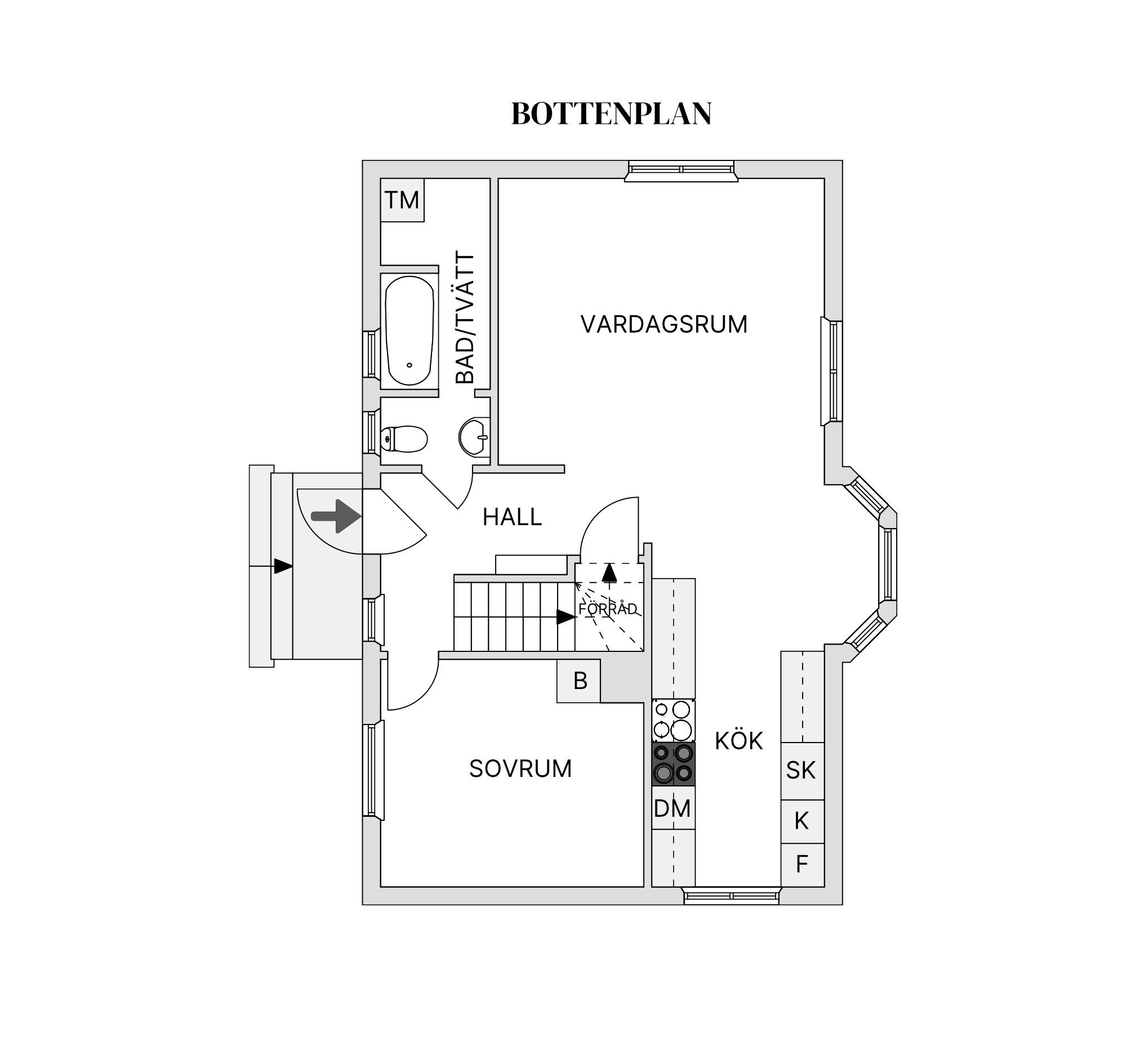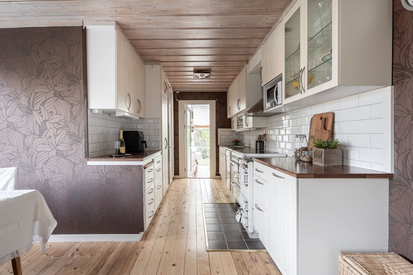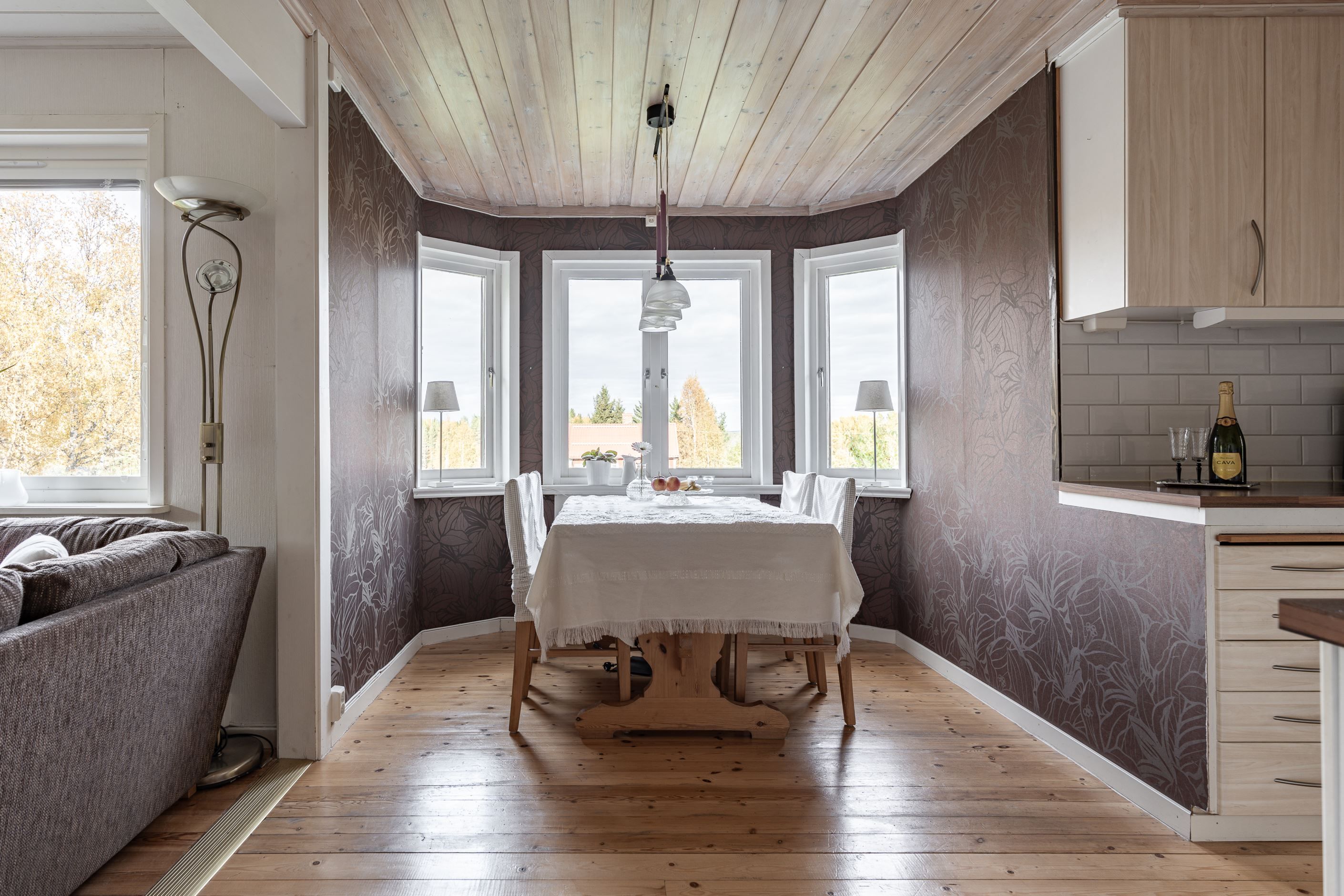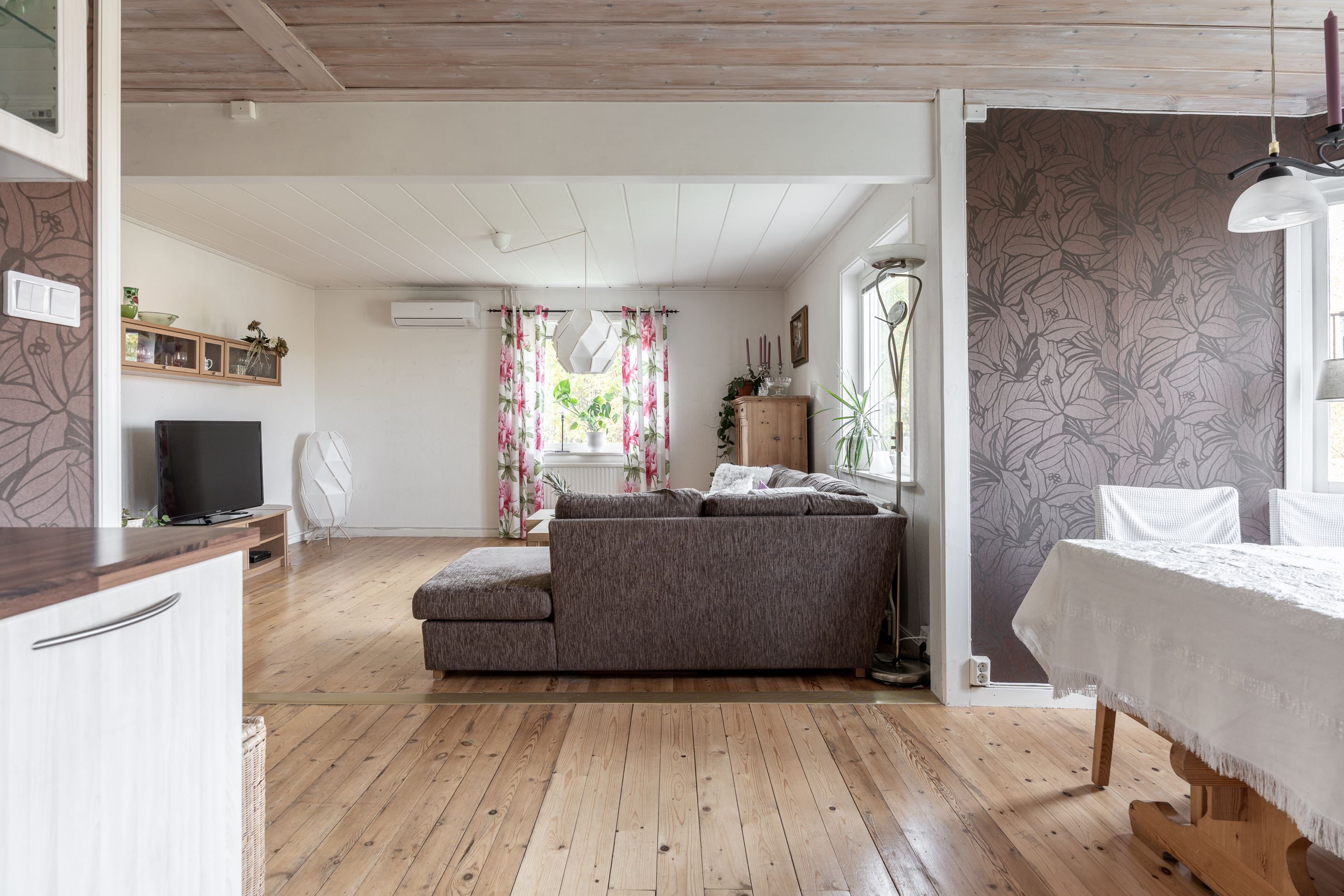 Entréplanet bjuder på en varm och välkomnande atmosfär, där trägolv och genomtänkt planlösning skapar en trivsam inramning. Det sociala hjärtat i huset är det öppna köket i anslutning till vardagsrummet – en naturlig samlingspunkt för både vardagsliv och umgänge.