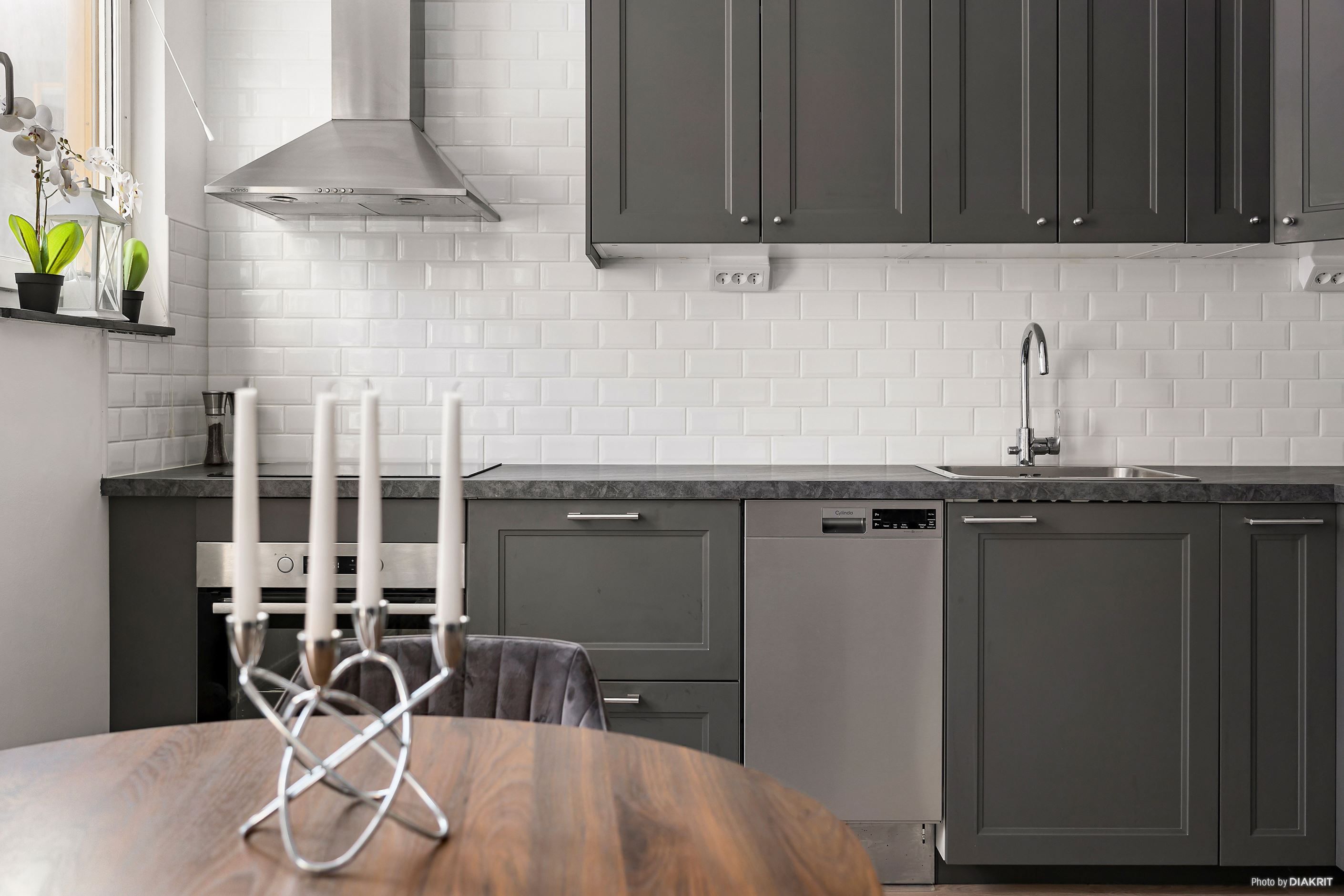 Köket är elegant utformat med gott om både arbetsyta och förvaring. De snygga gråa luckorna kombineras med smakfullt bistrokakel och fullt utrustad maskinpark, inklusive diskmaskin som förenklar vardagen. Här finns gott om plats för både matlagning och umgänge.