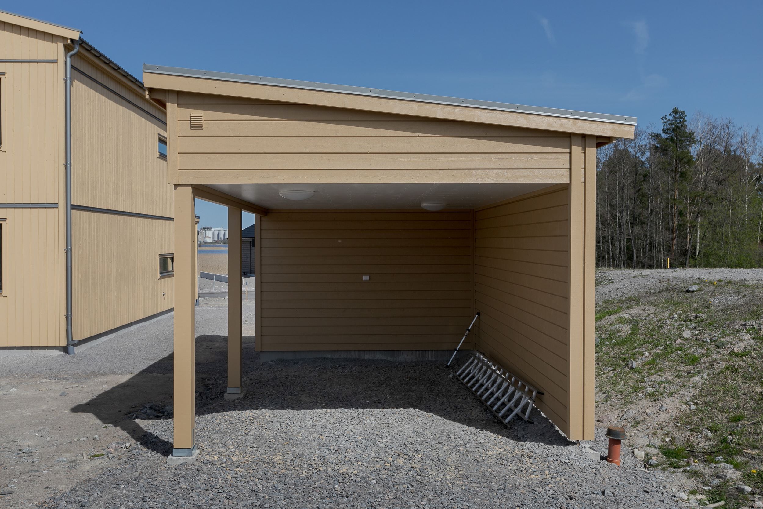 Fönstren har aluminiumbeklädd utsida vilket garanterar mindre underhåll. Takpannor i betong och egen carport. Som ett extra förvaringsutrymme ingår ett förråd som ligger placerat i carportens bakre del.