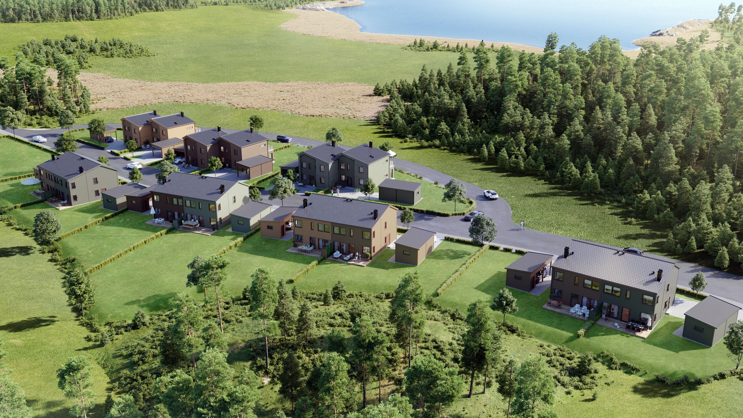Färgsättningen harmoniserar med naturen, den omkringliggande skogen och det vidsträckta vassområdet fångas upp i fasaderna där färgskolan går i grönt, brunt och havregult.