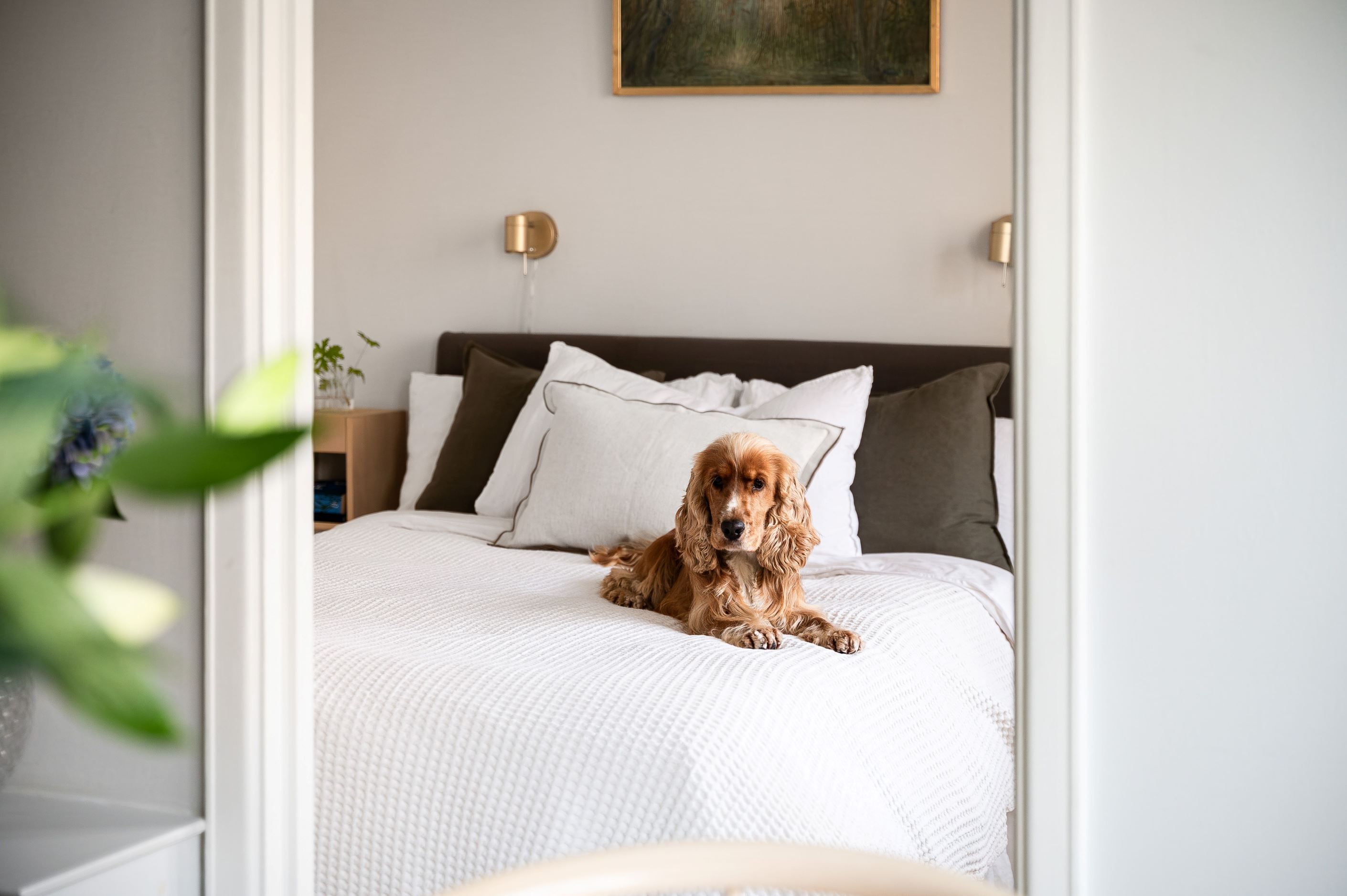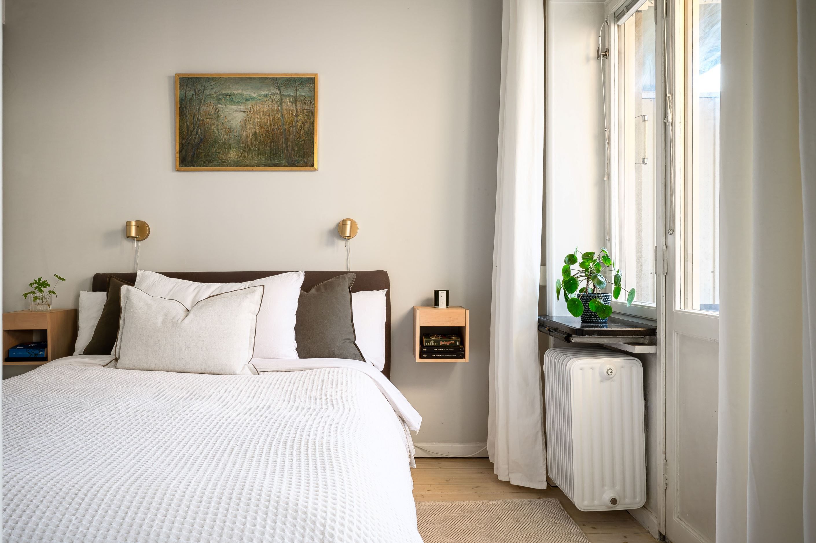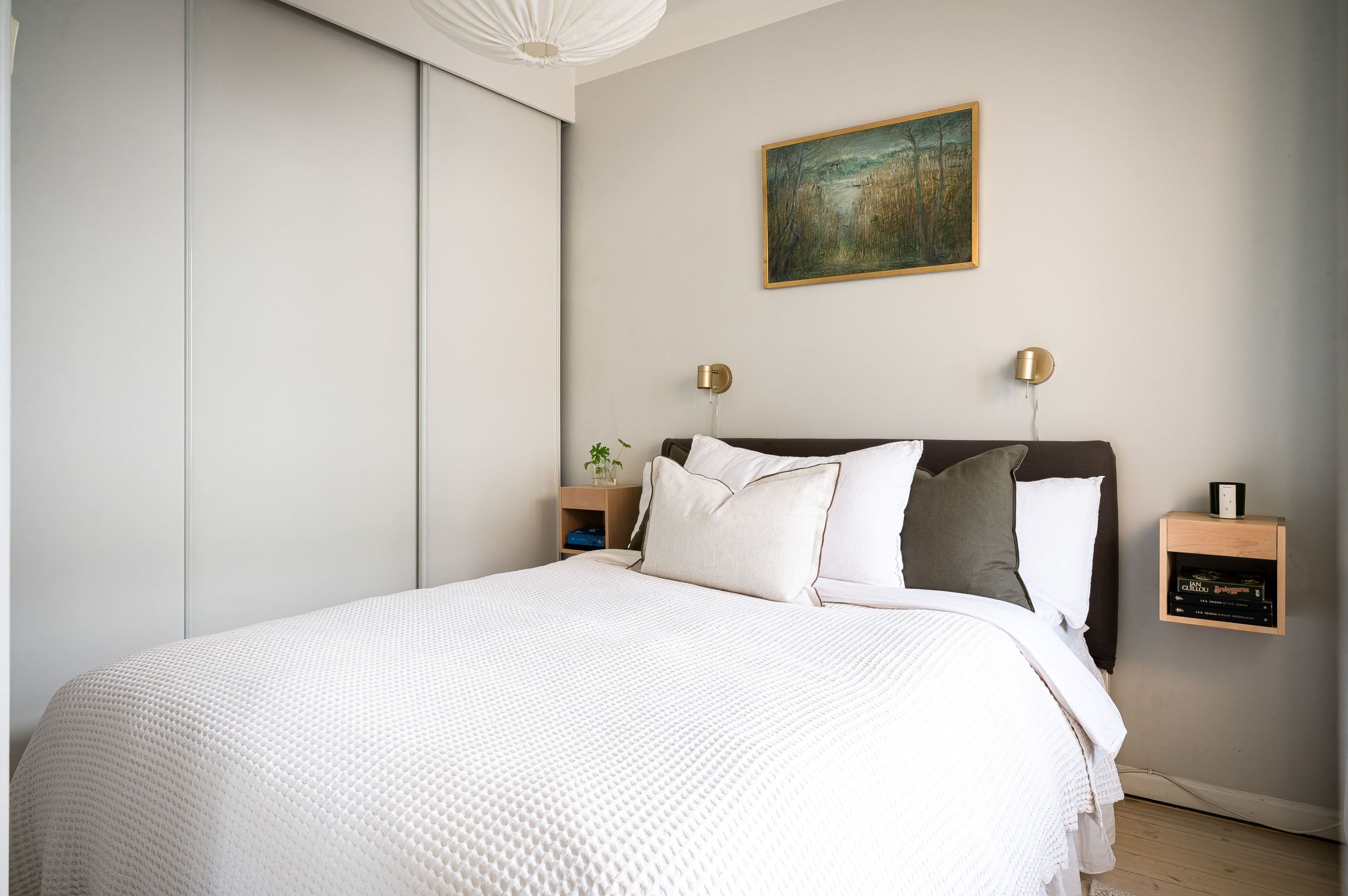 Det rofyllda sovrummet rymmer smarta garderobslösningar som gör rummet både funktionellt och trivsamt. Det helkaklade badrummet går i sobra toner och är utrustat med stor spegel, stilrent förvaringsskåp samt förberett för tvättmaskin.