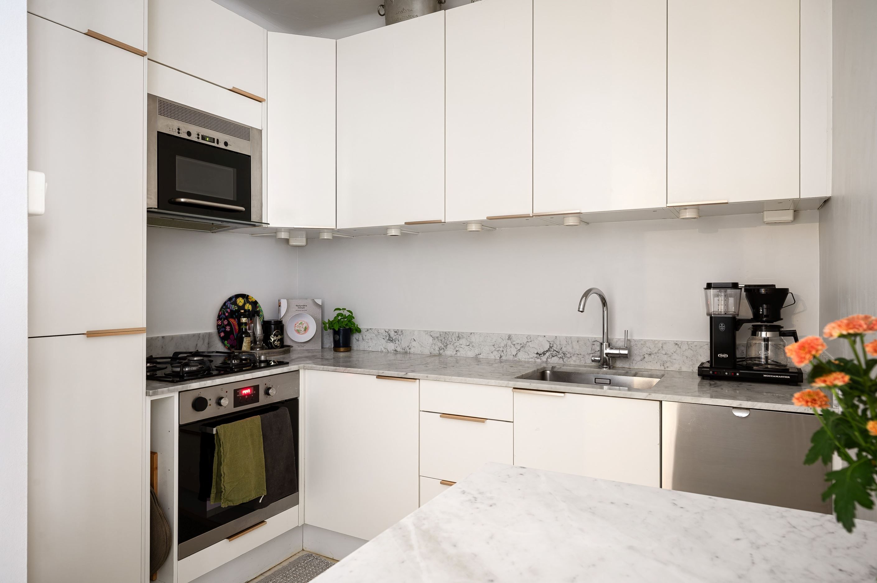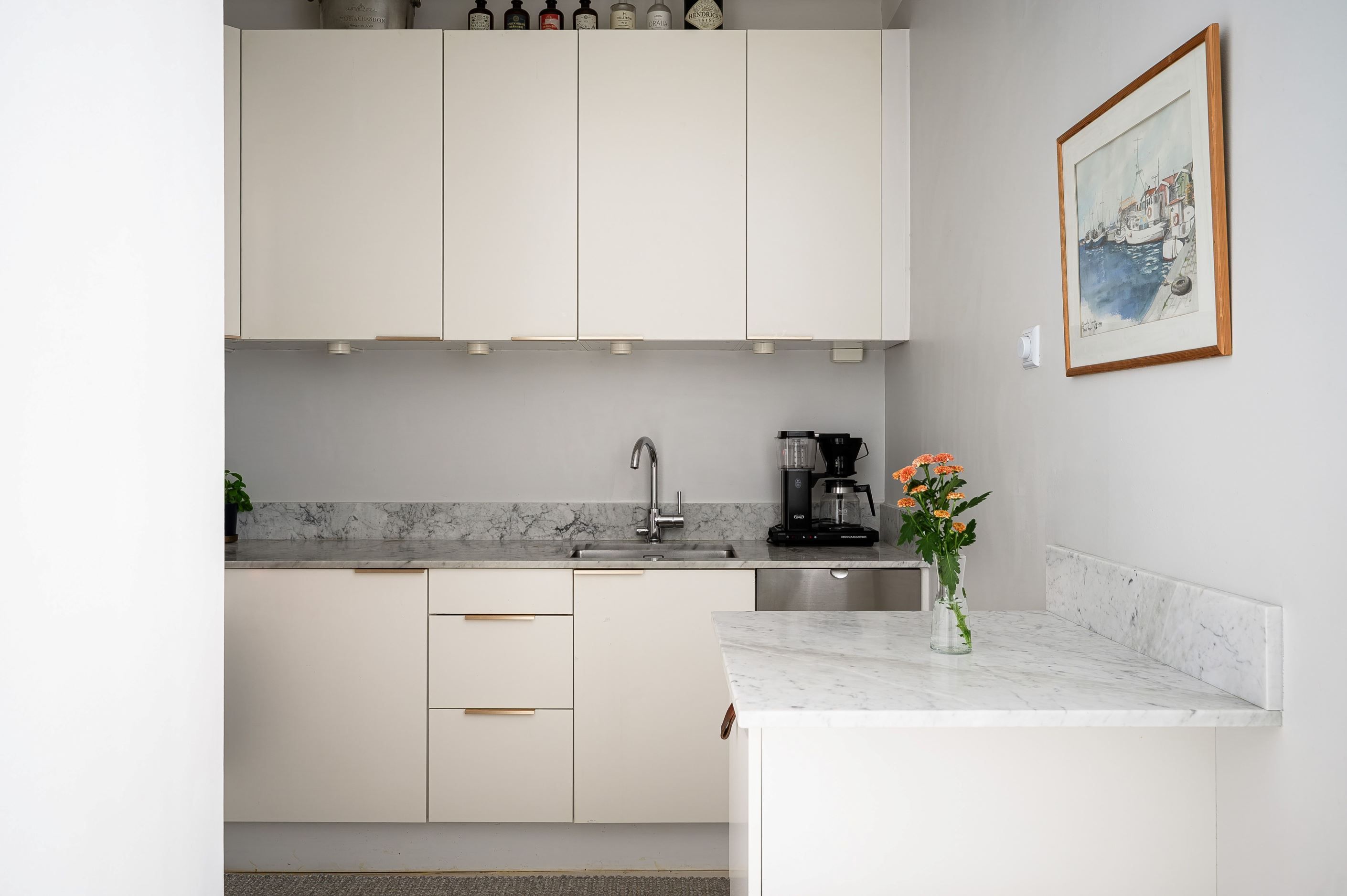 Den inbjudande hallen erbjuder gott om plats för avhängning, och mot sällskapsrummet finns en inbyggd, dekorativ bokhylla. Vidare leds du in i vardagsrummet, där ett fantastiskt ljusinsläpp och generösa ytor ger plats för både soffgrupp och matplats. Rummet ligger i öppen och social planlösning mot det ljusa köket, som har bänkskiva i carraramarmor och en praktisk köksö – här samsas moderna bekvämligheter med klassiska materialval.