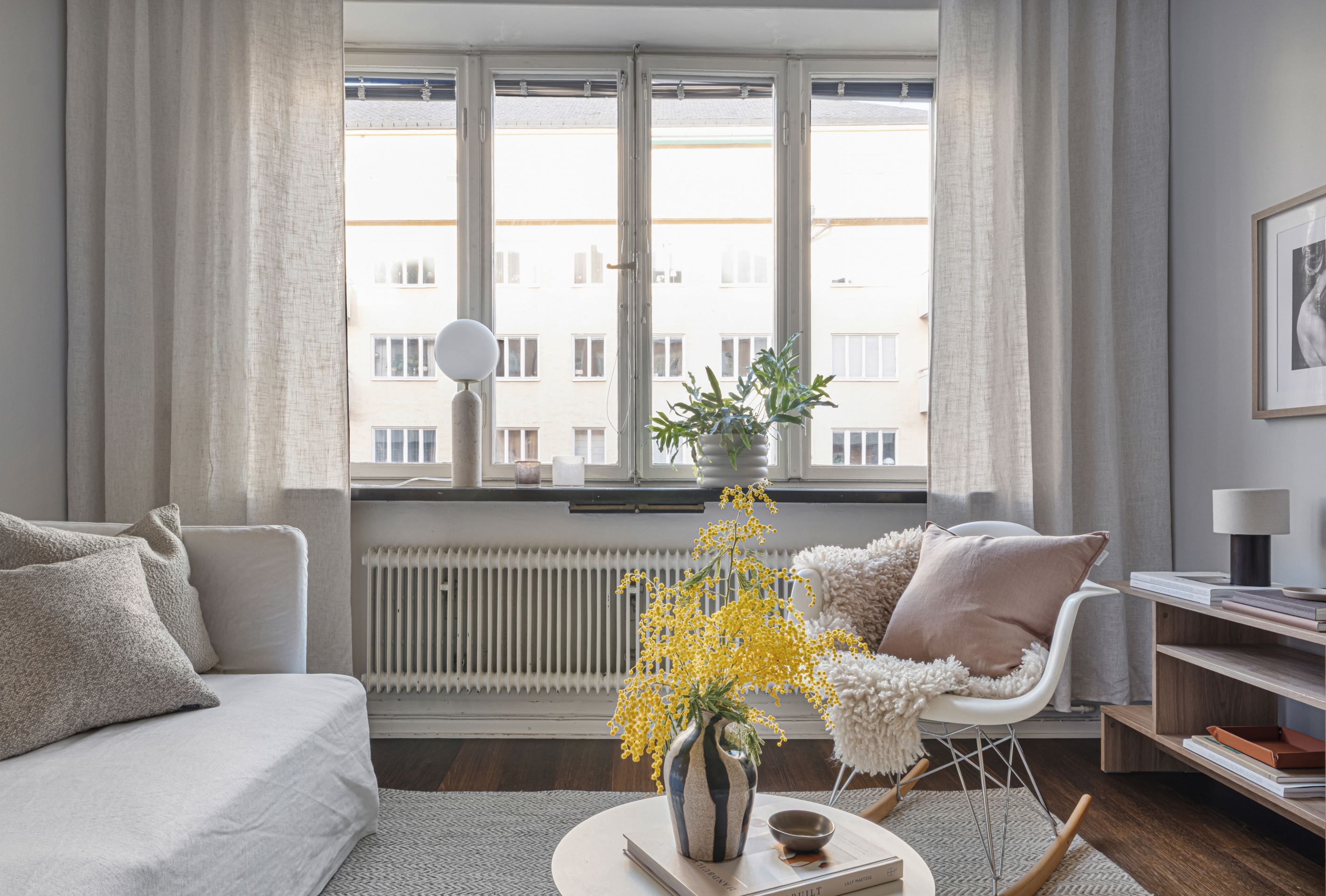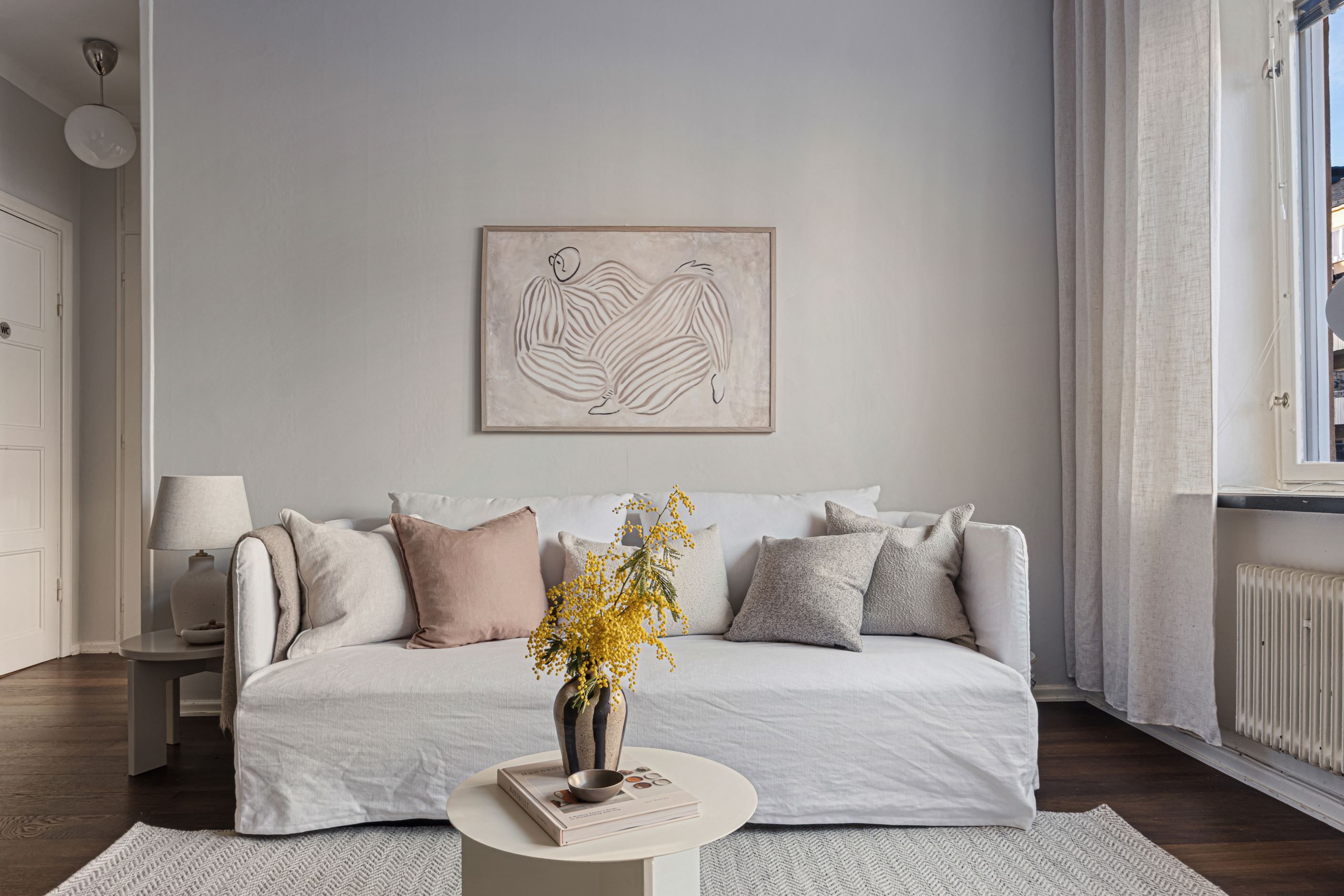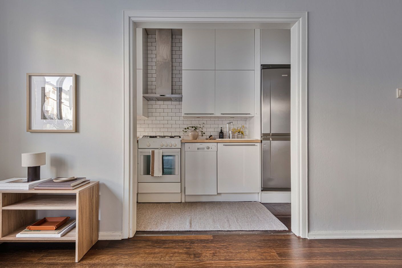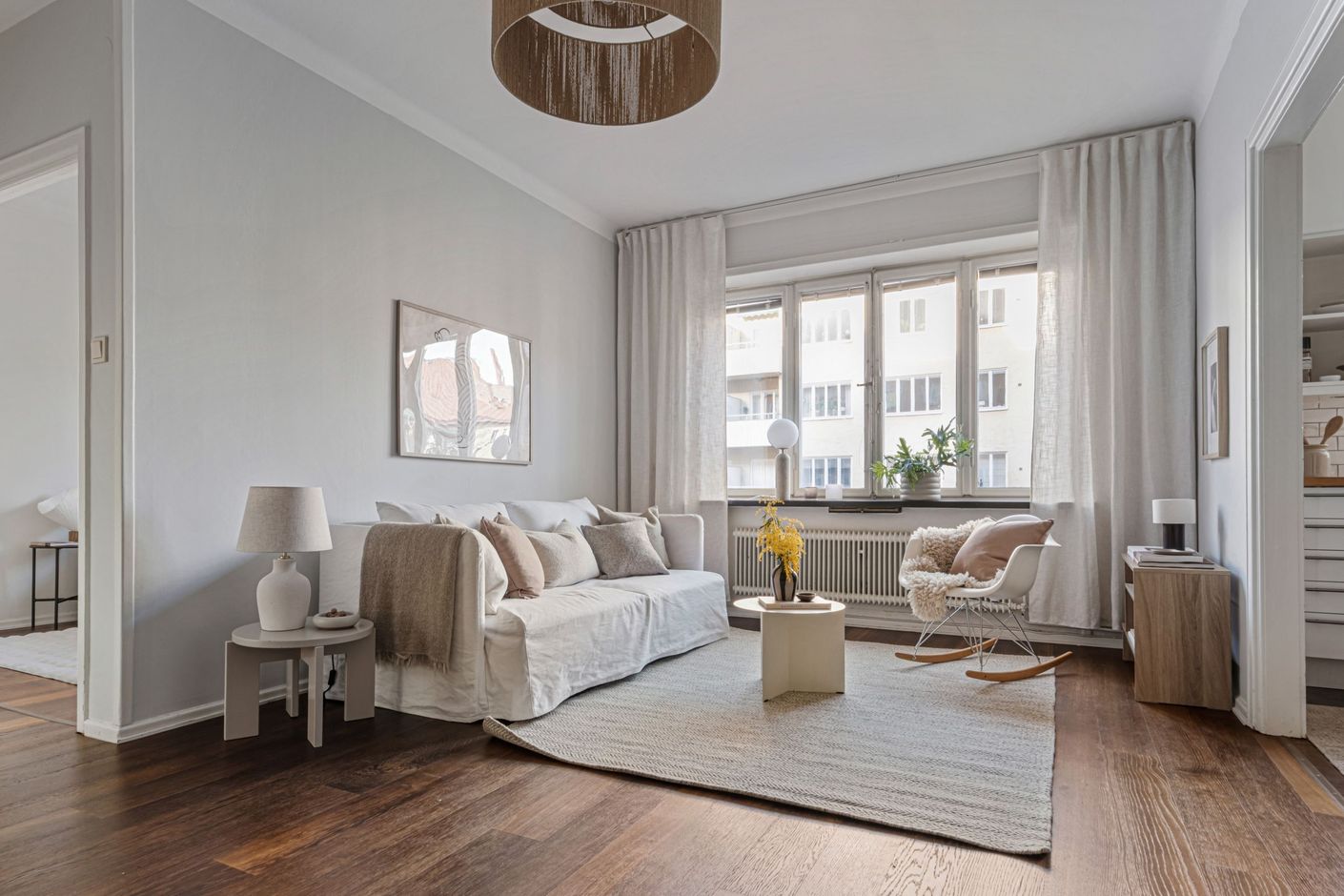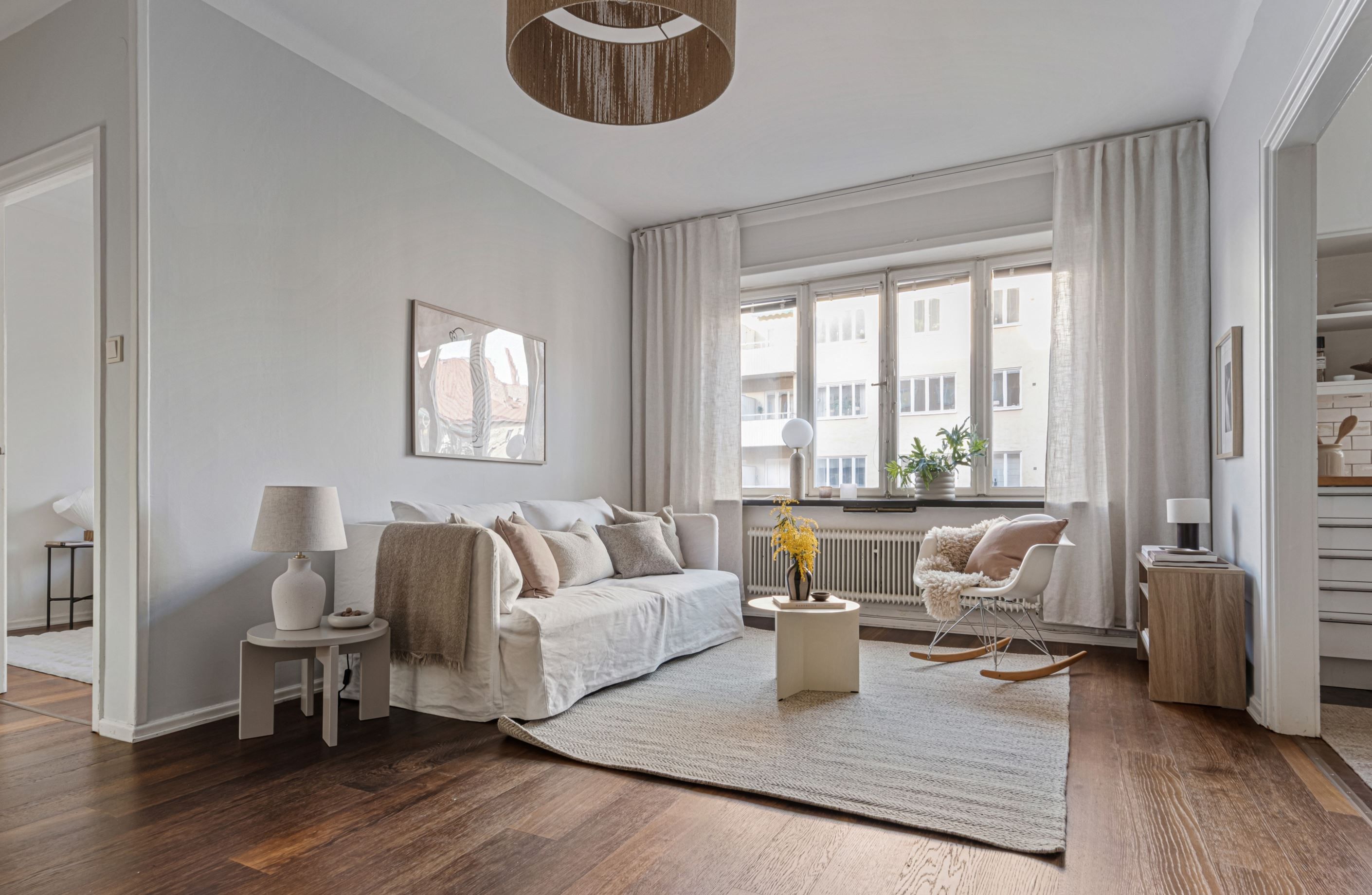 Den öppna planlösningen mellan kök och vardagsrum skapar en generös och social yta, perfekt för både vardag och umgänge. Genomgående parkettgolv och ljusa ytskikt ger bostaden en harmonisk bas som är lätt att forma efter egen stil.