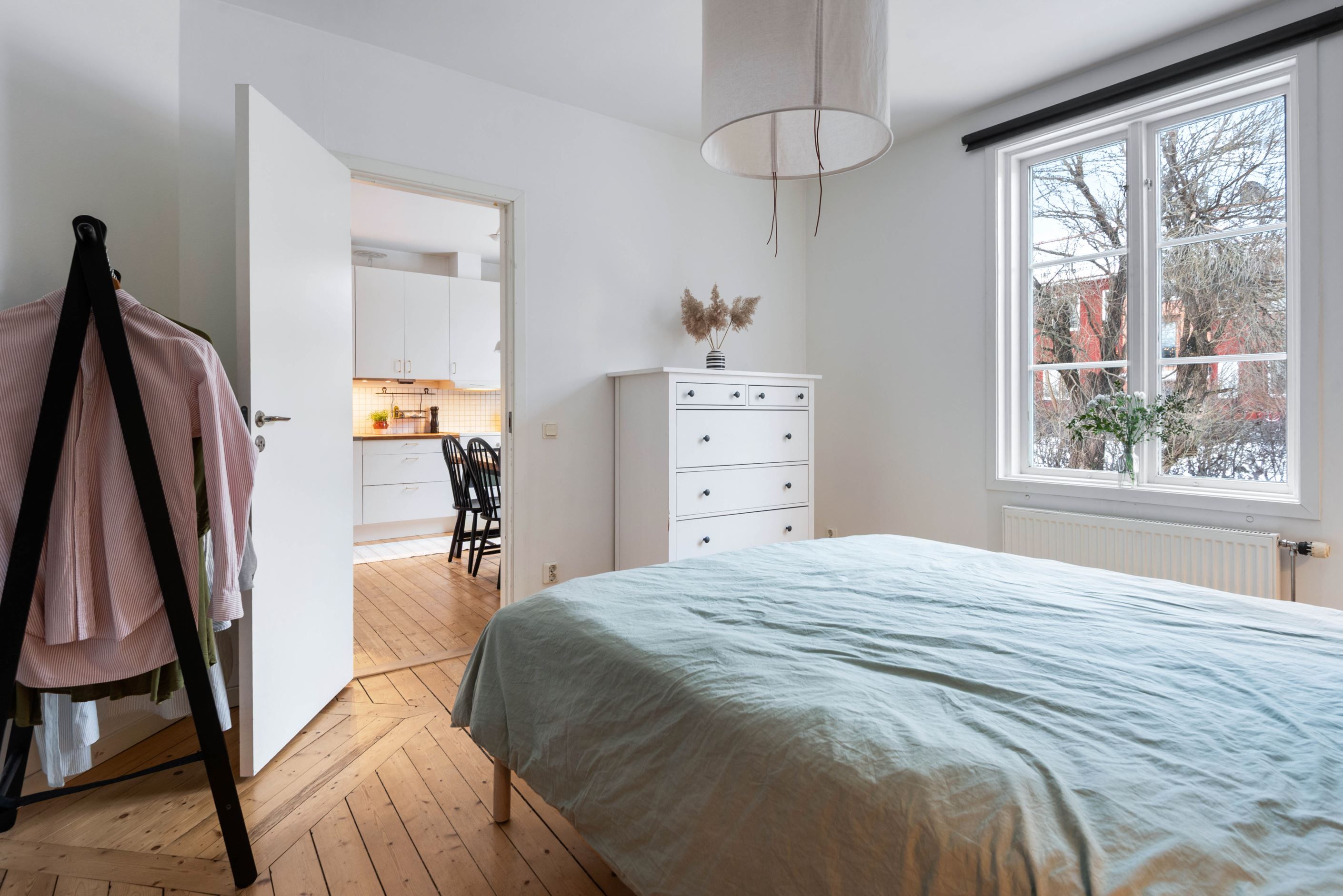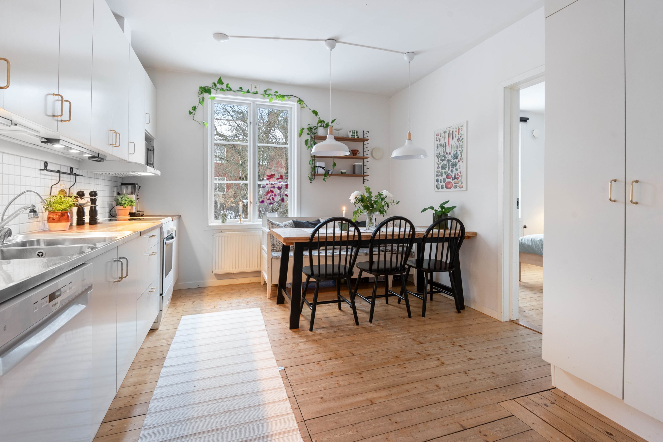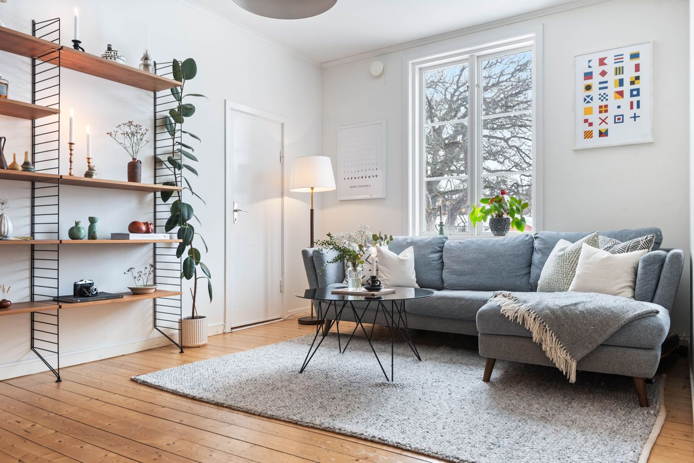 Genomgående plankgolv i hela lägenheten, spröjsade fönster samt tidstypiska detaljer.
