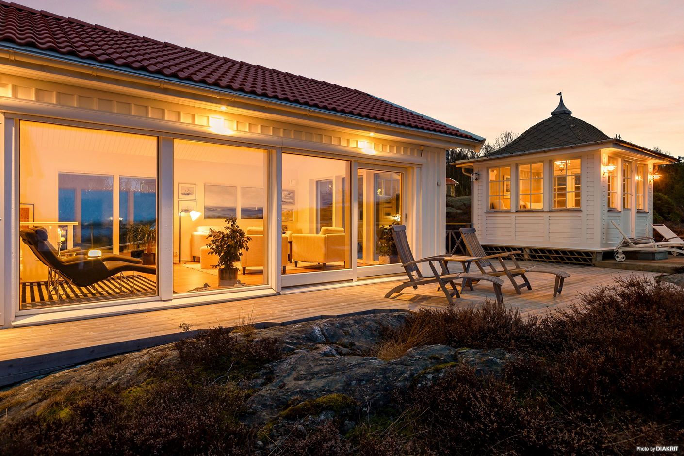 Bostaden är uppförd 2001 och erbjuder generösa sociala ytor med högt i tak och stora fönsterpartier som släpper in rikligt med ljus och suddar ut gränsen mellan inne och ute. Vardagsrum och sällskapsytor ligger i naturlig anslutning till varandra och skapar en perfekt miljö för både vardag och umgänge. Från flera delar av huset njuter ni av den vackra havsutsikten som förändras med årstiderna.