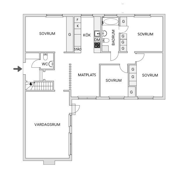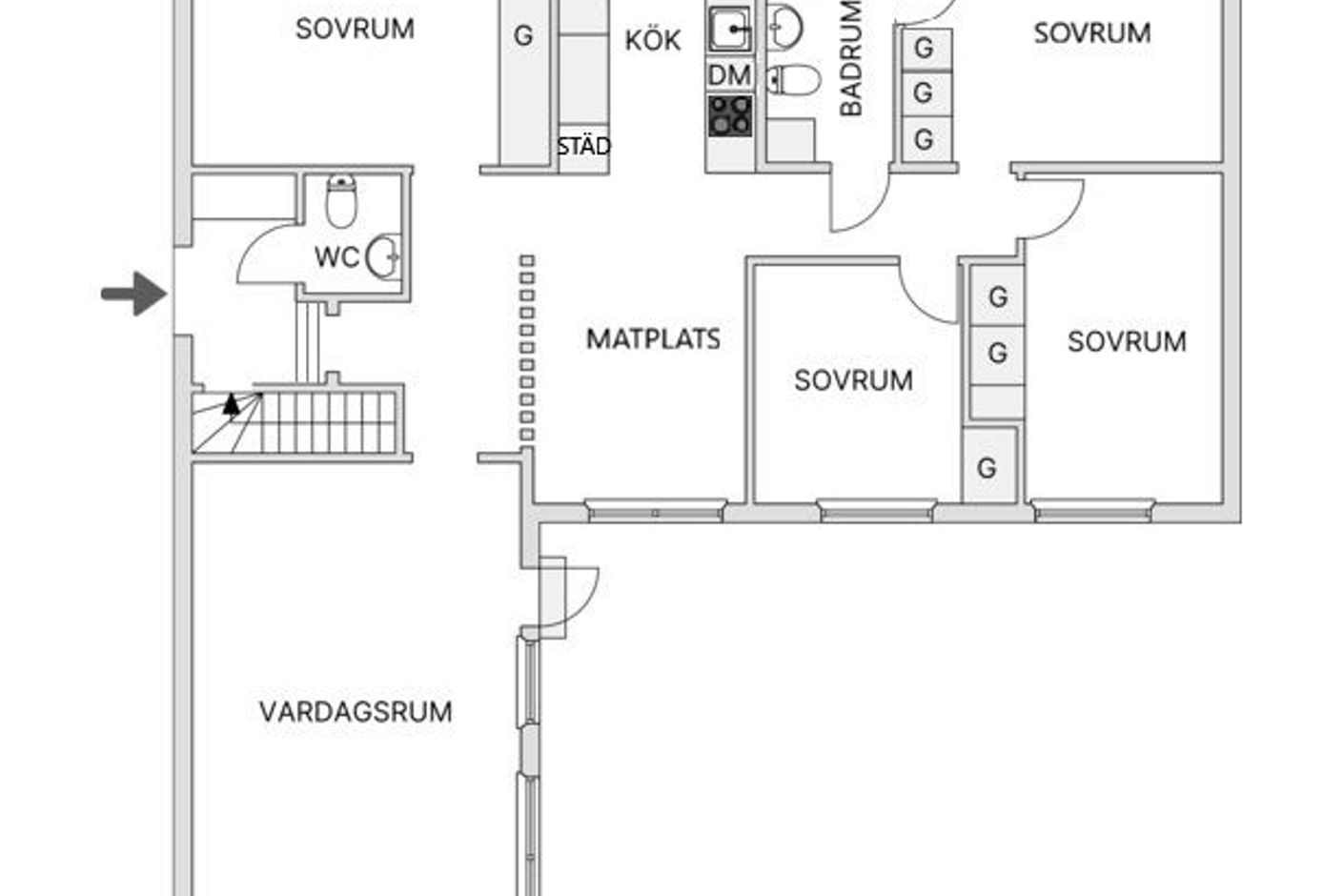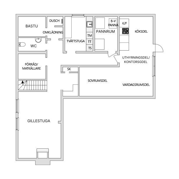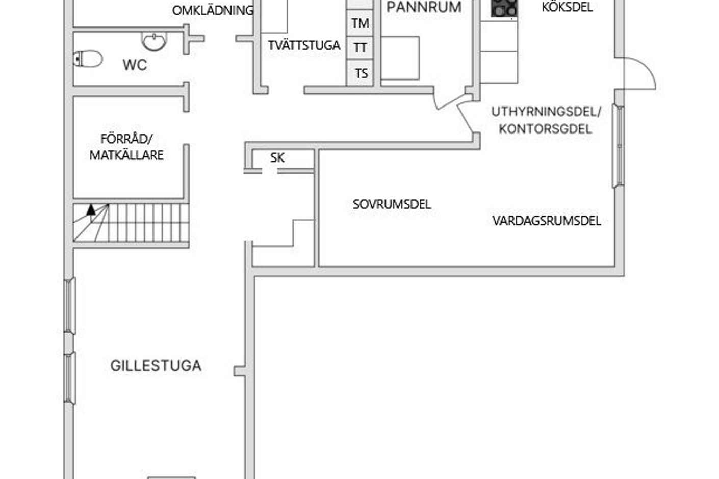 Invändigt hittar vi ett stort vardagsrum med halvt öppen planlösning mot matplats och kök, samt 4 sovrum och ett badrum på övre plan. I källarplanet finns en gillestuga/allrum, perfekt för tonårshänget, samt bastu/relaxdel, tvättstuga, pannrum och uthyrningsdelen med separat ingång från sidan av huset.