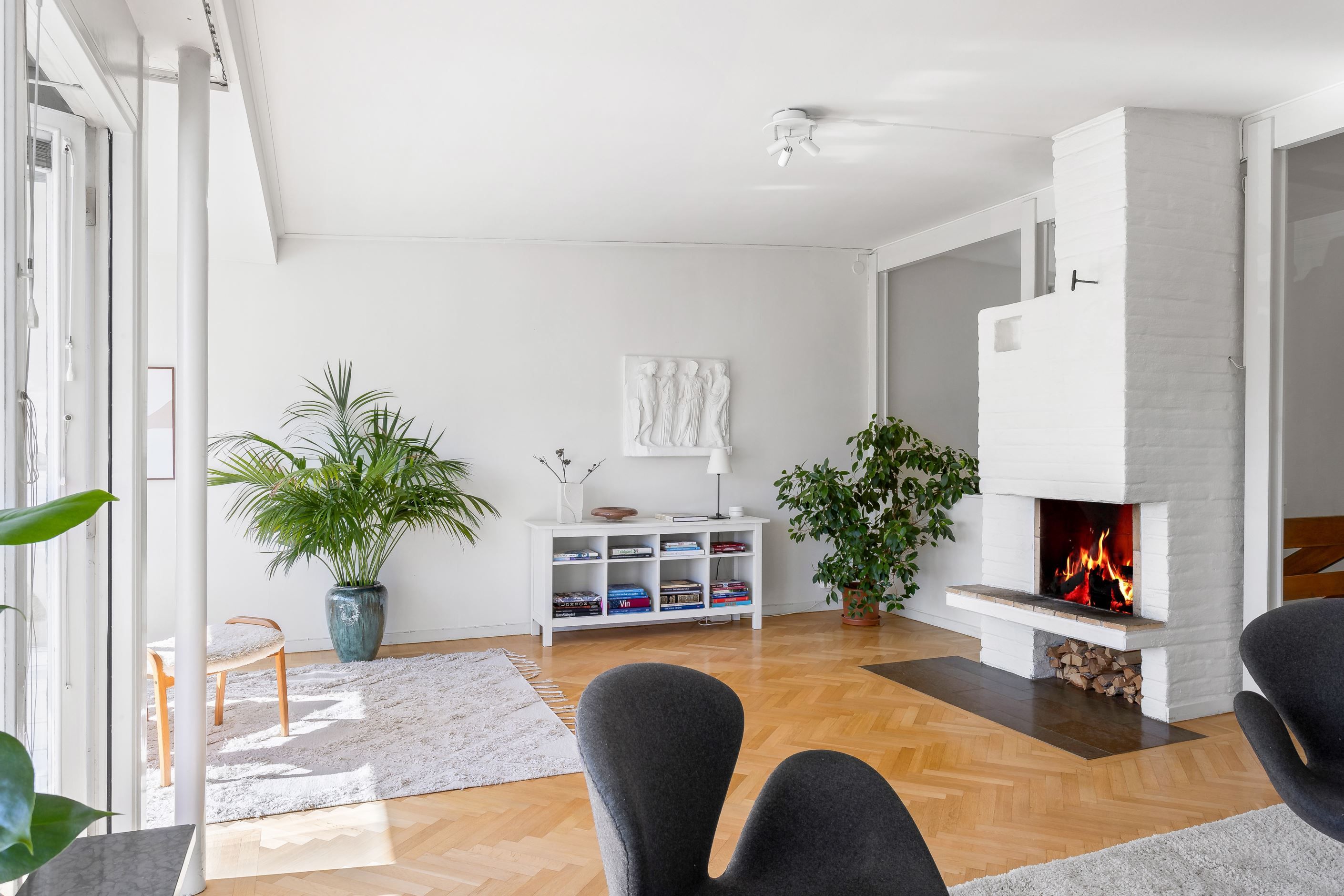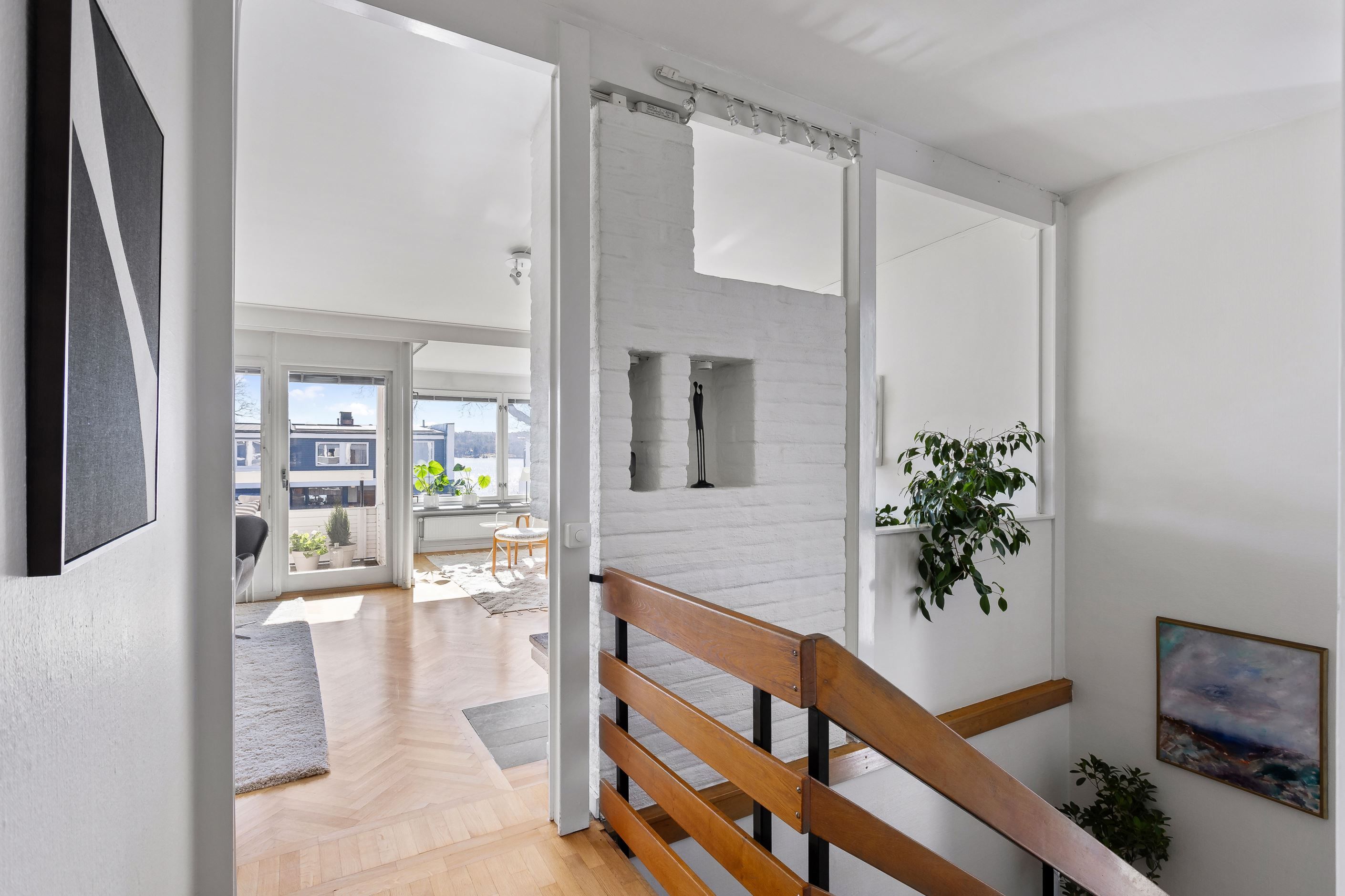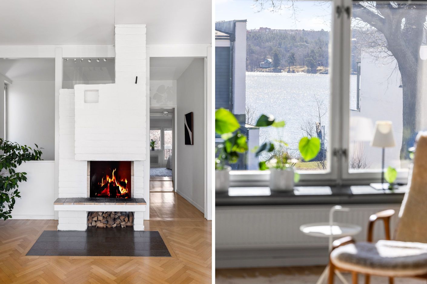 Huset har mycket trevlig planlösning, med ljusa rum och luftiga sällskapsytor. ÖVERVÅNING, som nås från entréhall via öppen trappa i ek. Storslagen sällskapsyta med fin sjöutsikt från såväl burspråk som från generös uteplats som nås via glasad dörr. Sällskapsdelen har härlig rymd tack vare generös takhöjd och öppen luftig atmosfär samt den glasade väggen med funkisfönster. Här finns gott om plats för soffgruppen och TV-hörna. Den stilfulla öppna spisen utgör en fin byggårsdetalj. Två bra sovrum med fri vy mot grönskande park. Garderobsväggar för förvaring. Genomgående ekgolv. Helkaklat badrum med hörnbadkar med takfönster.